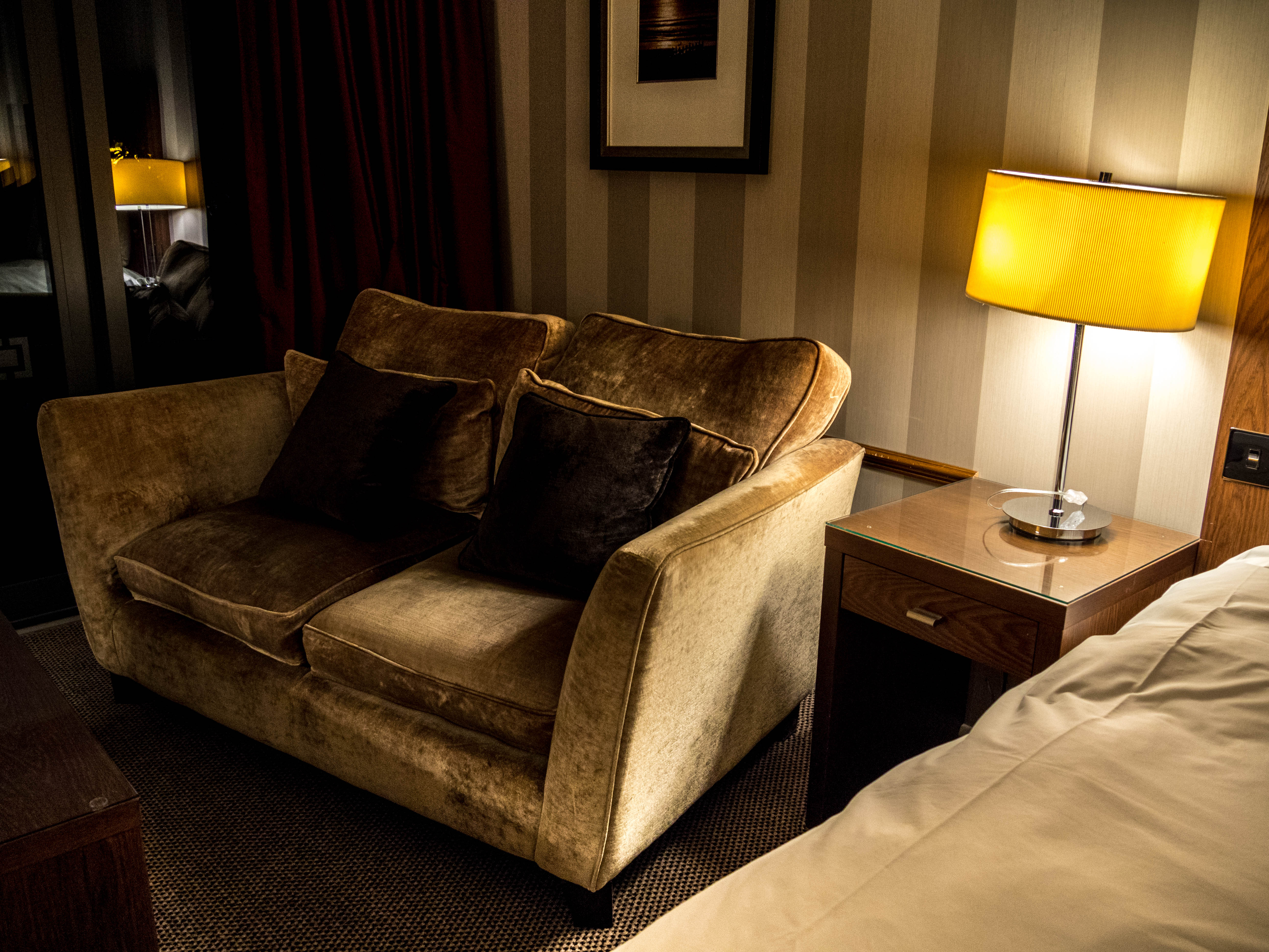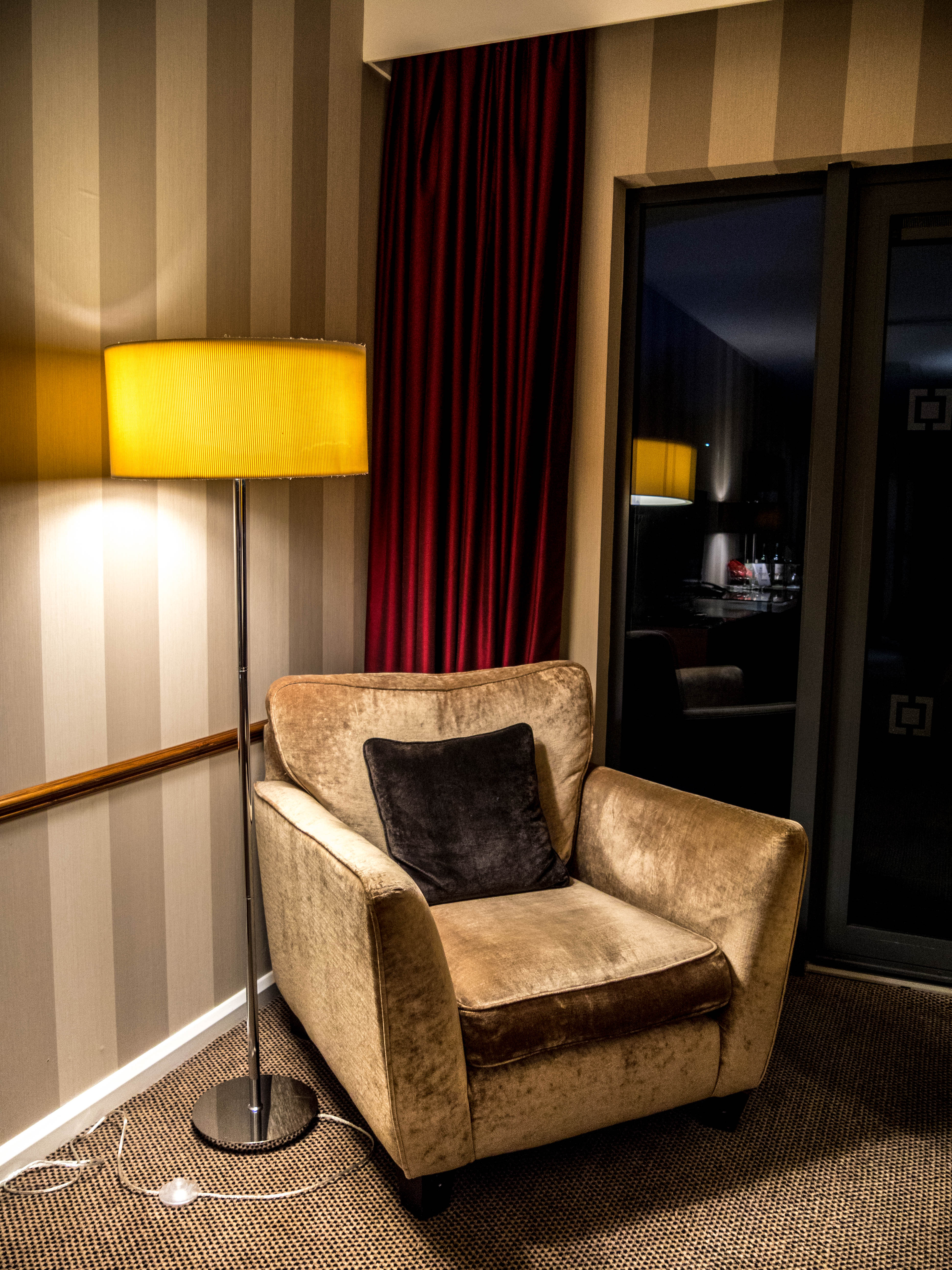 J’ai donc hérité d’une chambre avec un lit king size à l’américaine d’un moelleux que je n’avais plus vu depuis Bruges avec son petit coin salon équipé de fauteuil et sofa qu’on a vraiment du mal à quitter (je m’y suis installée tous les jours pour travailler avant le repas de soir) et d’une très grande salle de bain.