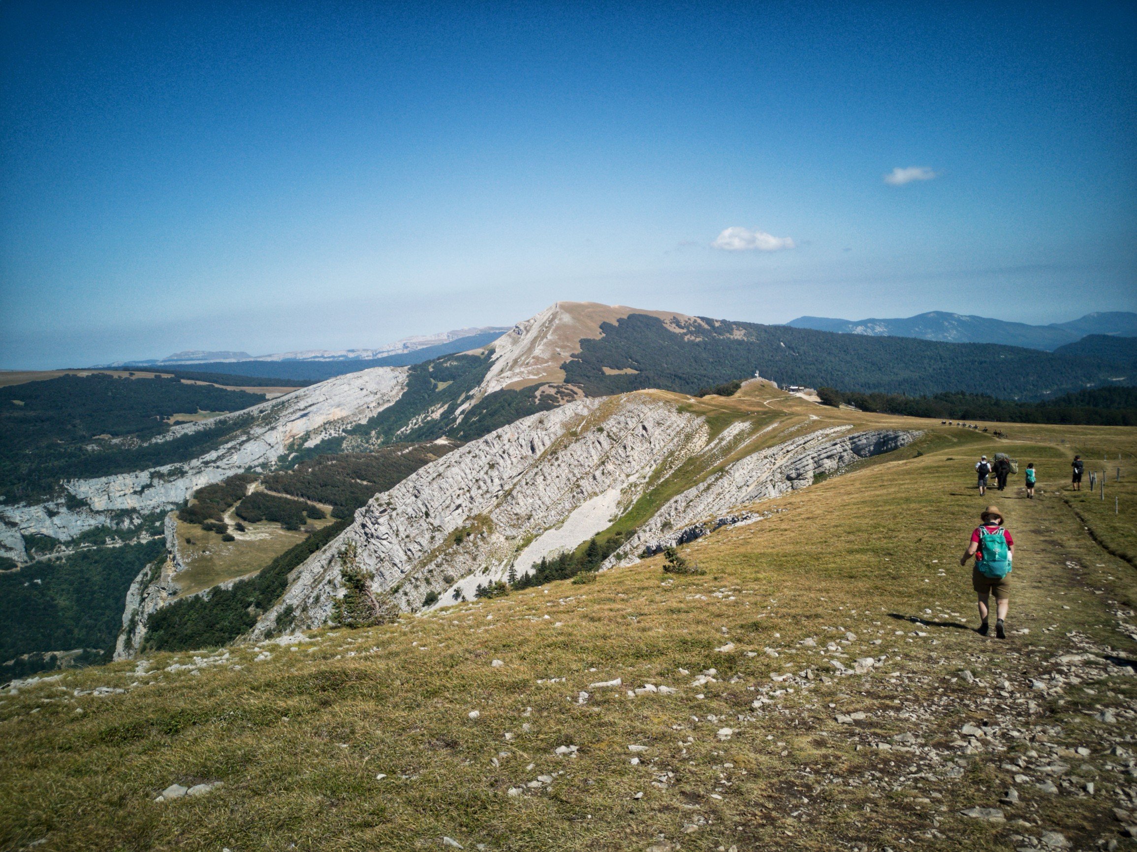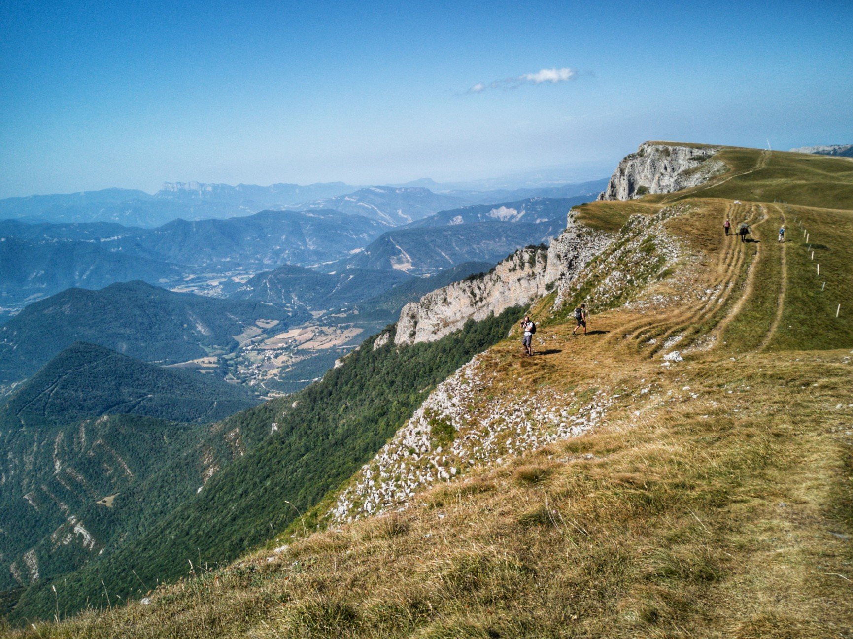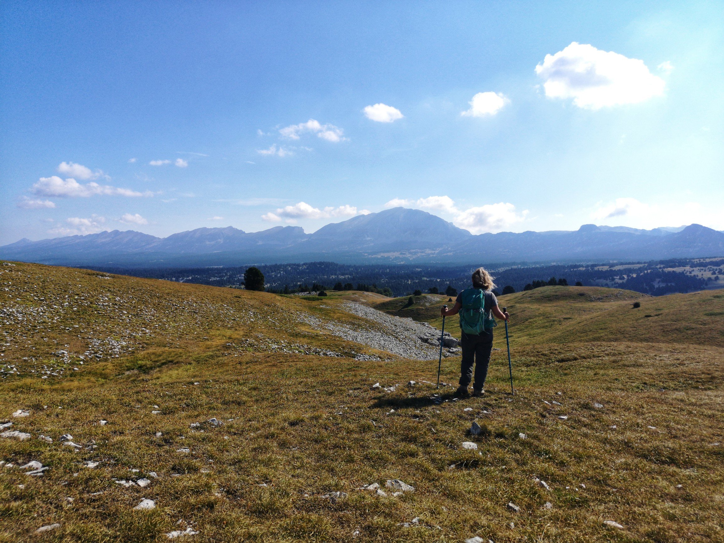 Notre royal petit-déjeuner (pain, confitures, pâte à tartiner chocolat-caramel-noisettes maison et plein de fruits) avalé, nous rangeons les tentes et le matériel. Rien, sauf l’herbe un peu aplatie, ne doit signaler que nous sommes venus y passer la nuit. C’est parti pour rejoindre la Station de ski du Col de Rousset, une randonnée plutôt facile sur terrain assez plat, mais très caillouteux. Pendant la première partie de la rando, le paysage est assez aride. Beaucoup plus sec que lors du parcours de la veille. Sans vraiment le savoir, nous sommes passés de l’Isère à la Drôme ! Depuis les hauteurs des Hauts Plateaux, le paysage est époustouflant et le regard plonge dans les gorges et vallées, tandis qu’à l’horizon, des couches de montagnes bleues se superposent. C’est beau, grandiose, même. Le ciel m’apparaît immense et l’espace, carrément infini. Une vraie incitation à aller parcourir ces sentiers. C’est aussi assez venteux et je presse le pas pour rejoindre le groupe qui est bien à l’avant et vers onze heures, nous voilà arrivé aux télésièges de la station de ski du Col de Rousset.
