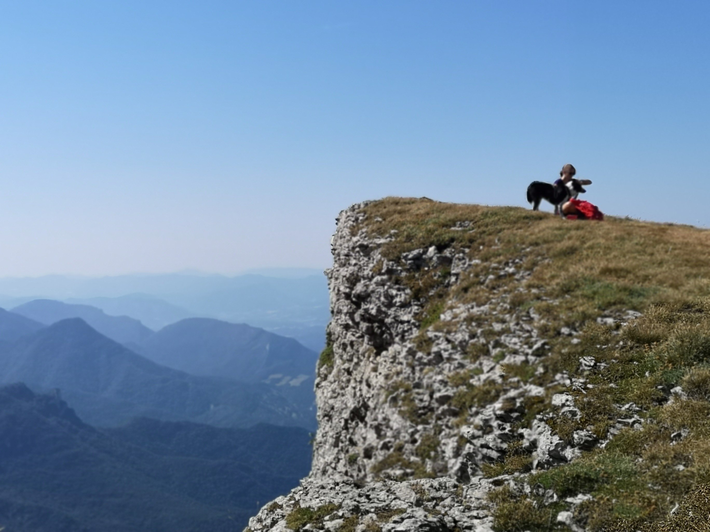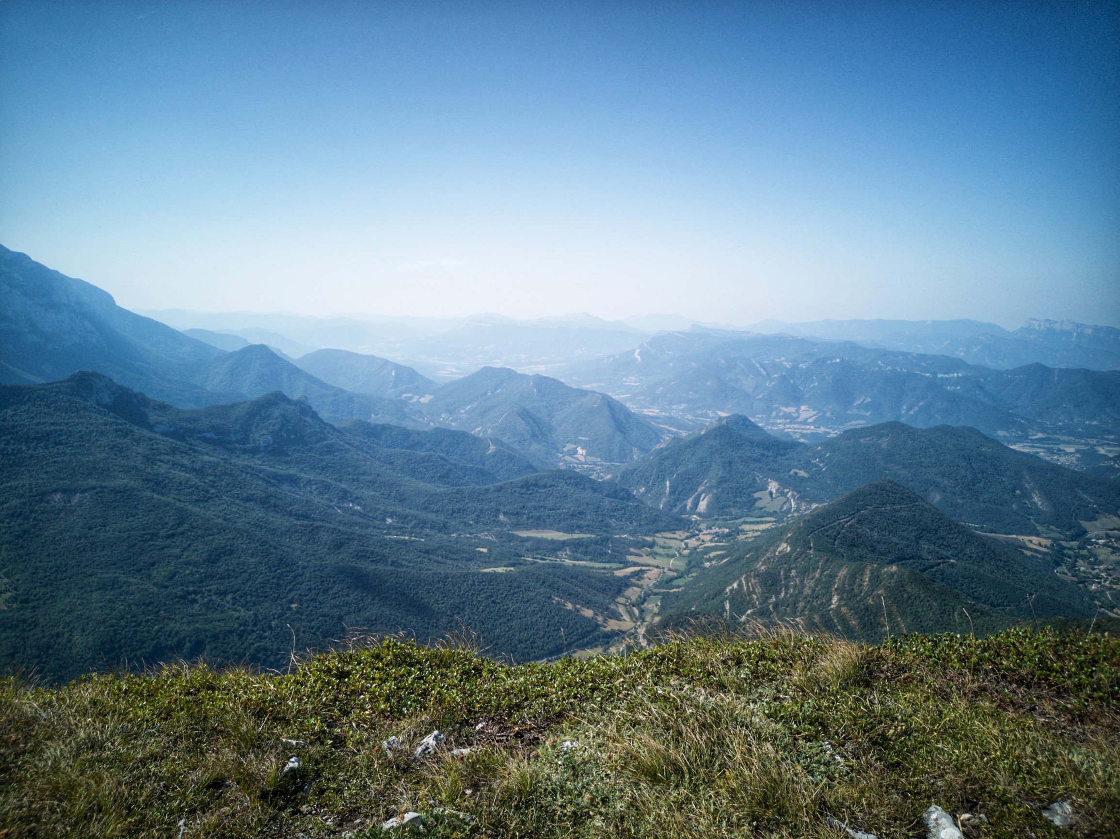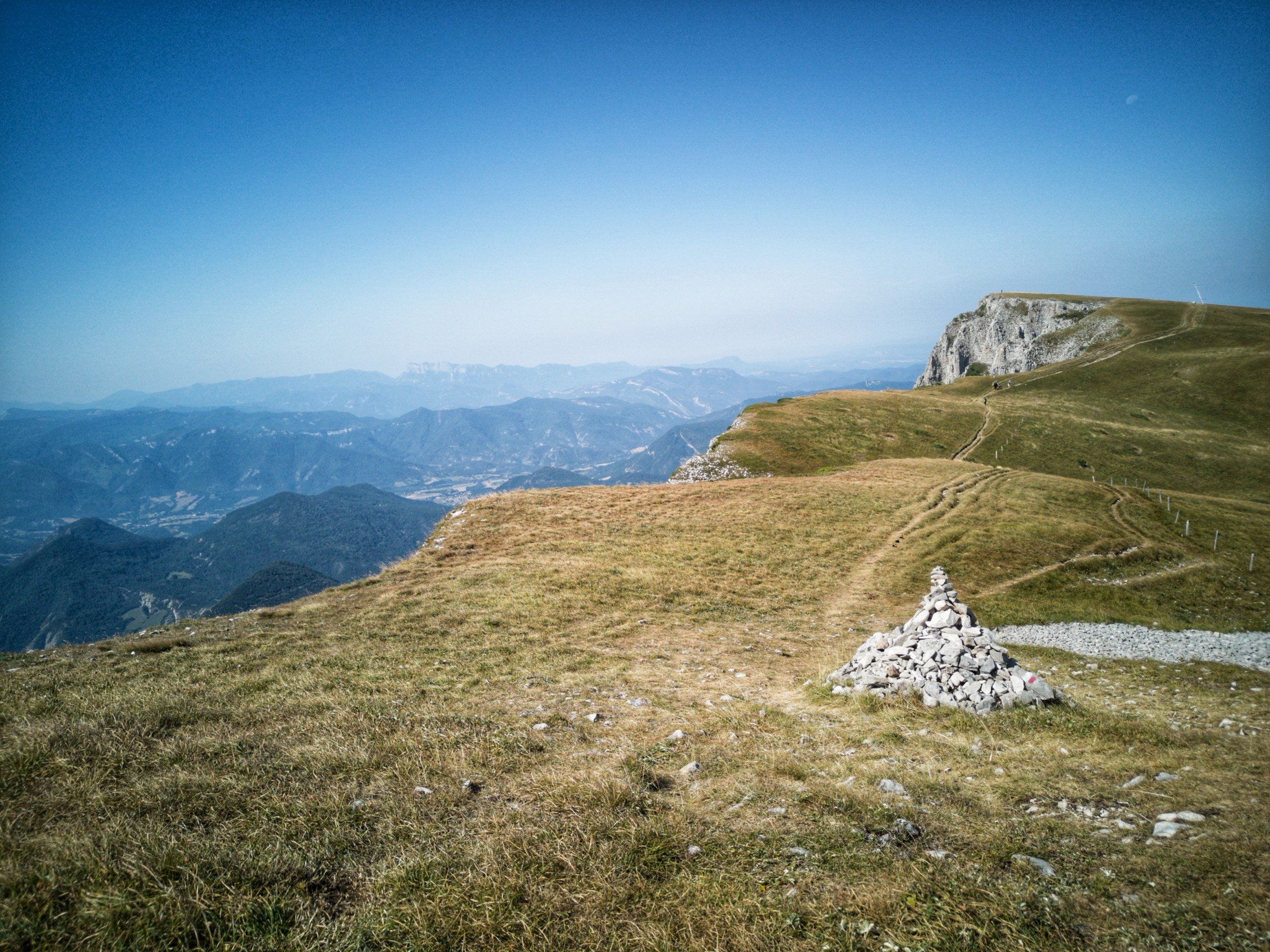 Notre royal petit-déjeuner (pain, confitures, pâte à tartiner chocolat-caramel-noisettes maison et plein de fruits) avalé, nous rangeons les tentes et le matériel. Rien, sauf l’herbe un peu aplatie, ne doit signaler que nous sommes venus y passer la nuit. C’est parti pour rejoindre la Station de ski du Col de Rousset, une randonnée plutôt facile sur terrain assez plat, mais très caillouteux. Pendant la première partie de la rando, le paysage est assez aride. Beaucoup plus sec que lors du parcours de la veille. Sans vraiment le savoir, nous sommes passés de l’Isère à la Drôme ! Depuis les hauteurs des Hauts Plateaux, le paysage est époustouflant et le regard plonge dans les gorges et vallées, tandis qu’à l’horizon, des couches de montagnes bleues se superposent. C’est beau, grandiose, même. Le ciel m’apparaît immense et l’espace, carrément infini. Une vraie incitation à aller parcourir ces sentiers. C’est aussi assez venteux et je presse le pas pour rejoindre le groupe qui est bien à l’avant et vers onze heures, nous voilà arrivé aux télésièges de la station de ski du Col de Rousset.