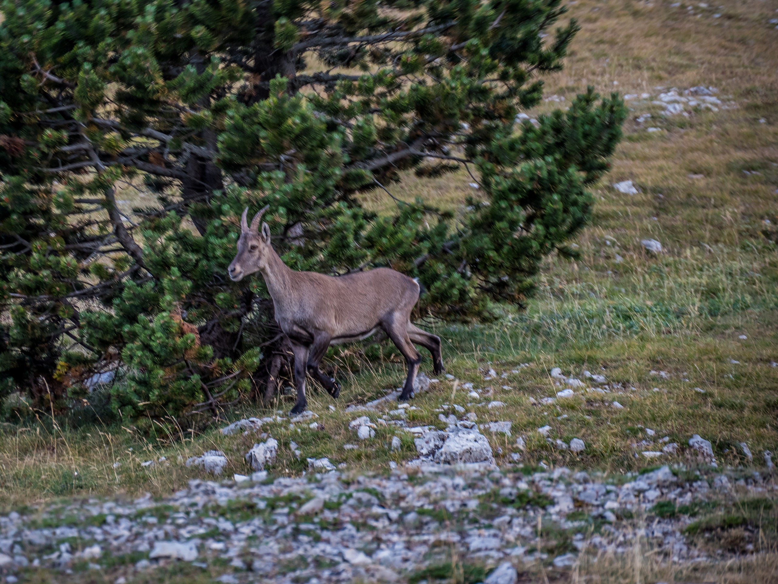 C’est tout naturellement, au lever du soleil, que nous nous réveillons. Il pointe le bout de son nez par-dessus les montagnes et commence à inonder le plateau de lumière. Certains s’extirpent des tentes, d’autres comme Pauline et Sophie émergent de dessous les bâches qui les ont protégées pendant la nuit. C’est plutôt comique ! Pendant que nos guides préparent le petit-déjeuner, je vais me débarbouiller et remplir ma bouteille d’eau à la source. C’est justement à ce moment-là qu’un bouquetin a décidé de faire son apparition ! Et on dirait bien qu’il est habitué à voir des humains, il n’a pas l’air effrayé par notre attention. Il broute tranquillement quelques brins d’herbe et se laisse admirer avant de retourner vaquer à sa promenade.