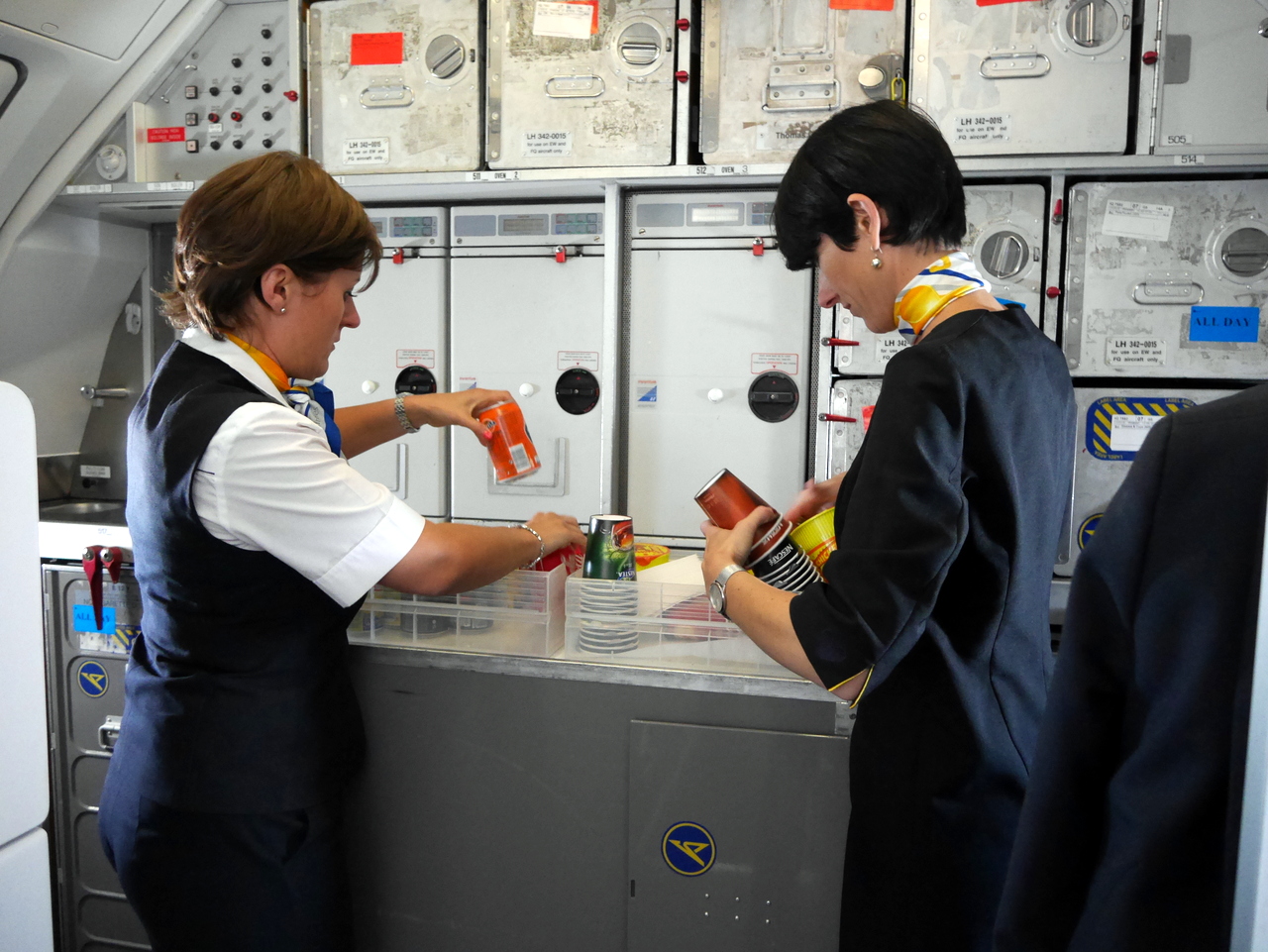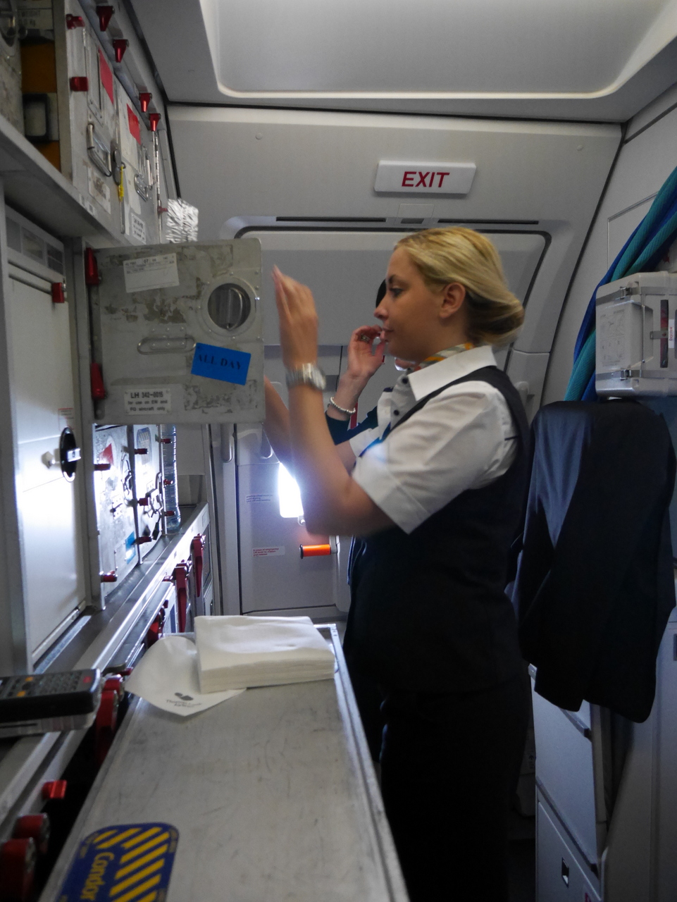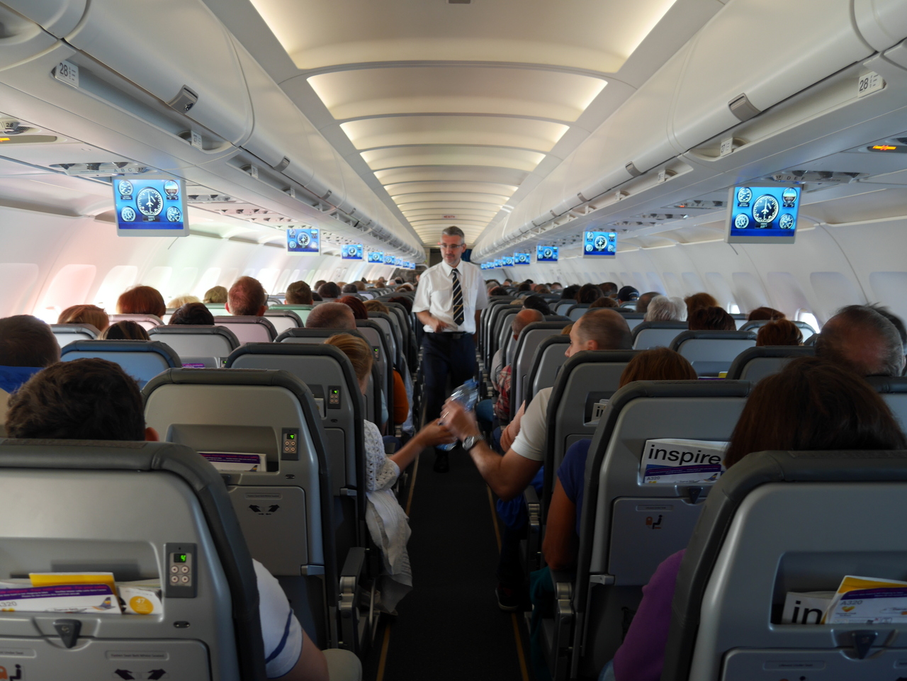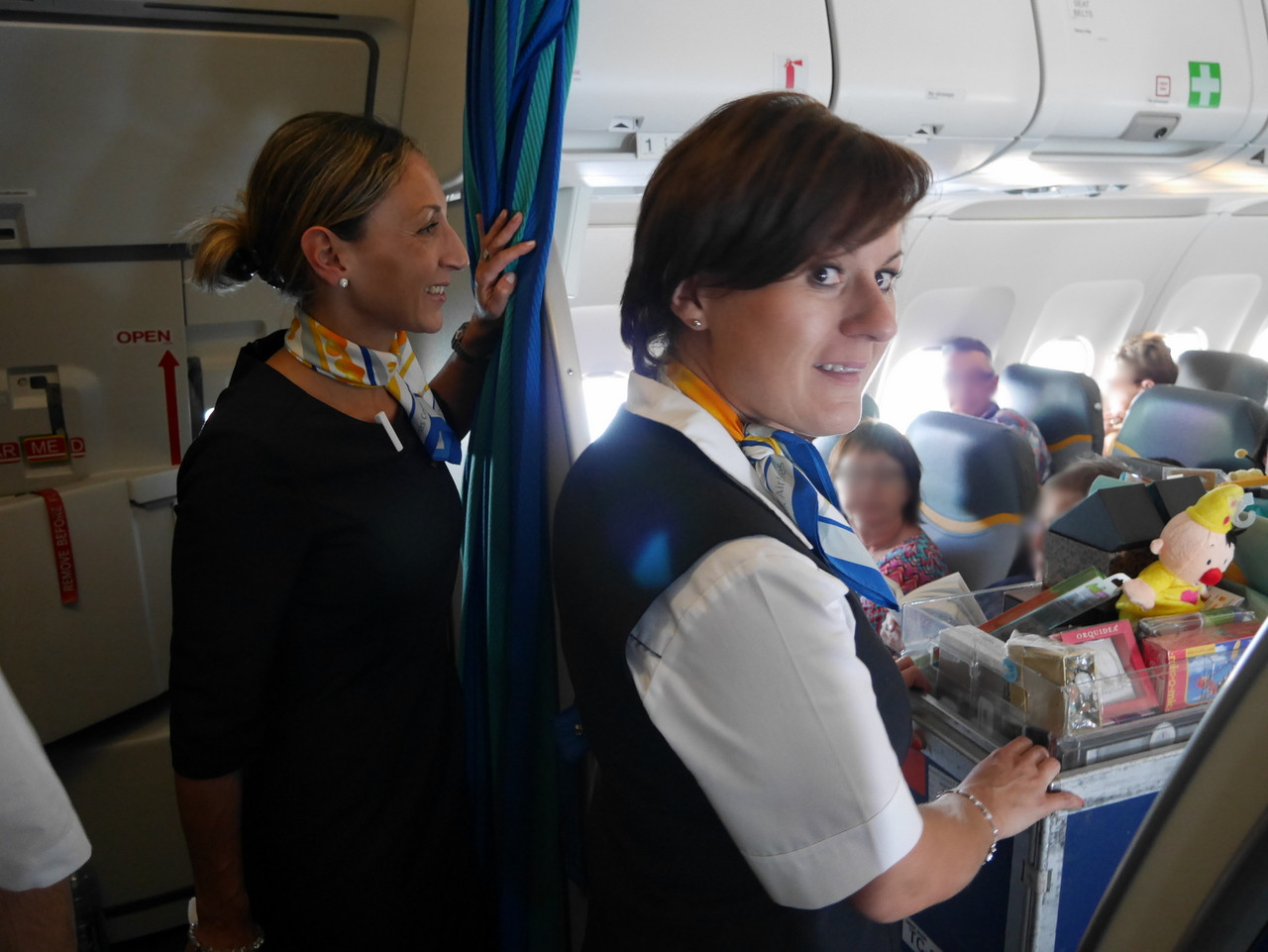 Une fois la phase de décollage terminée et le signal d’attachement des ceintures éteint, c’est le branle-bas de combat : le service boisson/petit-déjeuner va commencer. C’est ainsi pour tout les vols. Premièrement, on sert les passagers, deuxièmement, on parcourt l’allée avec le chariot de produits duty-free. Et si le vol est plus long, on repasse avec un service boisson. Tout est exécuté avec rapidité, le chariot se remplit de boissons diverses et je vais rejoindre l’ « équipe de devant ». Je n’avais pas vraiment remarqué à l’embarquement, mais cet Airbus A320 n’a qu’une seule classe !  La seule différence entre les passagers, c’est entre ceux qui ont les repas et boissons compris (ou qui ont payé un forfait) et ceux qui n’en ont pas commandé.