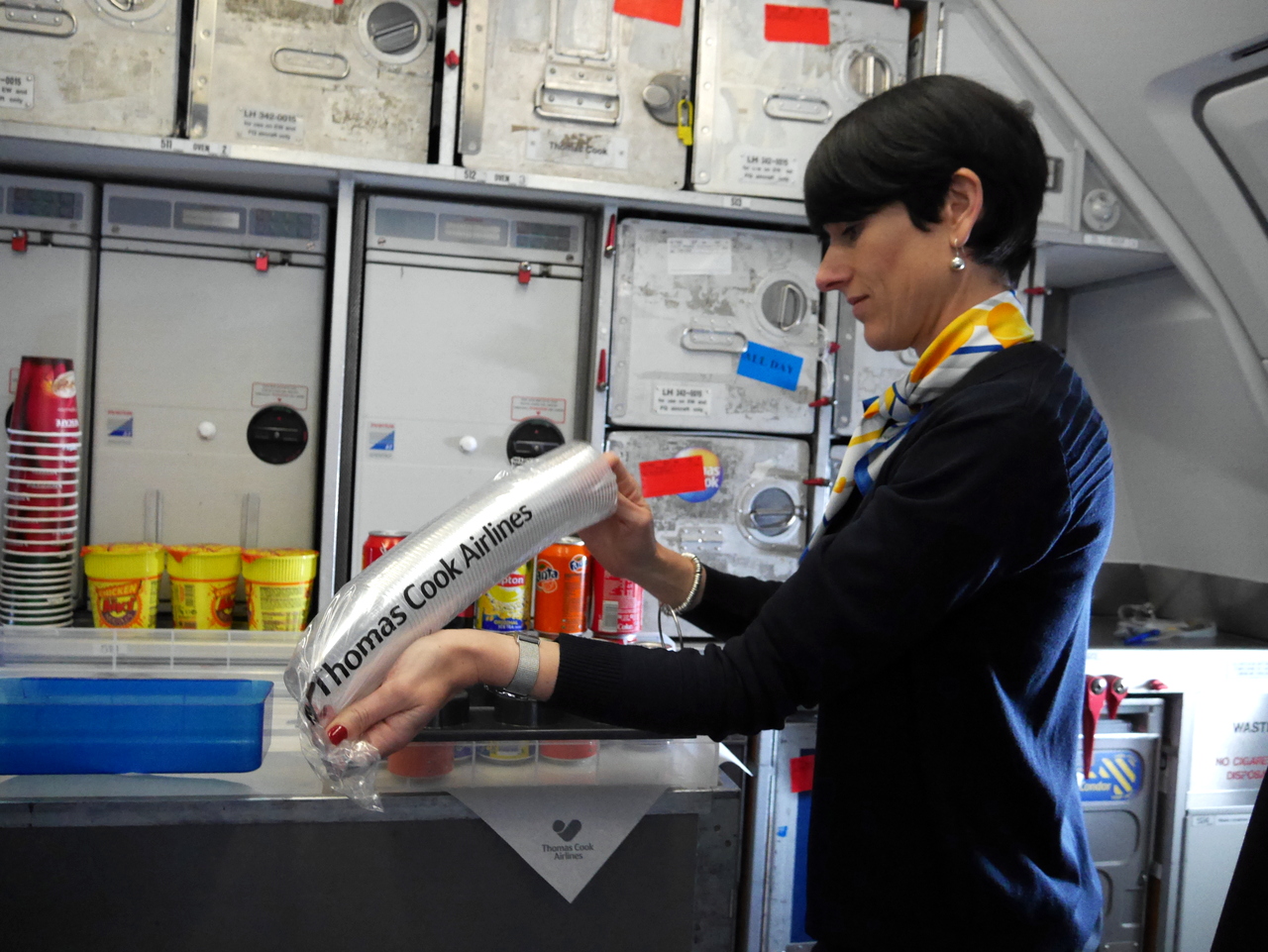 Sanglée sur mon siège « comme un pilote de Formule 1 », je sens l’accélération du moteur qui vient me presser contre la paroi. L’avion décolle et je ne suis pas au siège 10A qui m’était attribué mais bien à l’arrière de l’avion en partance pour Zakynthos, assise dans la cuisine, avec une partie des hôtesses de Thomas Cook Airlines car ce dimanche, je faisais un peu partie de l’équipage.