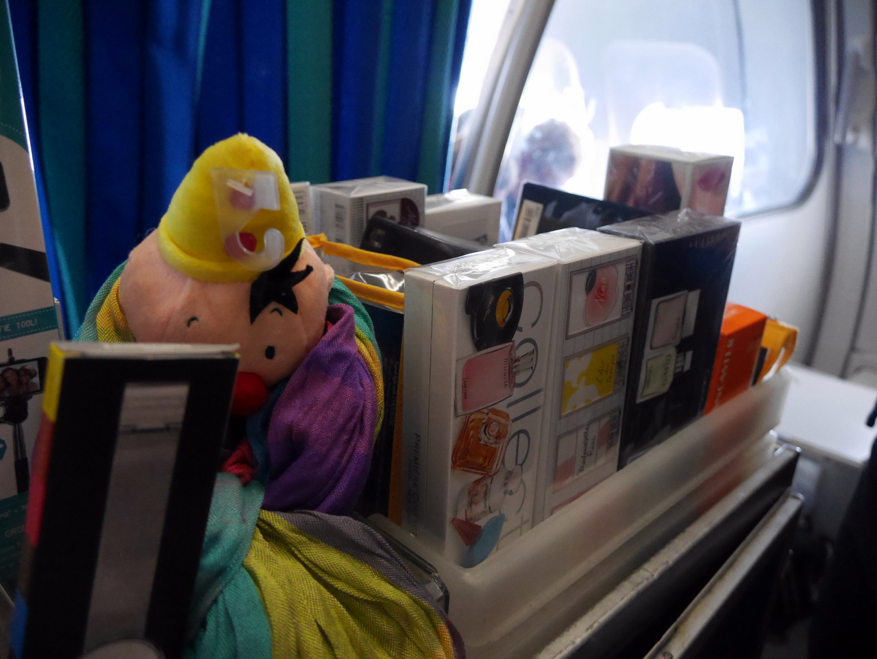 Je détaille les passagers… c’est le début de la saison, il y a pas mal de couples, de retraités, quelques bébés… Tout est calme, comme un vol très tôt le matin peut l’être. Pendant qu’on prépare le chariot duty-free, je papote avec l’équipage. Eux aussi sont curieux ! C’est la première fois qu’ils ont une blogueuse intégrée à leur équipe et ils se posent des questions. Sur comment je vais écrire, sur ce que je suis autorisée à publier (tout, sauf le visage des passagers). Je les sens un peu inquiets sur ce que je pourrais écrire. J’essaie de les rassurer, de leur dire de continuer comme d’habitude. Finalement, le chariot duty-free est près et c’est Stéphanie et Sophie qui vont le balader dans la rangée. Je regarde l’engin… il n’est pas grand mais il y a une quantité impressionnante choses dedans : du parfum au jouet en passant par les montres ou les foulards.