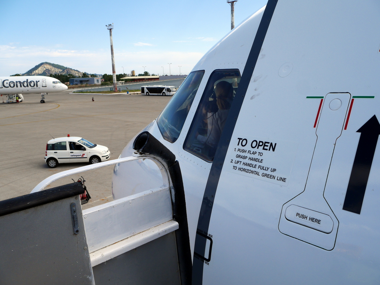 A force de discuter, le temps passe et la phase d’atterrissage est amorcée. Je rejoins mon siège. Derrière le hublot, le bleu de la Méditerranée et bientôt, la silhouette de Zakynthos. Je vois quelques falaises, des collines avec des oliviers, des plages, un alignement d’hôtels-clubs. Zakynthos a l’air calme et douce. Et la porte s’ouvre sur un autre monde. Là, tout se fait très vite! En 10 minutes, tous les passagers ont débarqué et le personnel de nettoyage se met à l’œuvre. Le Steward discute avec le personnel de l’aéroport puis m’invite à me rendre dans le cockpit où la commandante et son second vérifient que tout l’équipement fonctionne, la routine avant et après chaque vol… C’est la première fois que je me trouve dans un cockpit, un espace minuscule rempli de boutons. Mais comment font-ils pour s’y retrouver ? Très concentrés, je n’ose pas trop les déranger.