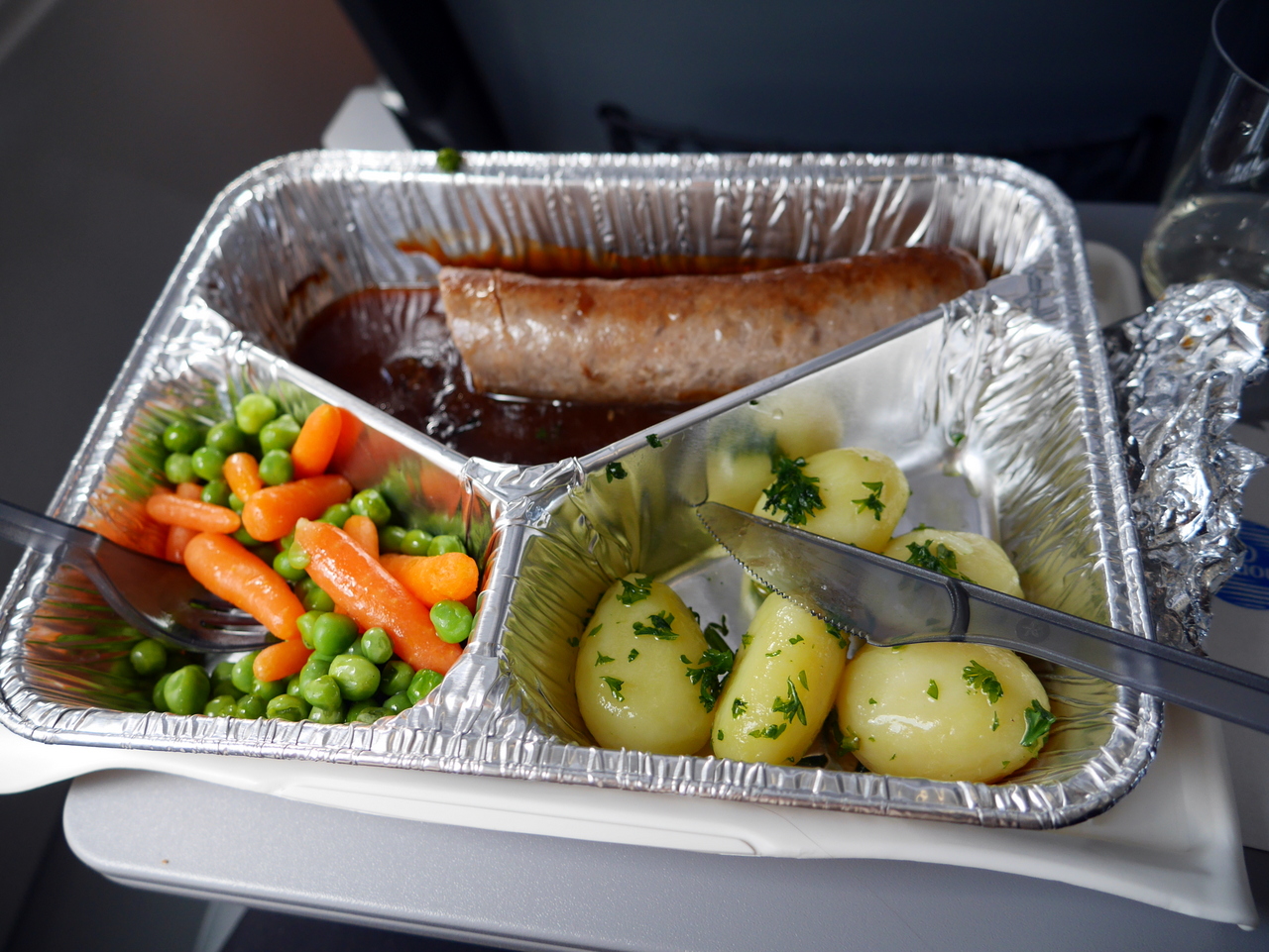 Je rejoins « l’équipe arrière » qui fait les dernières vérifications de sécurité et m’attache à nouveau à mon siège. En tout, l’escale aura duré un peu plus d’une demi-heure. Je n’arrive pas à croire que dans quelques heures, je serai de retour à Bruxelles et que ce sera seulement le début de l’après-midi! Histoire d’avoir un peu la perspective du passager, je me laisse servir le déjeuner : ce sera saucisse, petits-pois, carottes, un plat classique et réconfortant.