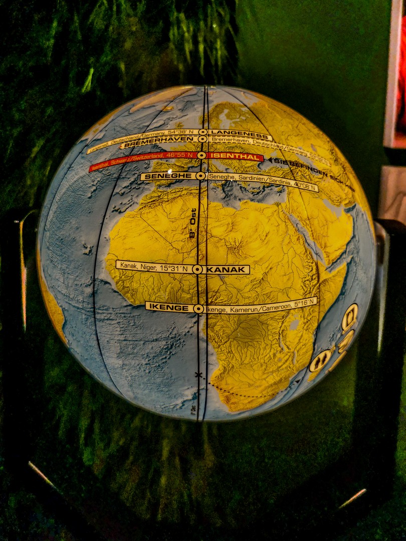 Le voyage en question, c’est celui d’Axel Werner. Mandaté par la Klimahaus, il va réaliser un tour du monde le long du 8° degré de longitude est (celui qui passe par Bremehaven) du nord au sud (avant de passer au 171° ouest et de remonter vers l’Arctique et de revenir au point de départ. Lors de son périple, il traversera des zones climatiques bien différentes : des montagnes alpines au maquis méditerranéen en passant par les déserts du Sahel, les forêts équatoriales, les îles du Pacifique sud et les deux pôles. Des environnements, des paysages et des cultures bien différents mais tous ces lieux sont reliés entre eux, outre leur localisation sur la même longitude : tous sont affectés par le changement climatique.