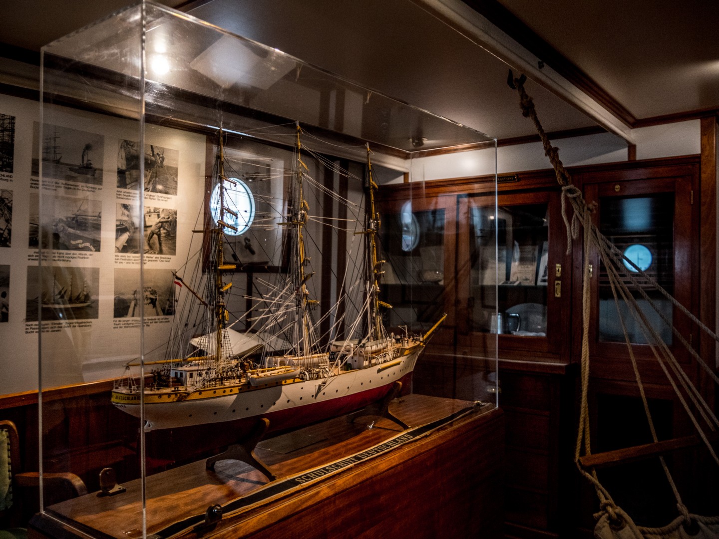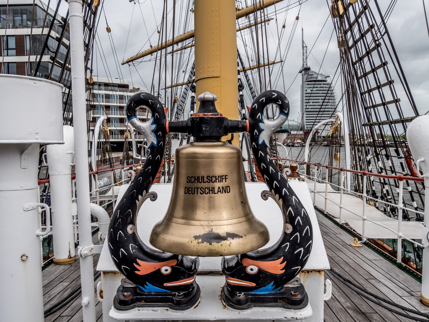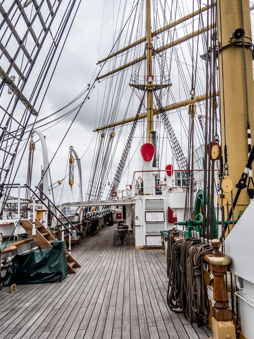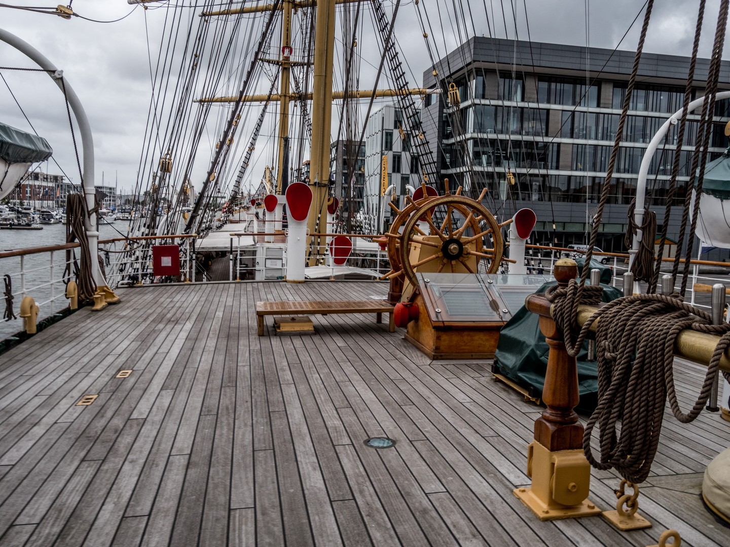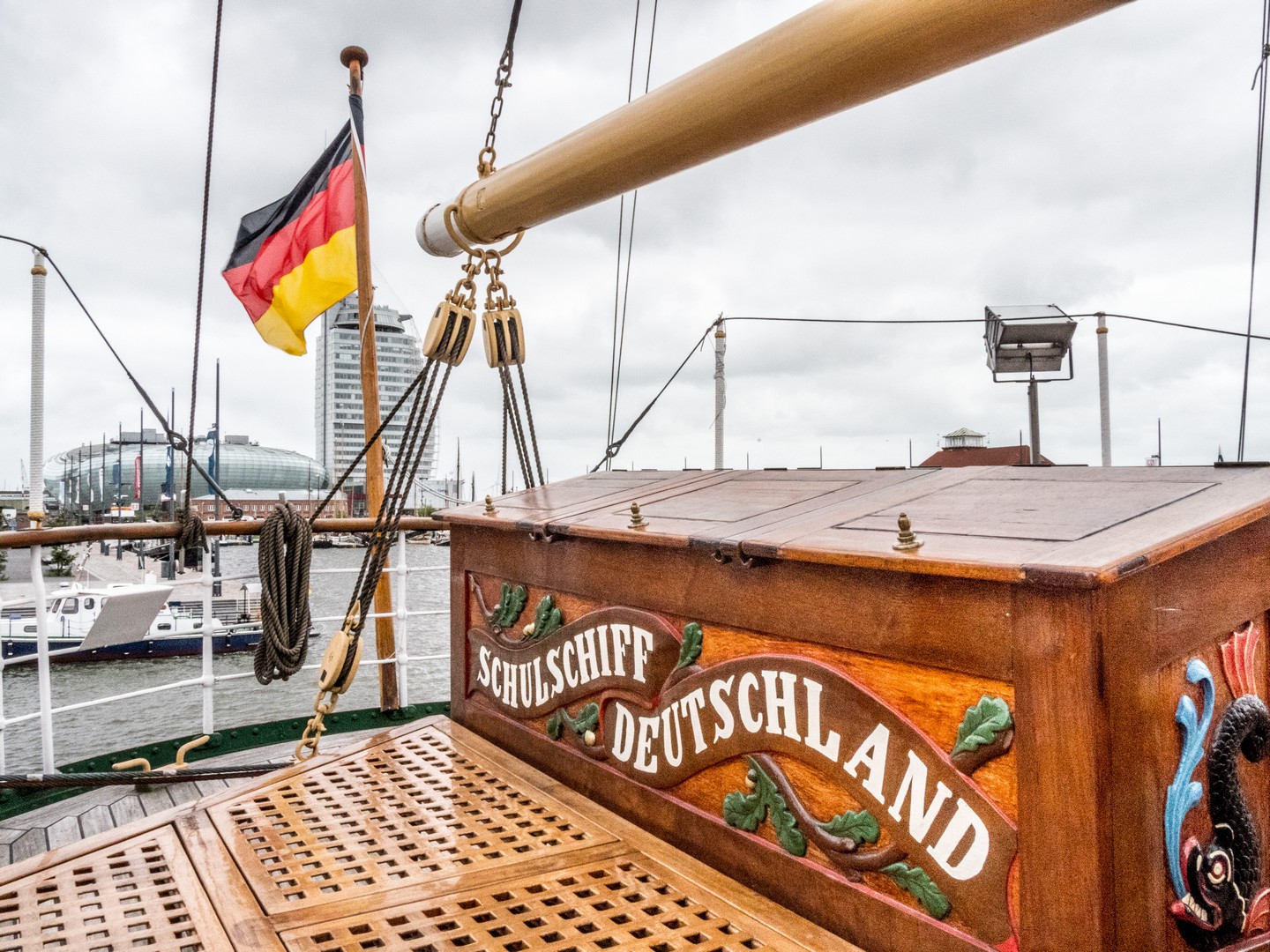 Pour terminer en beauté nos aventures maritimes, nous embarquons dans voilier amarré au Neuer Hafen et qui me faisait de l’œil depuis un moment à force de passer et de repasser devant lors de nos promenades. Ce fameux trois mats (fin comme un oiseau), c’est le bateau-école « Deutschland ». Construit en 1927, ce navire avait pour vocation de former les recrues de la marine marchande. Sa carrière aura été courte (il cesse ses activités en 1942) mais, magnifiquement préservé, il est un témoignage de la marine d’antan et enregistré dans le registre des monuments historiques du Land de Brême. Icke, le gardien du Deutschland, nous fera la visite. Il y a une petite partie muséale où les conditions d’origine du navire sont préservées : le poste de commandement, celui de l’opérateur radio, la chambre des cartes, celle du capitaine, le réfectoire etc. Mais une des particularités du Deutschland, c’est qu’on peut y dormir : des petites cabines à couchettes ont été aménagées (c’est évidemment assez minuscule et les sanitaires sont communs) mais franchement, si je reviens à Bremerhaven, j’irais dormit là. Rien ne vaut le romantisme d’un voilier !