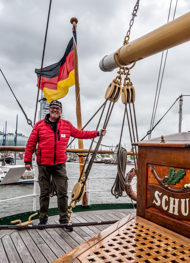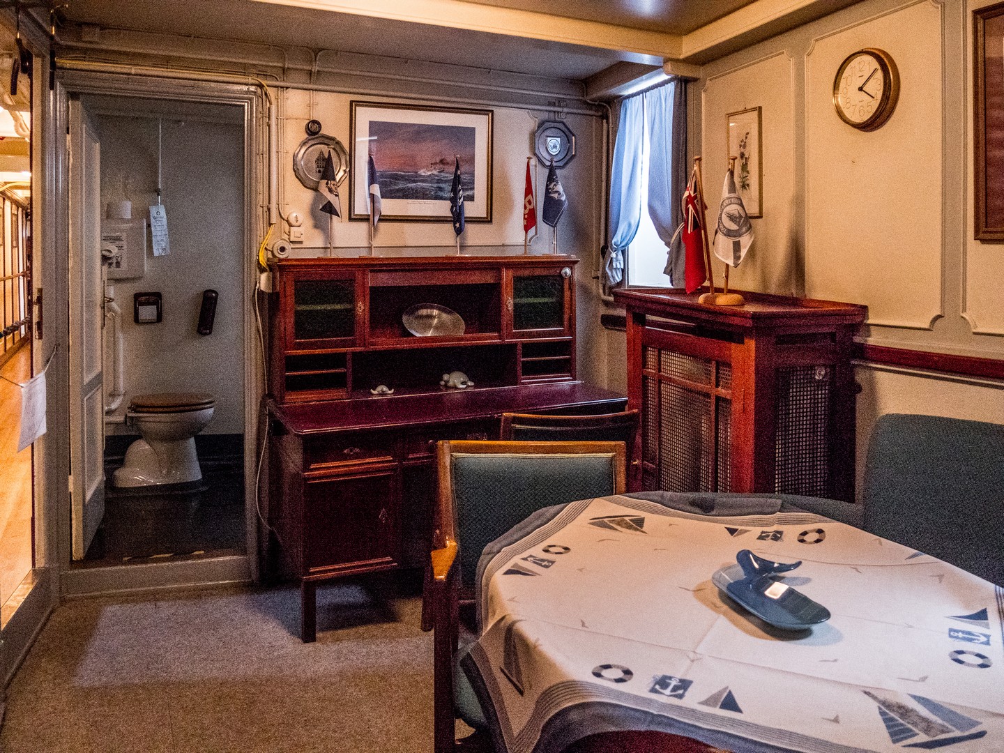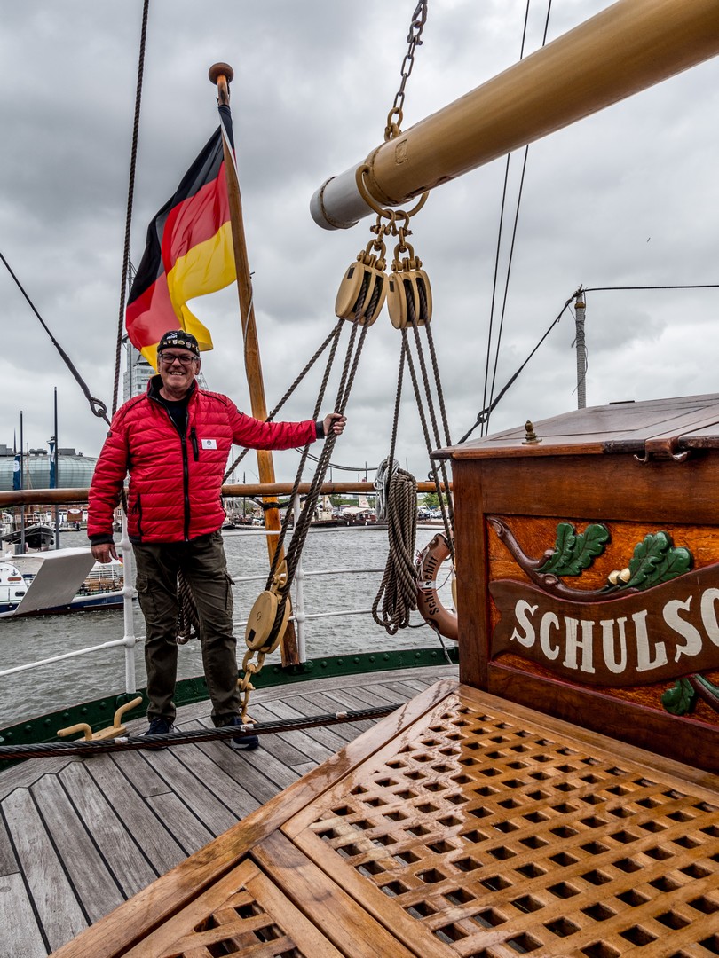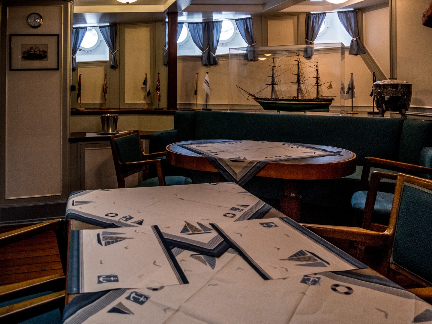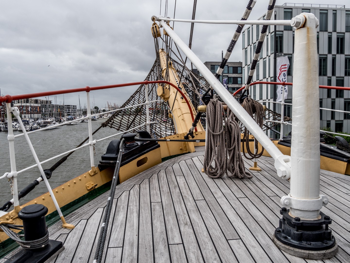 Pour terminer en beauté nos aventures maritimes, nous embarquons dans voilier amarré au Neuer Hafen et qui me faisait de l’œil depuis un moment à force de passer et de repasser devant lors de nos promenades. Ce fameux trois mats (fin comme un oiseau), c’est le bateau-école « Deutschland ». Construit en 1927, ce navire avait pour vocation de former les recrues de la marine marchande. Sa carrière aura été courte (il cesse ses activités en 1942) mais, magnifiquement préservé, il est un témoignage de la marine d’antan et enregistré dans le registre des monuments historiques du Land de Brême. Icke, le gardien du Deutschland, nous fera la visite. Il y a une petite partie muséale où les conditions d’origine du navire sont préservées : le poste de commandement, celui de l’opérateur radio, la chambre des cartes, celle du capitaine, le réfectoire etc. Mais une des particularités du Deutschland, c’est qu’on peut y dormir : des petites cabines à couchettes ont été aménagées (c’est évidemment assez minuscule et les sanitaires sont communs) mais franchement, si je reviens à Bremerhaven, j’irais dormit là. Rien ne vaut le romantisme d’un voilier !