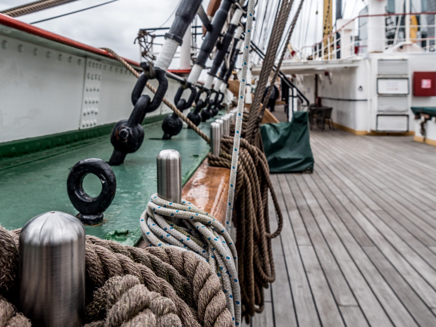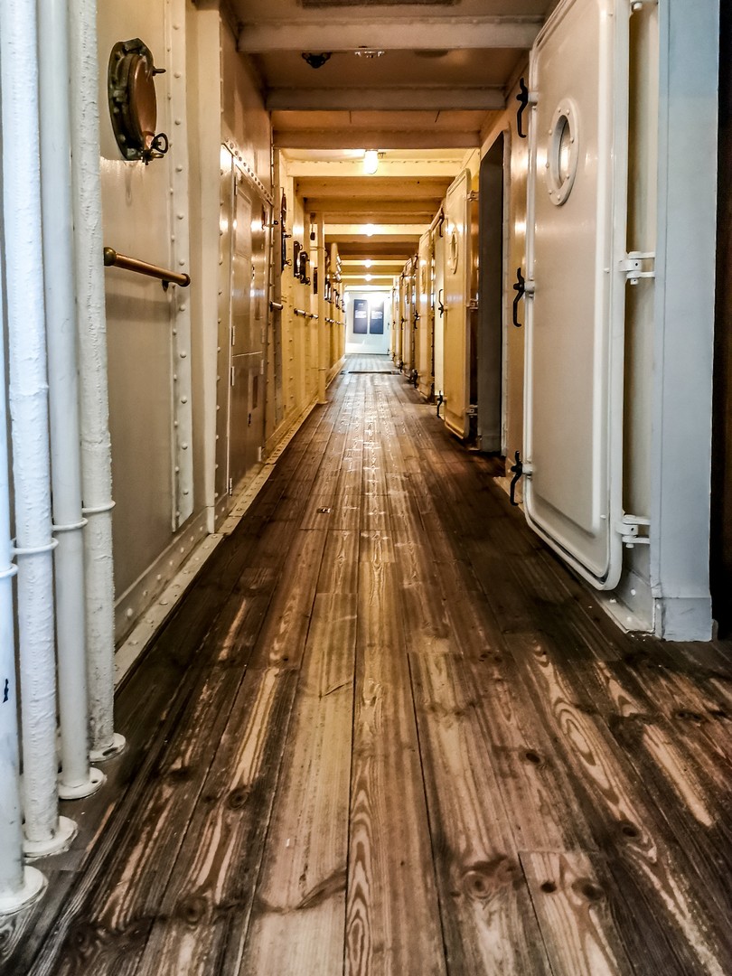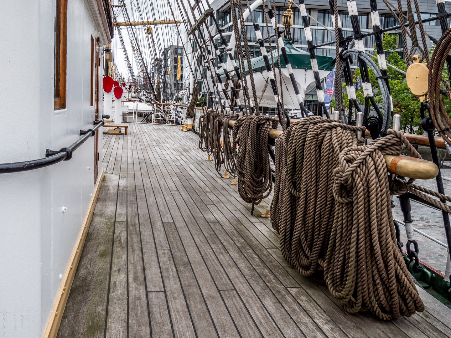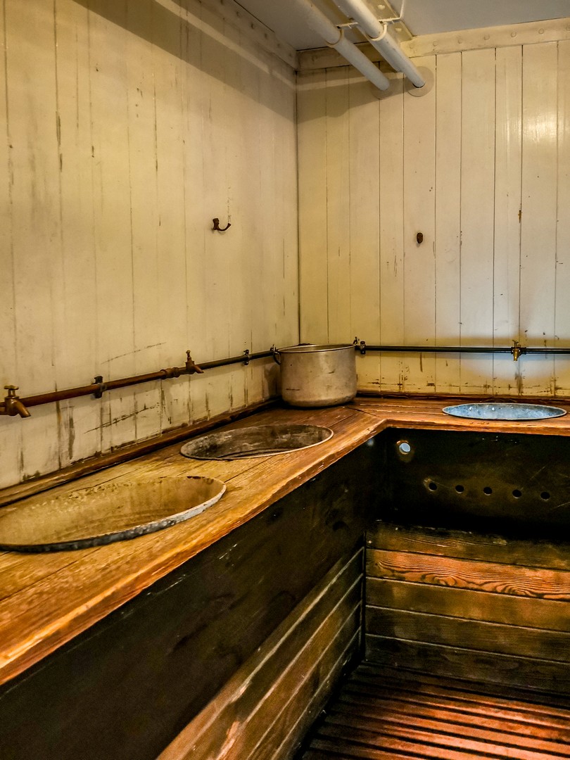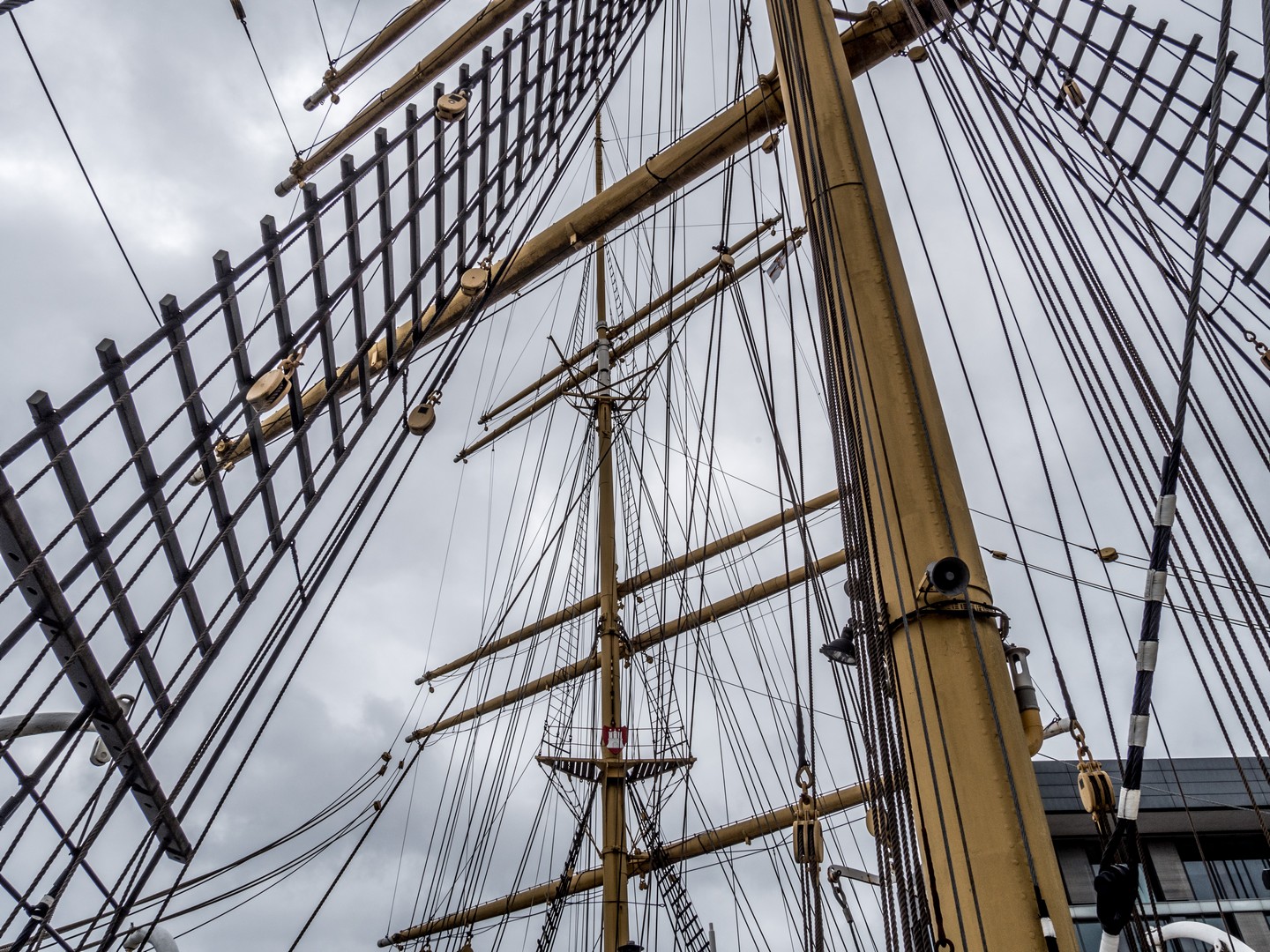 Pour terminer en beauté nos aventures maritimes, nous embarquons dans voilier amarré au Neuer Hafen et qui me faisait de l’œil depuis un moment à force de passer et de repasser devant lors de nos promenades. Ce fameux trois mats (fin comme un oiseau), c’est le bateau-école « Deutschland ». Construit en 1927, ce navire avait pour vocation de former les recrues de la marine marchande. Sa carrière aura été courte (il cesse ses activités en 1942) mais, magnifiquement préservé, il est un témoignage de la marine d’antan et enregistré dans le registre des monuments historiques du Land de Brême. Icke, le gardien du Deutschland, nous fera la visite. Il y a une petite partie muséale où les conditions d’origine du navire sont préservées : le poste de commandement, celui de l’opérateur radio, la chambre des cartes, celle du capitaine, le réfectoire etc. Mais une des particularités du Deutschland, c’est qu’on peut y dormir : des petites cabines à couchettes ont été aménagées (c’est évidemment assez minuscule et les sanitaires sont communs) mais franchement, si je reviens à Bremerhaven, j’irais dormit là. Rien ne vaut le romantisme d’un voilier !