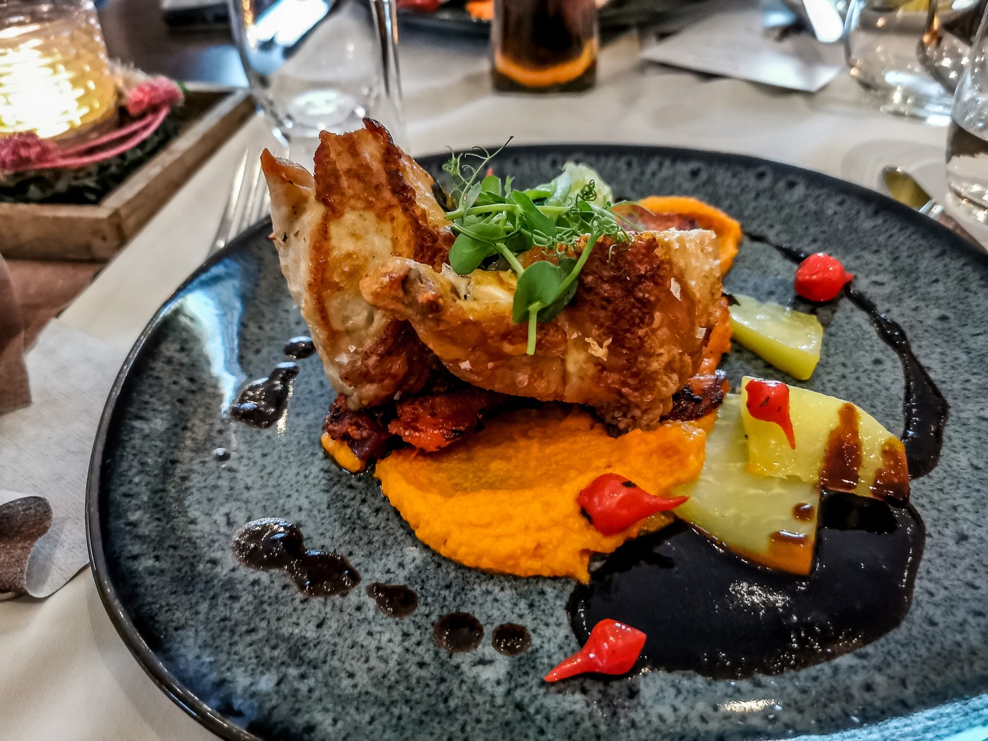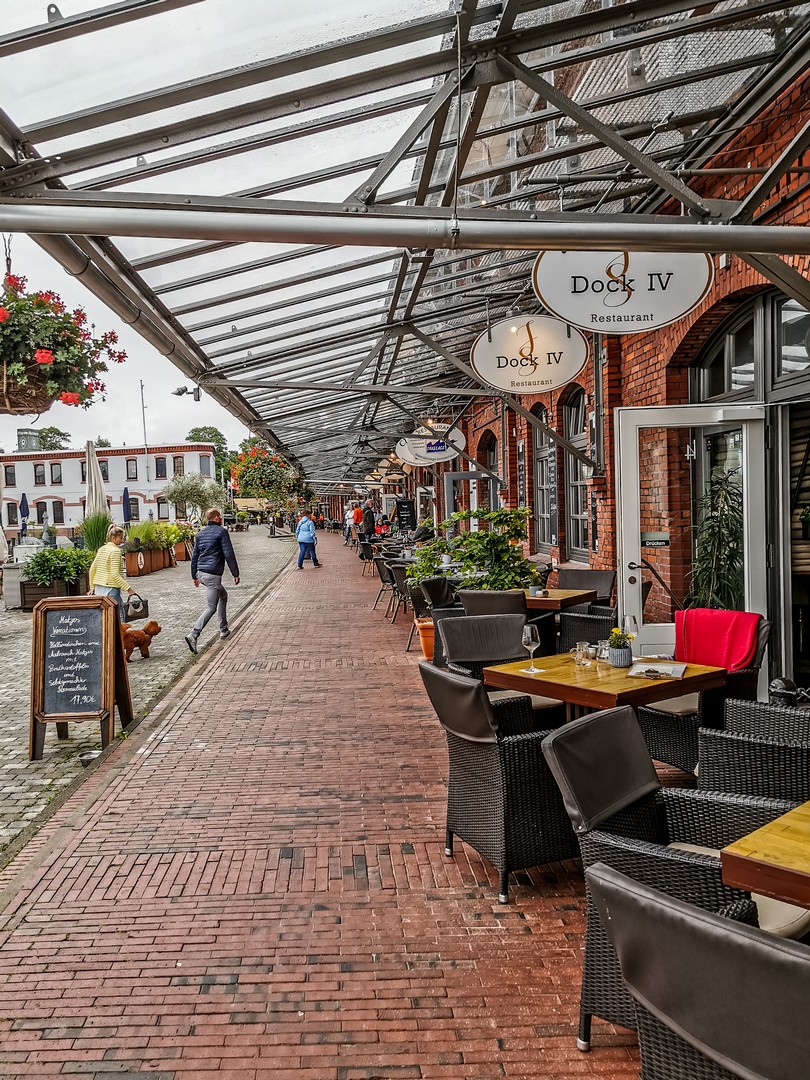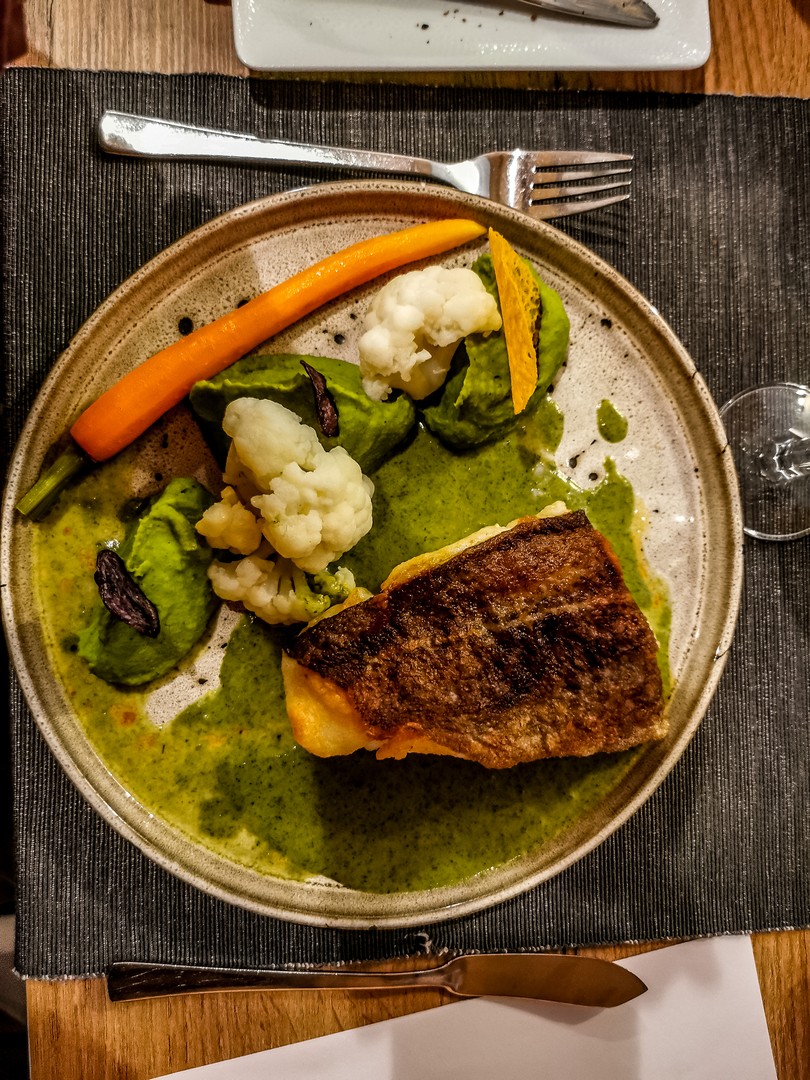 Déjà, il y a le lieu : l’ancien port de pêche de Bremerhaven qui a été complètement rénové et est maintenant un lieu branché où on trouve restaurants, foodtrucks et guiguette où on peut siroter l’apéro face au port. Le Dock IV est situé dans un ancien bâtiment en pierre (peut-être l’ancien marché aux poissons ou un entrepôt ?) et la déco est tout ce qu’il y a de plus contemporain : carrelage noir et blanc, beaucoup de bois, des accents noirs et mats, des plantes… Et dans l’assiette ? On a une belle cuisine de saison, fraîche (mon dos de cabillaud cuit sur la peau avec sa purée de petit-pois à la menthe et ses légumes étaient délicieux.