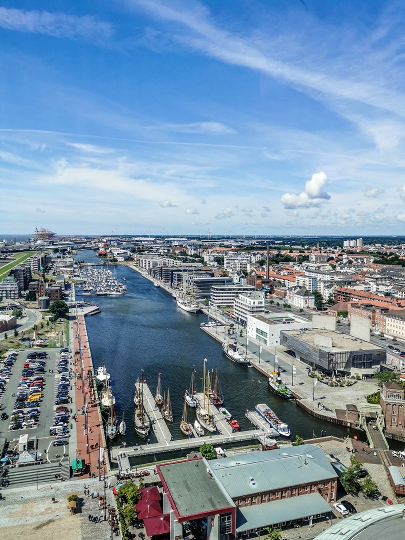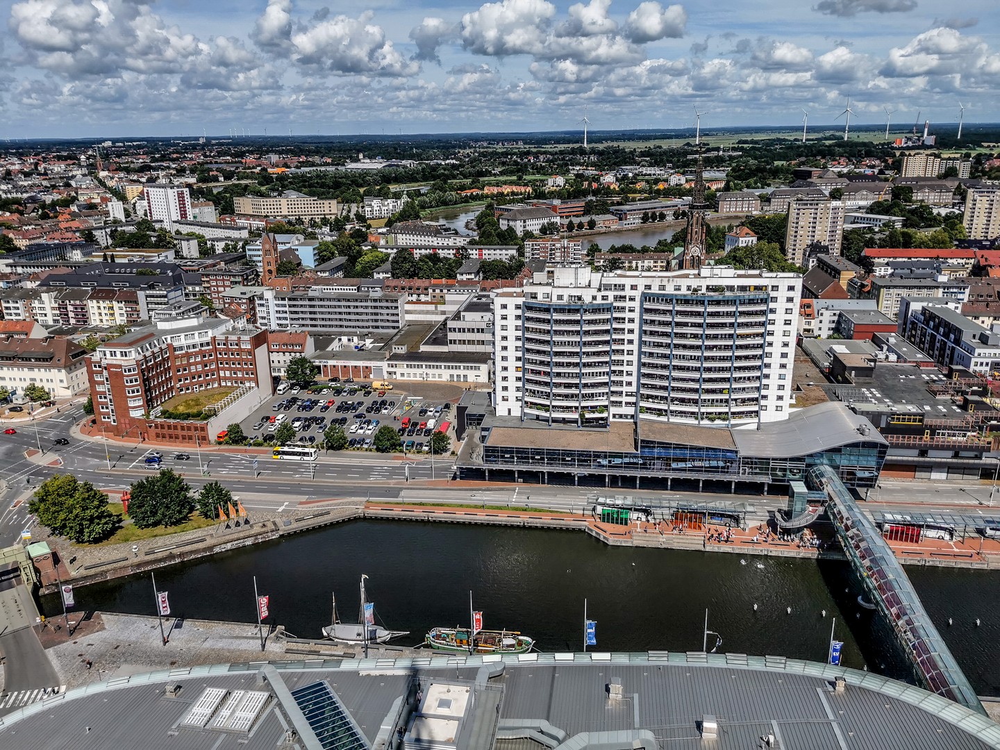 L’un des bâtiments iconiques de Bremerhaven, c’est celui où se trouve l’Atlantic Hotel. C’est bien simple : il ressemble à une immense voile de bateau. L’hôtel occupe les premiers étages du bâtiment (le reste, ce sont des bureaux) mais gère aussi l’espace événementiel du 19ème étage mais surtout, l’accès à une plateforme d’observation avec une vue imprenable sur un immense paysage tout plat (c’est payant mais si vous restez plus de 2 nuits à l’hôtel.