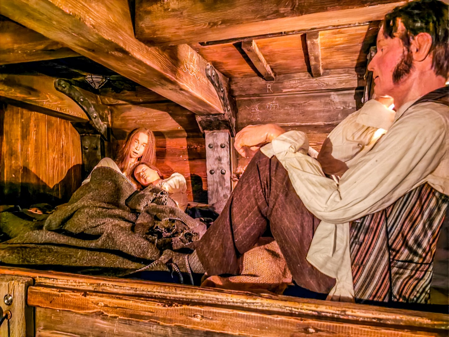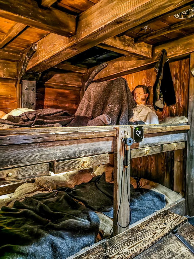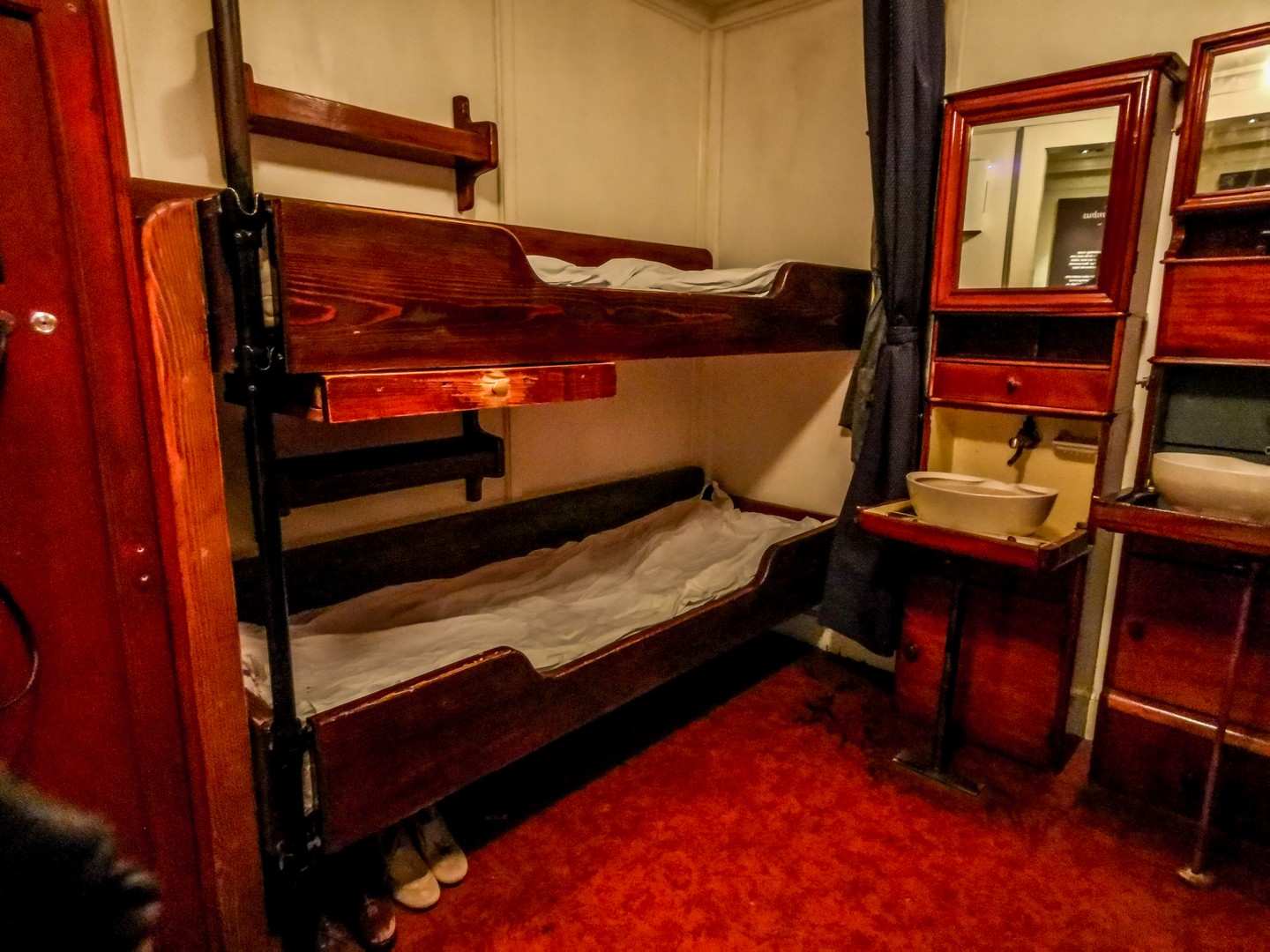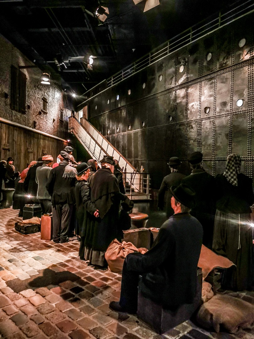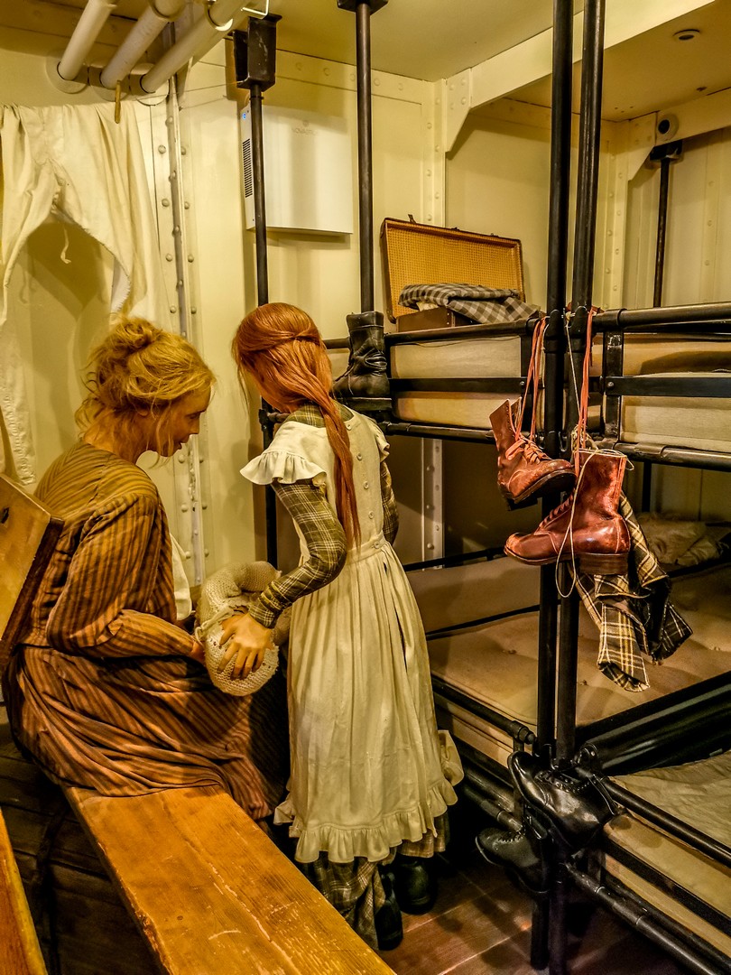 Comme la plupart des passagers, nous voyagerons en 3e classe. Nous embarquons donc et dans un couloir qui tangue vraiment (comme sur un bateau, pour reproduire les sensations d’un vrai voyage en mer) et nous allons voir l’évolution des conditions à bord, depuis les voiliers qui mettaient 10 semaines à traverser l’océan (dortoir commun, pas de toilettes) jusqu’aux paquebots qui sont arrivés à réduire le passage à 5 jours (couchette et toilettes communes). On reste quand même bien loin des paquebots que je connais.