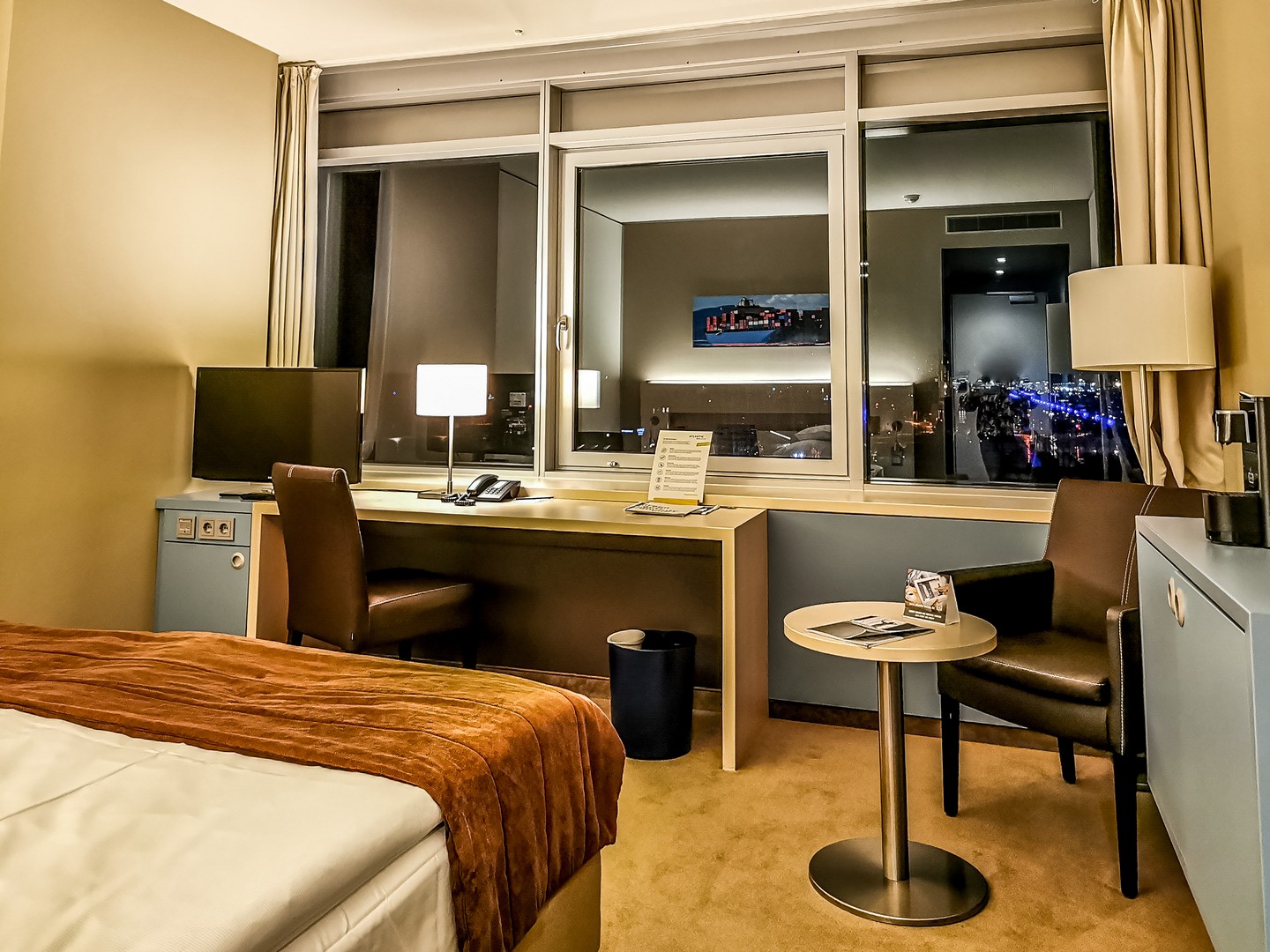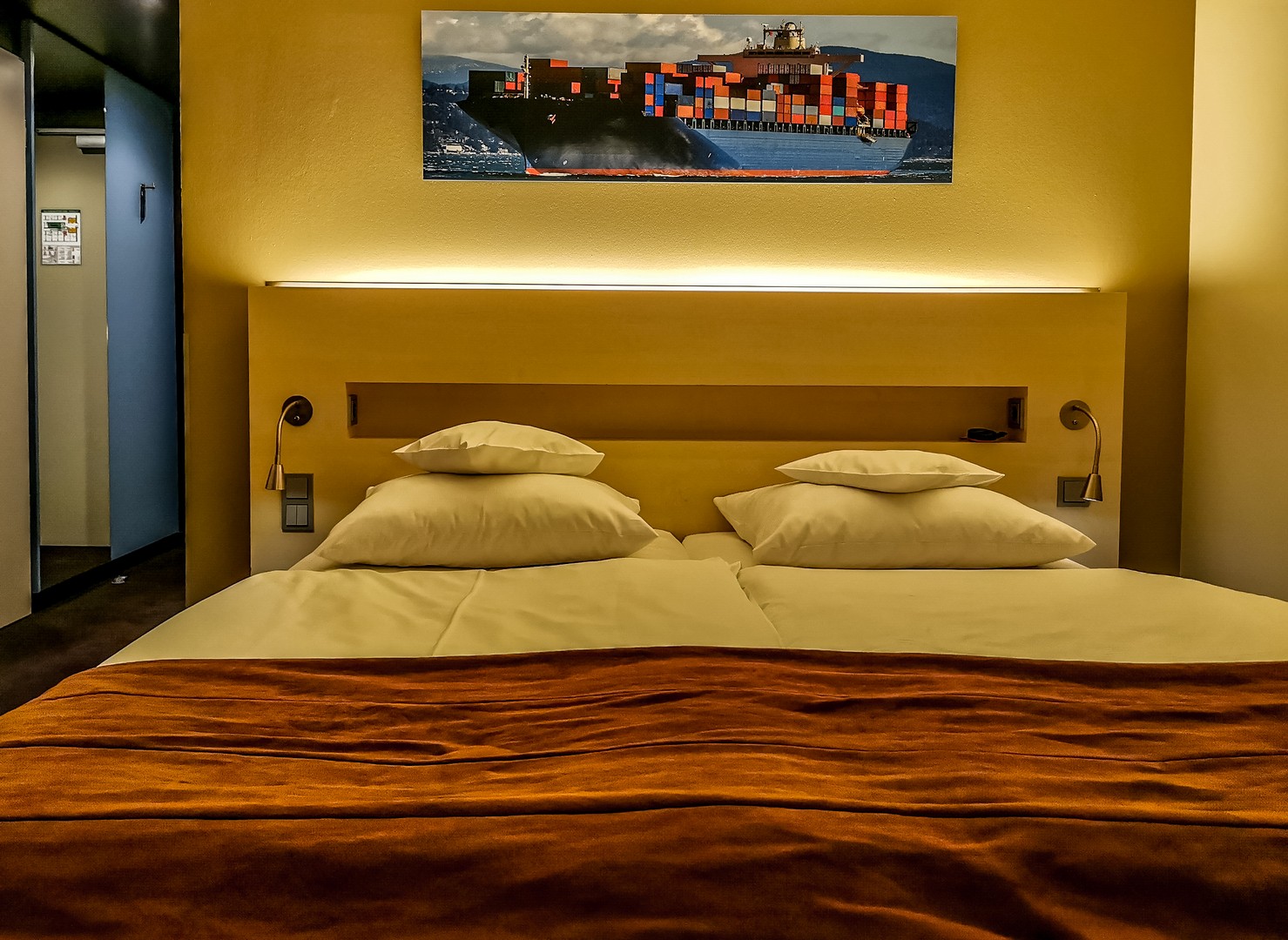 Parlons des chambres : elles sont très lumineuses, évidemment dans des tons marins de blanc, bleu et sable, meublée sobrement mais efficacement. Dépendant d’où vous serez vous aurez ou pas une vue sur le Weser et le port. Avec les grandes fenêtres qui couvrent tout un côté d’un mur, on a l’impression que le paysage entre littéralement dans la chambre.