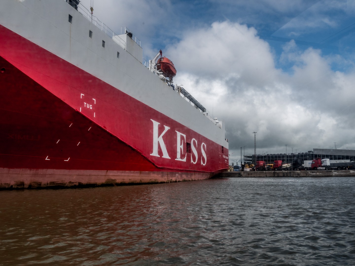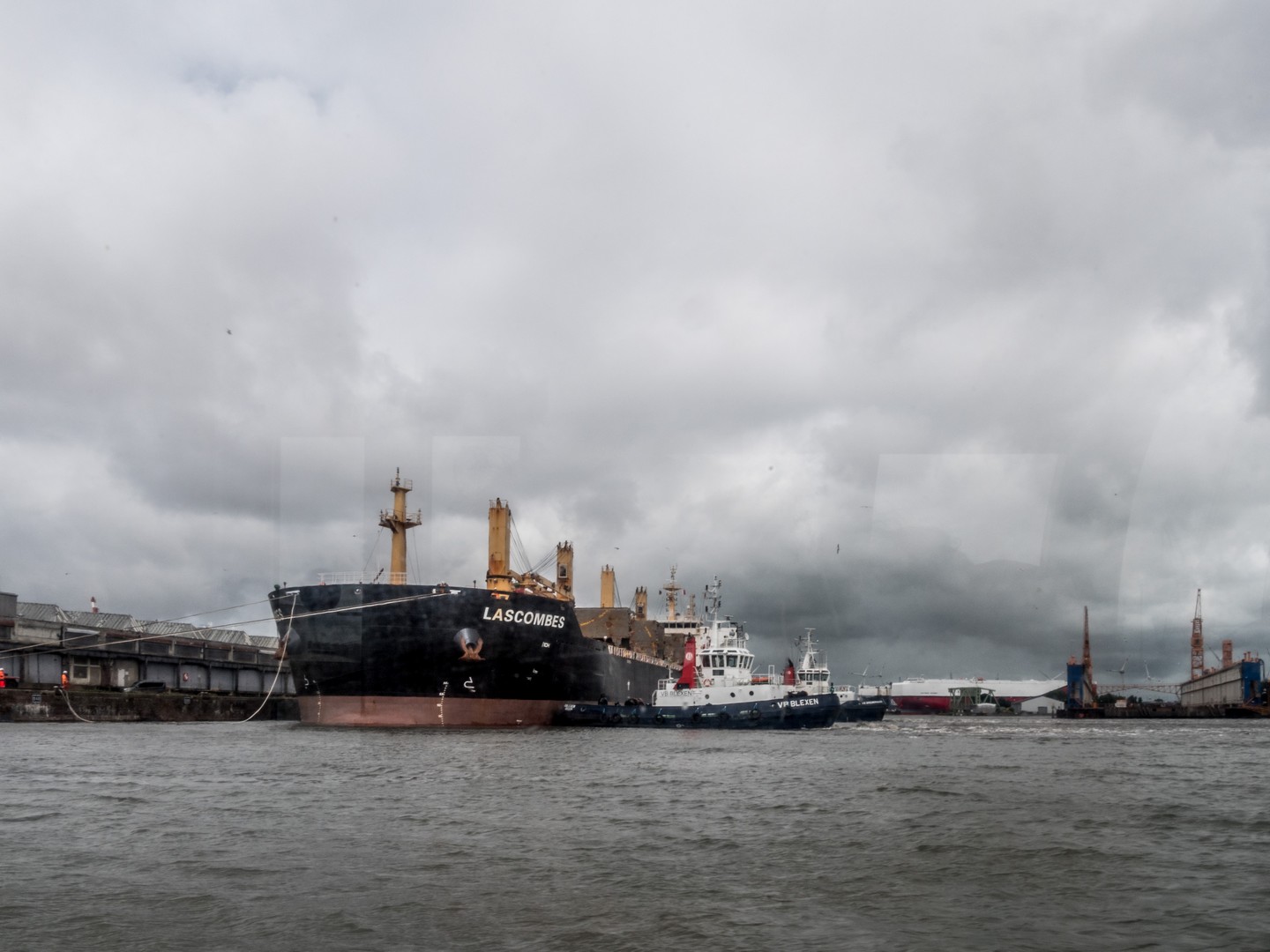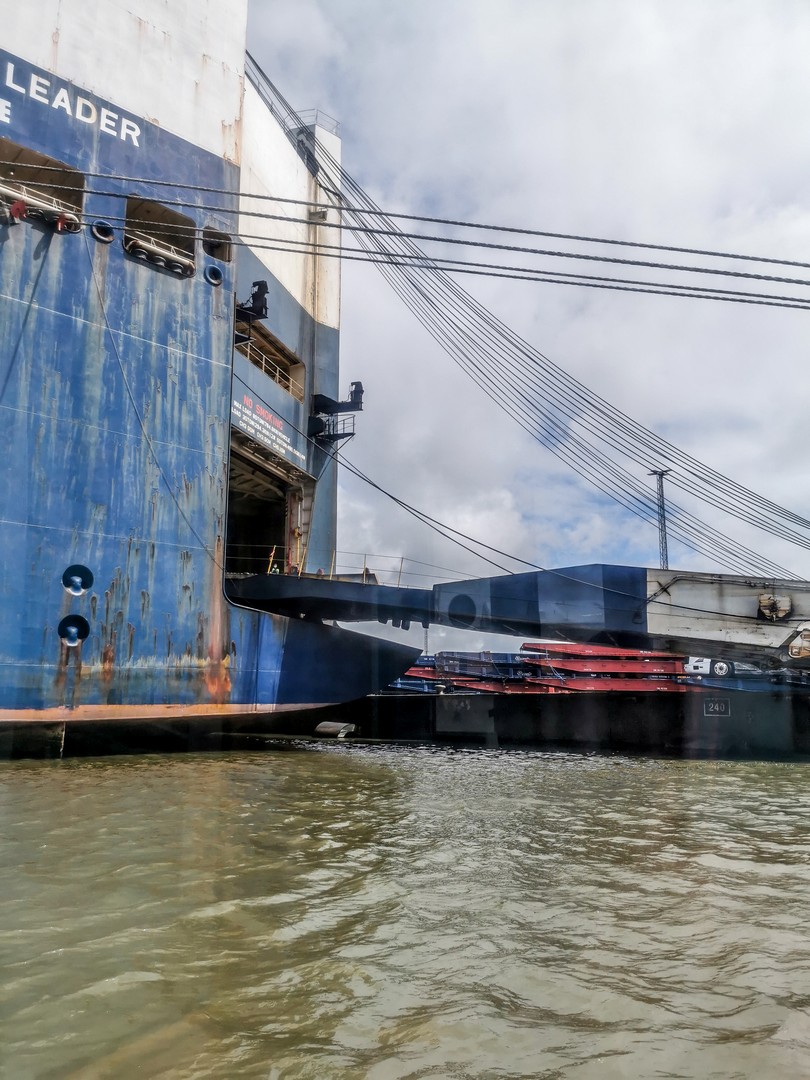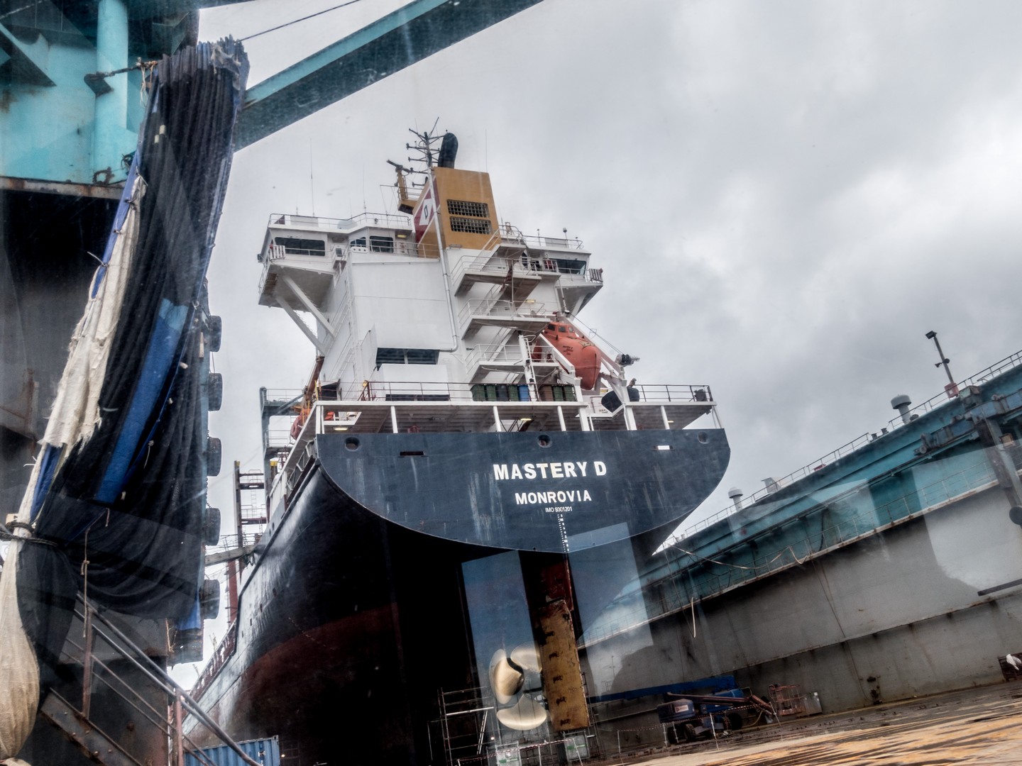 Nous ne tardons d’ailleurs pas à voir un énorme navire Sud-coréen en train d’être chargé. C’est bien simple, une rampe gigantesque est descendue jusqu’à terre et… on conduit les voitures à l’intérieur. Il y a toute une catégorie de travailleurs du port dont c’est le job : conduire des voitures dans les entrailles de géants des mers et les remplir avant un long voyage. C’est impressionnant ! Evidemment, il existe plusieurs docks, chacun avec des fonctions dédiées. L’un est consacré aux containeurs, d’autres aux fruits, encore d’autres aux réparations (nous croiserons d’ailleurs le Lascombes, navire portant pavillon des Îles Marshall et qui a subi un grave incendie (il est d’ailleurs encore maintenu droit par deux bateaux plus petits, de crainte qu’il ne chavire.
