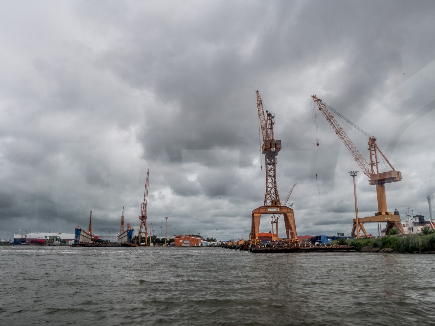 Il est temps de se pencher un peu sur ce qui est la raison d’exister de la ville : son port. Il y a moyen de l’aborder de deux façons : par le fleuve et par la terre. C’est avec la première option que nous allons commencer et nous embarquons sur un des bateaux de Hafenrundfahrt pour une balade d’une heure et demie sur l’eau. Il faut au moins ça pour explorer les différents bassins et ses multiples fonctions. Bien installés sous un toit rétractable, avec un bon soda à la main (on sert à manger et à boire sur le bateau), il ne reste plus qu’à se laisser porter.
