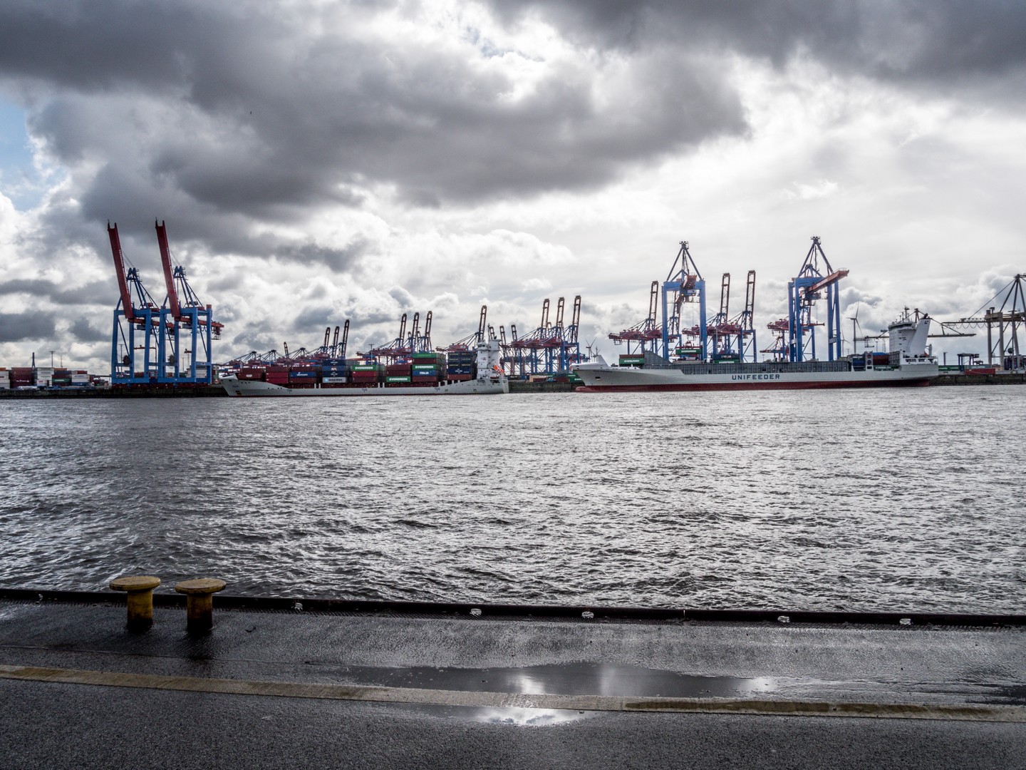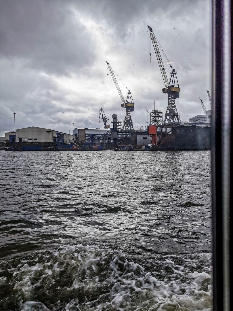 Rien à faire, quand je pose un pied sur un bateau, ça me met en joie et parmi l’offre de transport public à Hambourg, il y a des navettes fluviales ! Depuis l’embarcadère, nous montons à bord de la Ligne 62, direction la Plage de l’Elbe. Cette petite traversée de 20 minutes permet de voir Hambourg sous un autre angle et d’observer les installations portuaires qui font partie intégrante du tissu urbain.