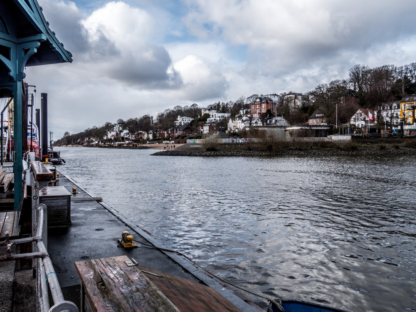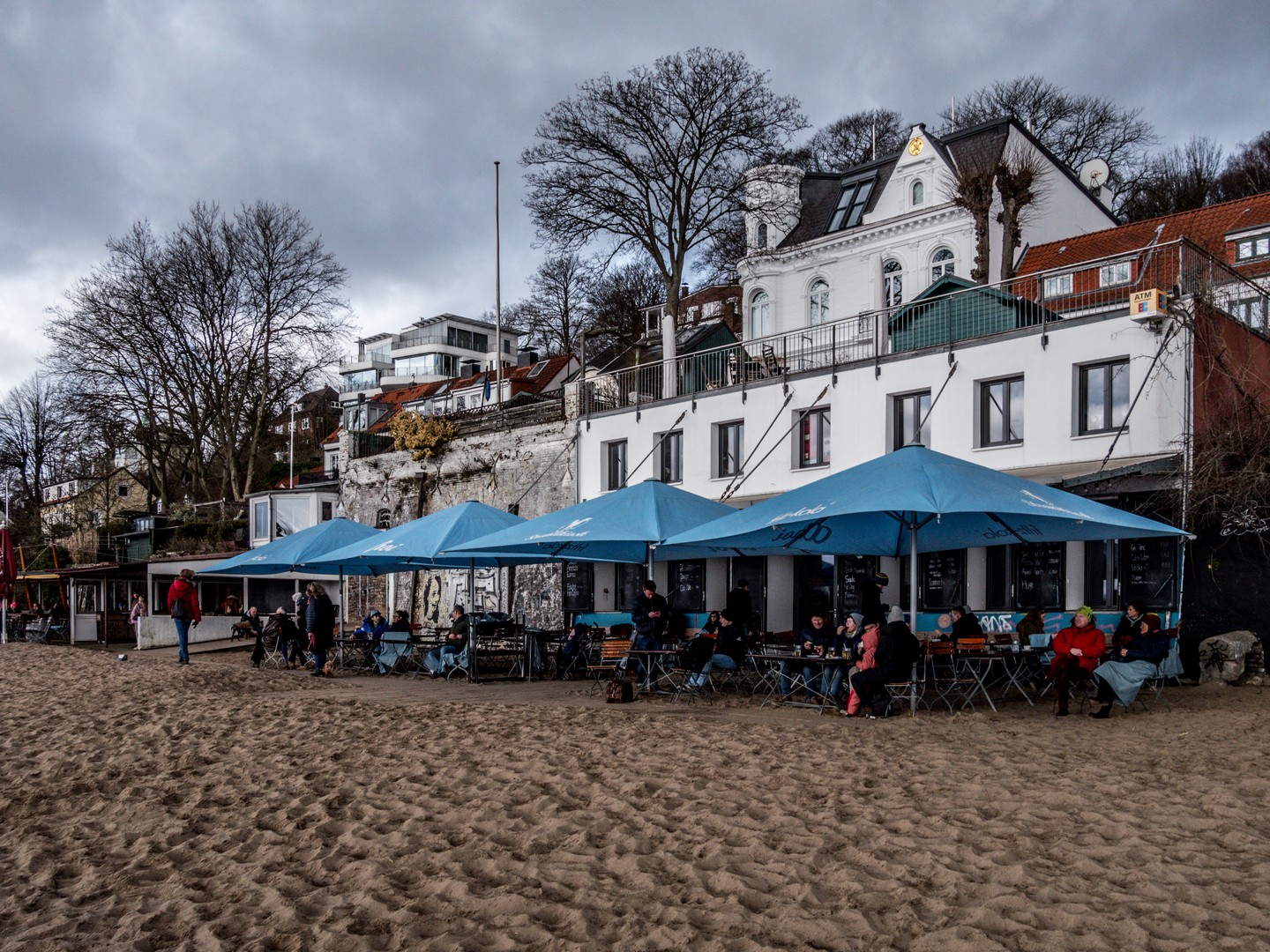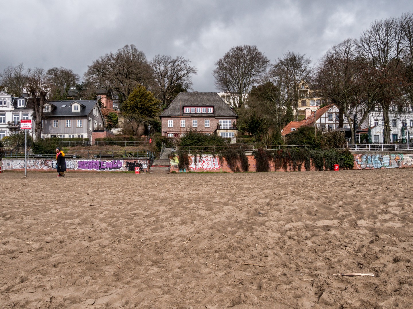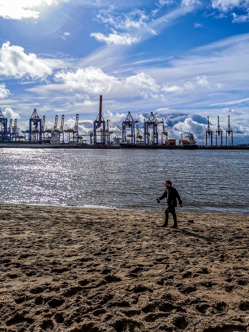 La plage de l’Elbe n’est pas une plage pour rire : sable blond, bars de plage… J’imagine que l’été, l’ambiance doit être électrique et animée mais en ce dimanche de mars, c’est plutôt relax. On vient y promener ses enfants et/ou son chien. Le quartier est évidemment plutôt cossu, avec de jolies villas qui surplombent la plage mais de l’autre côté du fleuve, les grues du port rappellent que la Hambourg « prolétaire » n’est pas loin. Certes, la mer est encore loin mais cette promenade les bottes dans le sable nous a fait un bien fou.