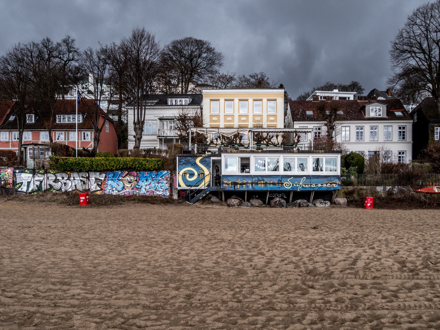 Nous continuons notre promenade en direction du centre, toujours en suivant le fleuve et nous ne tardons pas à rejoindre StrandPauli. A la fois plage urbaine et club de plage, le lieu est rempli de sable, de paillottes et de mobilier en bois. Le genre d’endroit bien, bien cool quand le soleil brille et pour déguster sa petite boisson au bord de l’eau. Malheureusement, il fait trop froid pour la plage ne s’ouvre, mais je prends une note mentale pour une prochaine visite, à une période plus clémente de l’année.