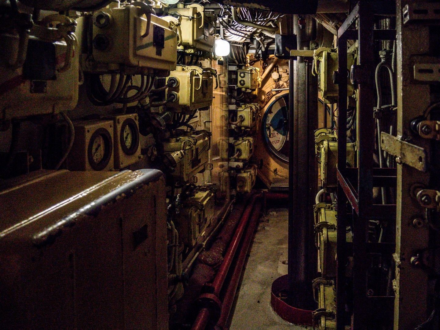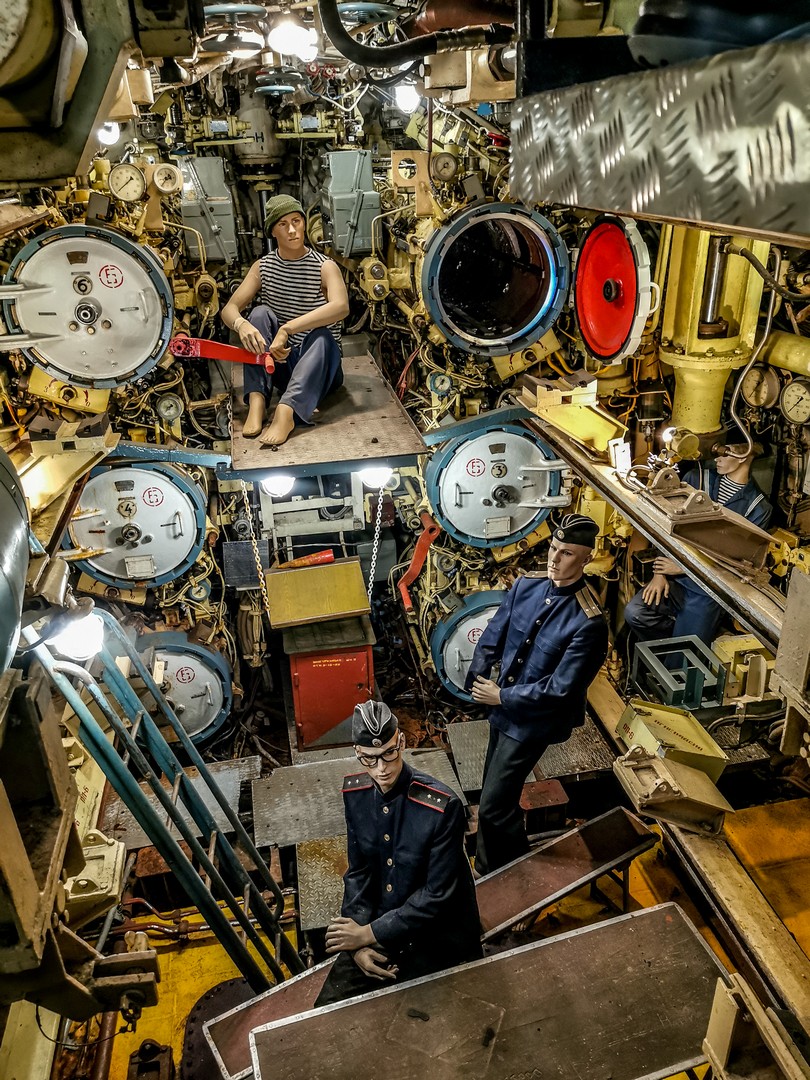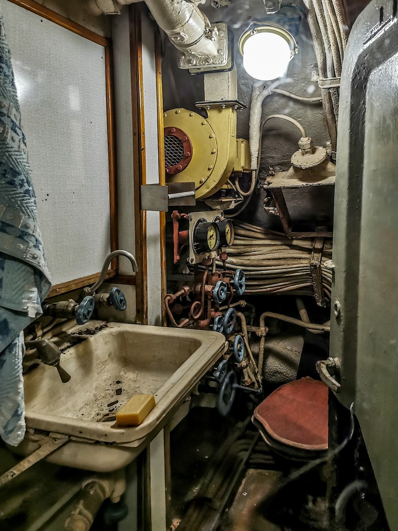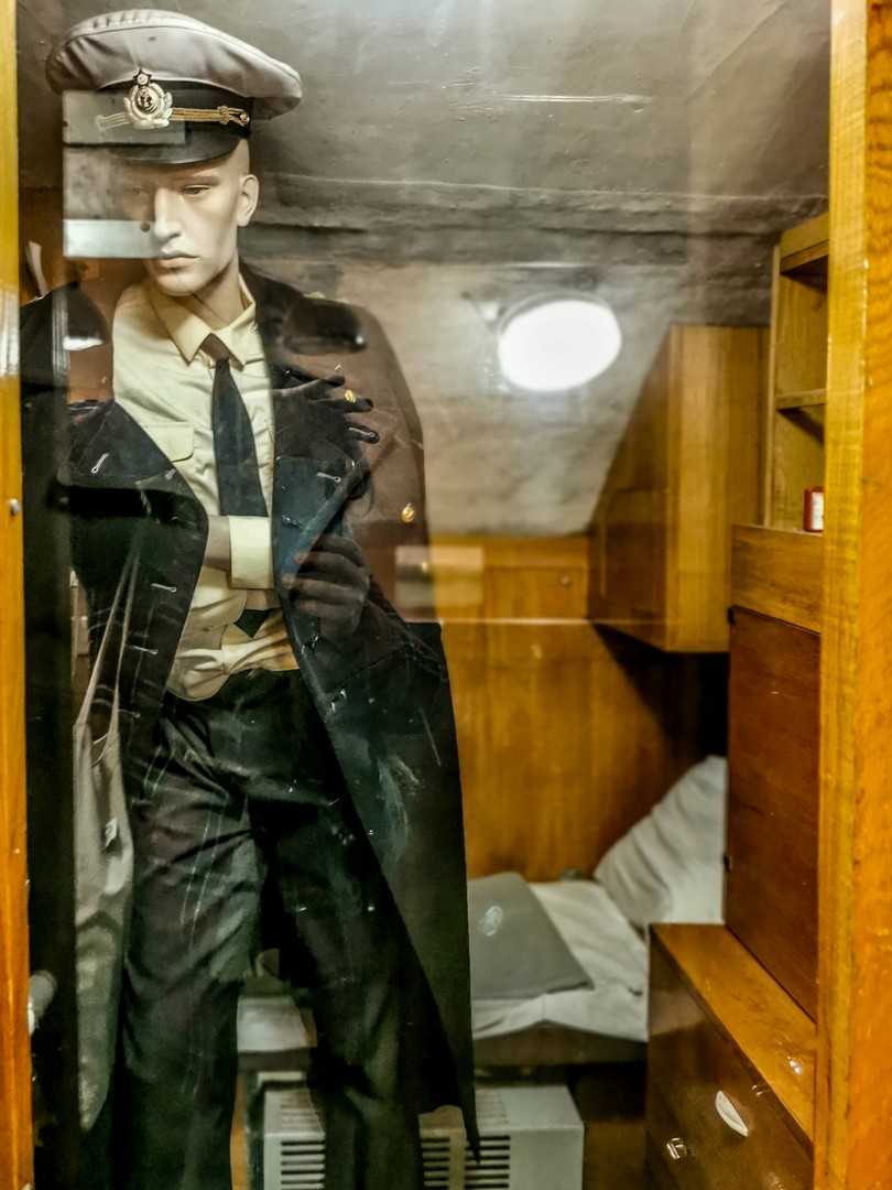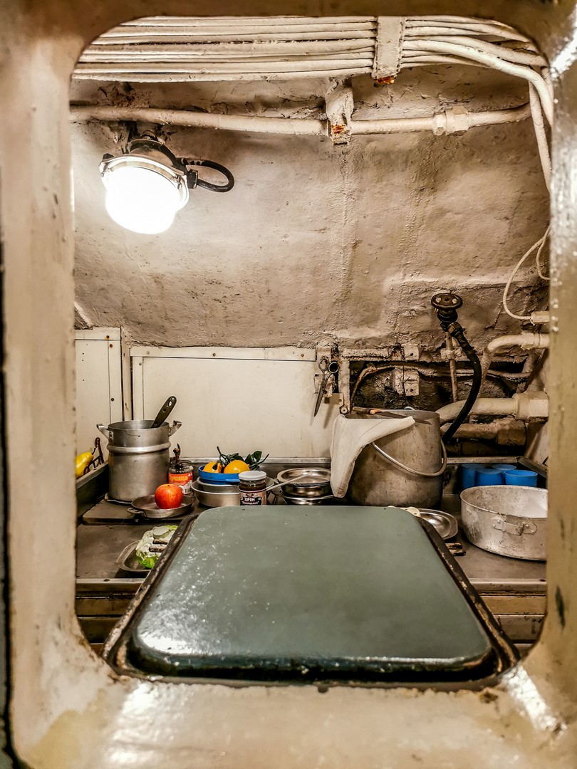 J’avais déjà visité un sous-marin à Tallinn mais l’U-434 est beaucoup plus grand… et finalement semble encore moins confortable. ! Première chose à savoir, si vous êtes grand.e, il va falloir apprendre à tenir la tête baissée. C’est bas de plafond… et étroit. Tous les espaces sont encombrés par les câbles, les machines, les cabines, les espaces de vie… Pas question d’être claustrophobes ! Malheureusement, la visite n’est pas possible pour les personnes à mobilité réduite puisqu’il y a plusieurs écoutilles à franchir. On retrouve tout ce qui peut faire fonctionner un village en miniature : une cuisine, des sanitaires (qui font un peu peur), une infirmerie (avec une cabine d’isolement, en cas de maladie contagieuse), des cabines pour dormir, un mess pour les officiers… Il fallait avoir les nerfs solides pour travailler ainsi pendant de longs jours, voire des semaines, sans lumière du jour, avec un minimum de confort, dans le bruit constant des machines, à devoir supporter la promiscuité avec le reste de l’équipage. C’est fascinant ! Et je pense pouvoir dire que ça plairait beaucoup aux enfants.