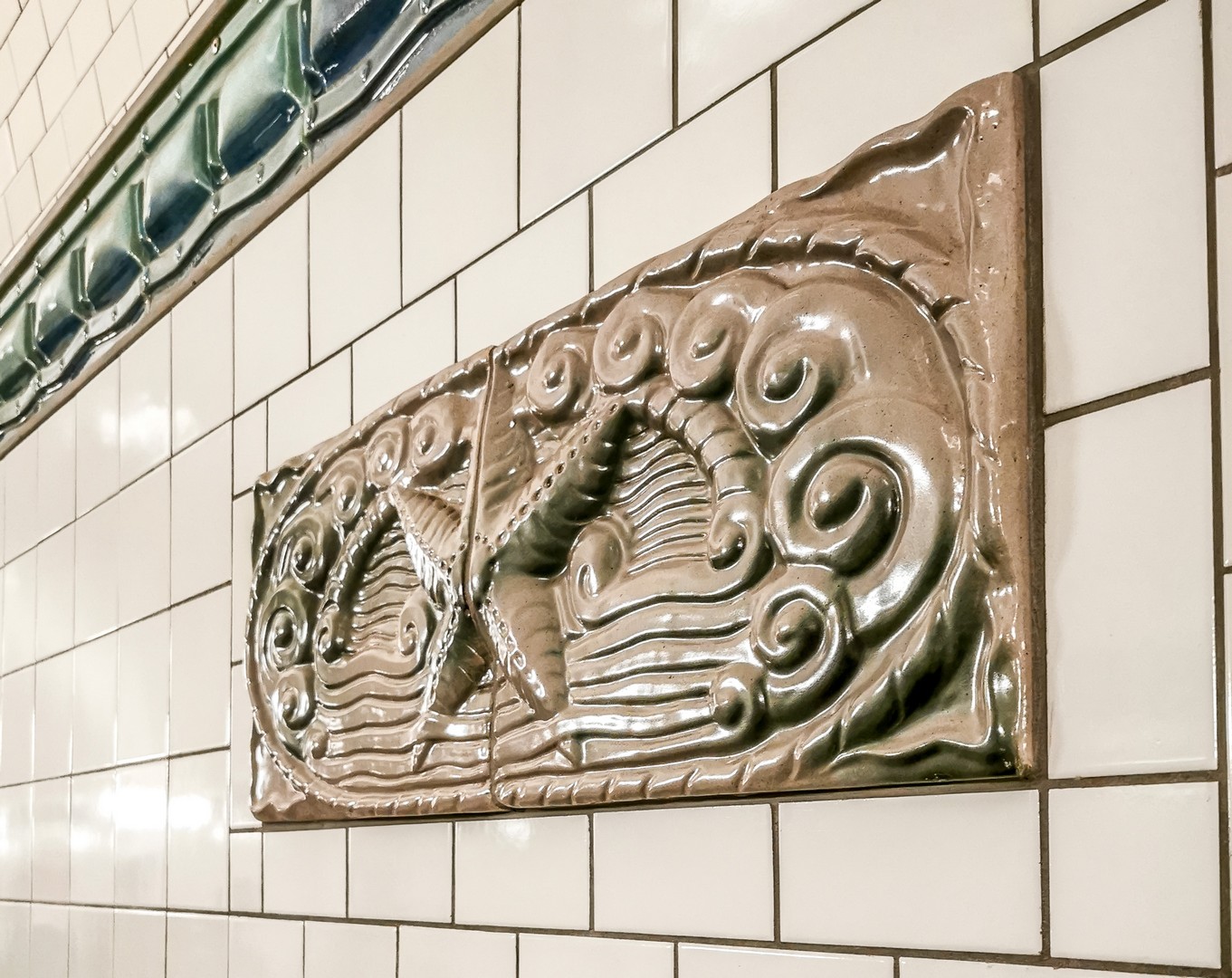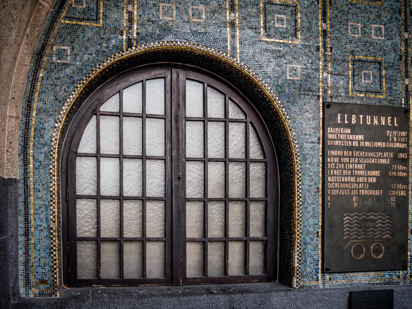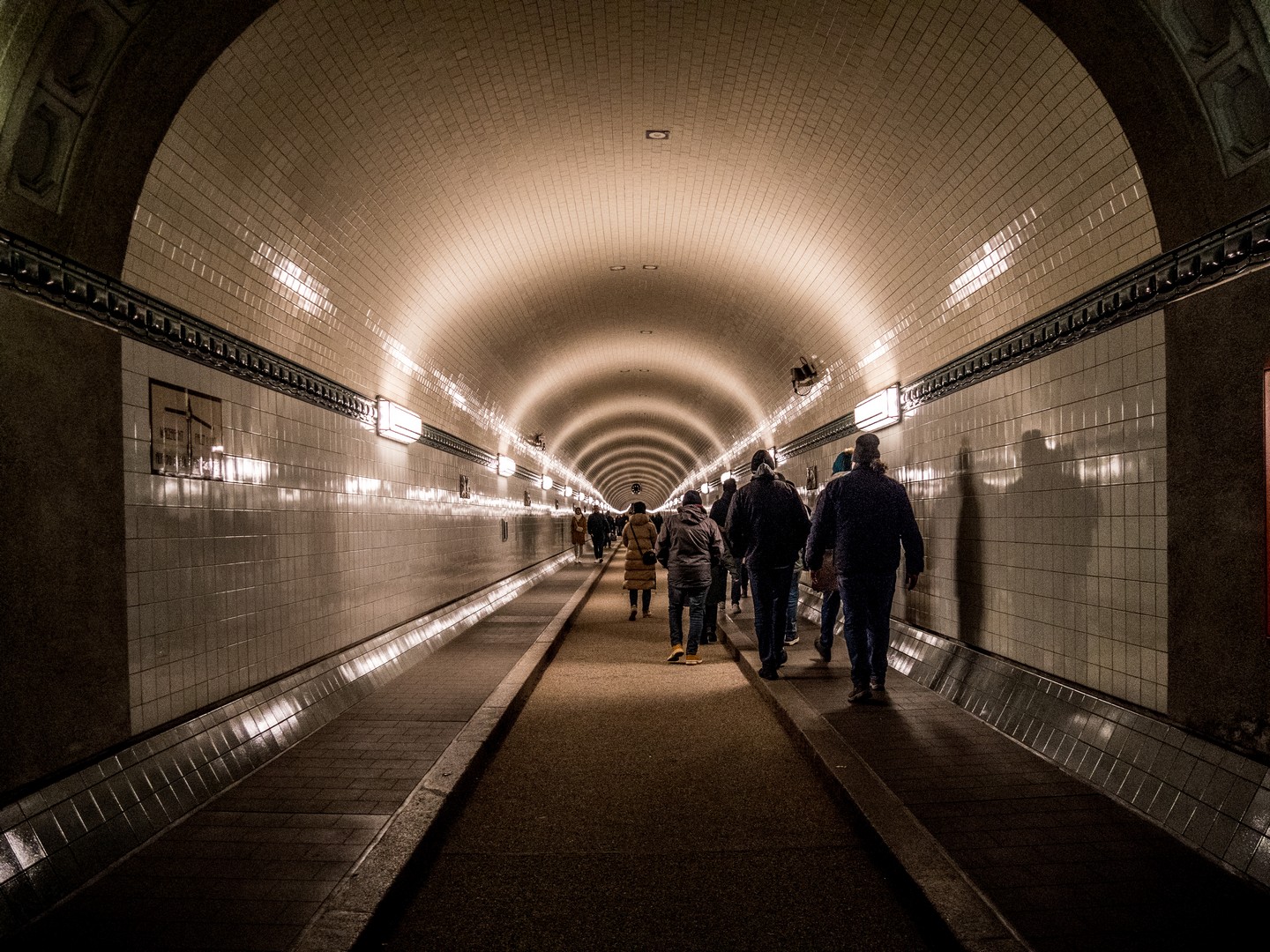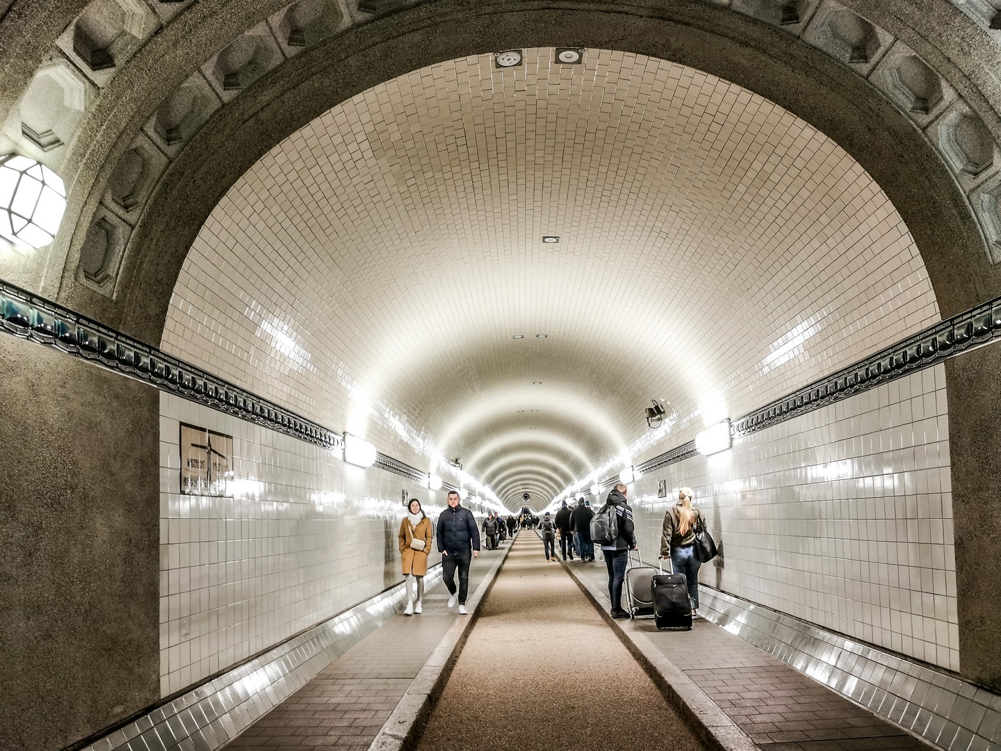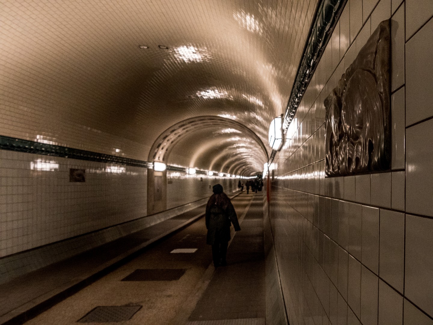 Après une descente de 24m sous la surface, nous découvrons un immense tunnel, tout décoré de tuiles de céramique blanche et ornées de médaillions en terre cuite émaillée représentant des animaux marins (poissons, crabes, étoiles de mer…) mais aussi des détritus et des rats. Pour arriver de l’autre côté, il faut marcher les 426 mètres de longueur du tunnel, sous une lumière blafarde. Mais l’expérience est bluffante. Je n’ai pas pu m’empêcher de regarder plusieurs fois vers le plafond en songeant aux tonnes d’eau qui se trouvaient au-dessus de nos têtes. Comme nous sommes dimanche, le tunnel était fort fréquenté, le lieu est au programme de balade de nombreux Hambourgeois et de touristes, alors, si vous venez à vélo le week-end, vous devrez probablement descendre de selle et pousser votre vélo.