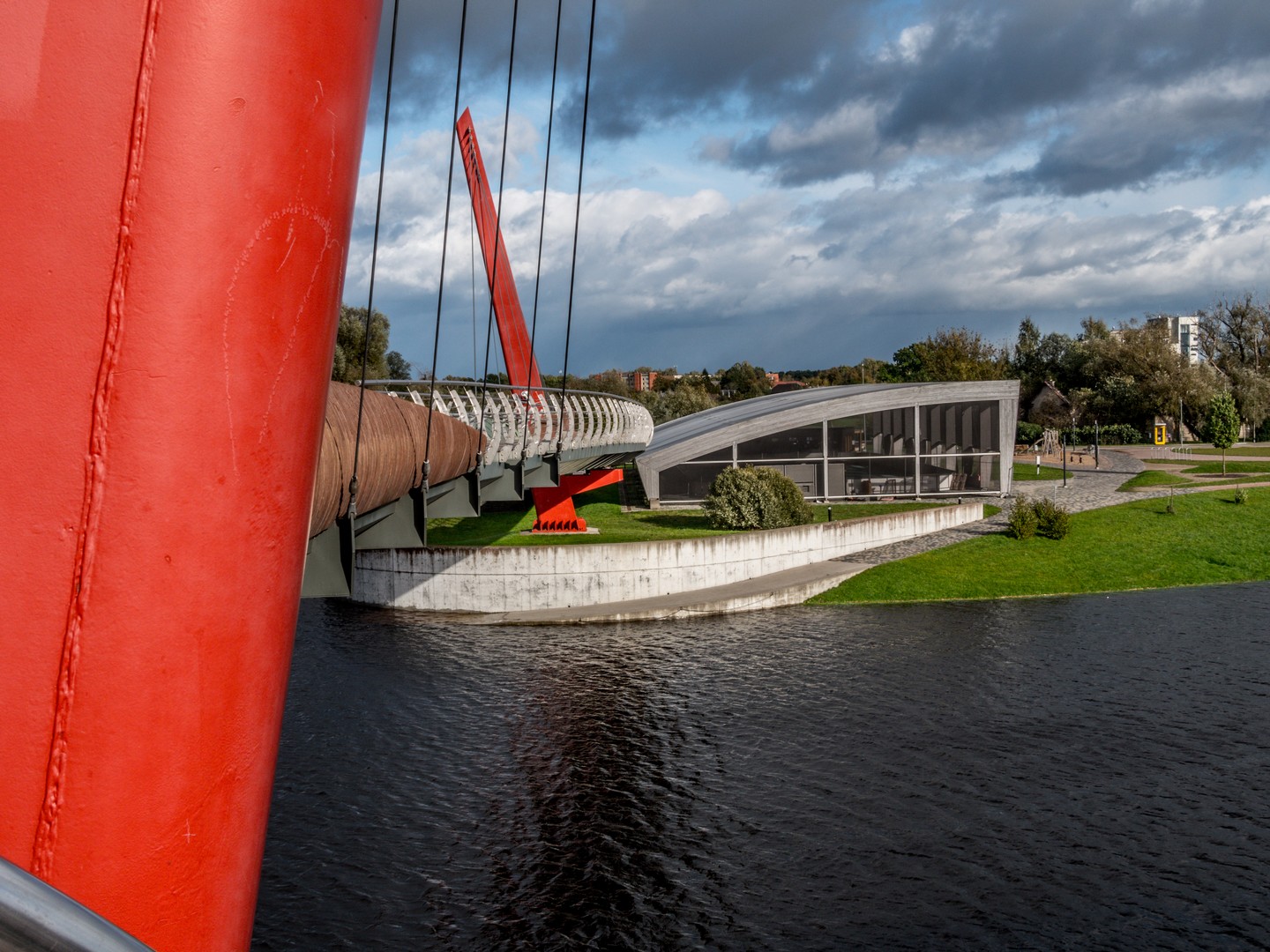 Comme souvent sur les sentiers-nature, il ne faut pas en sortir, sous peine d’endommager l’environnement que l’on visite. Et comme nous sommes dans les pays baltes, une tour d’observation est presque obligatoire : c’est bien le cas ici. Je grimpe donc pour admirer le panorama. Le fleuve s’étend devant moi dans la lumière d’un matin d’octobre, large et argenté. Au loin, la silhouette du palais, puis celle de la ville, et tout autour, du vert à perte de vue : on dirait une oasis.