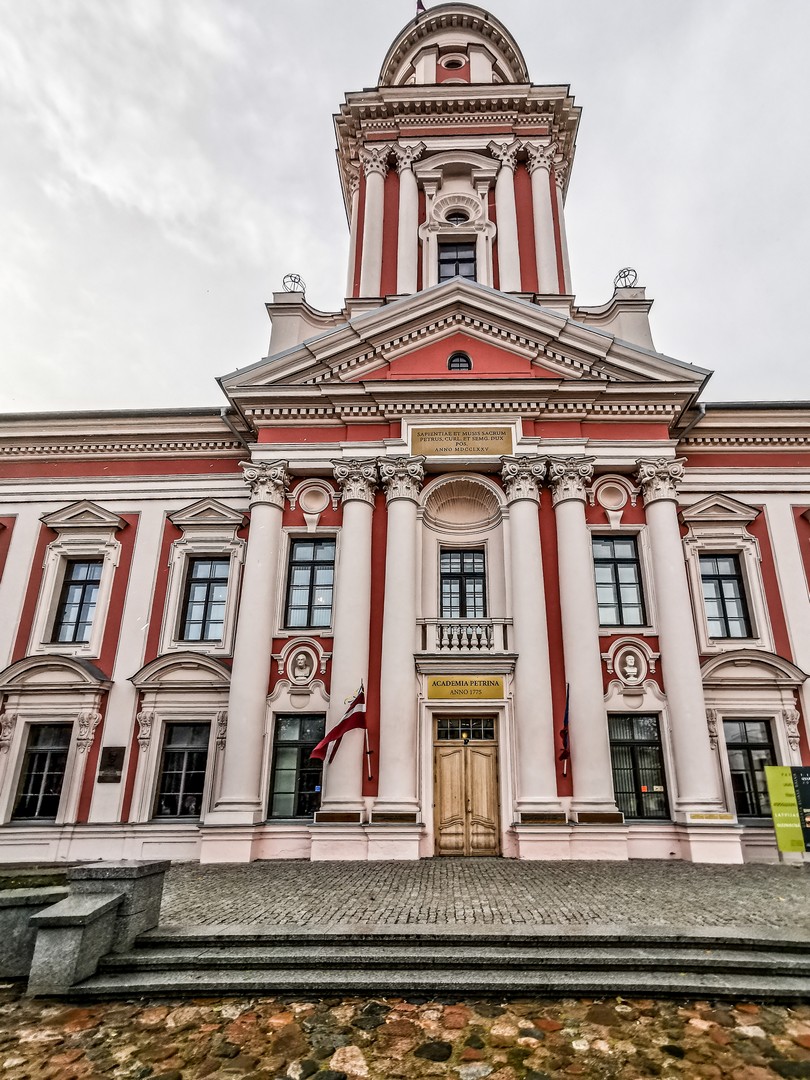 Grandement endommagée par la guerre, l’Academia Petrina a été restaurée et reste, avec le palais des ducs de Courlande, l’un des rares bâtiments historiques de la ville. L’académie naît d’une idée de Friedrich Wilhelm von Raison, qui parvient à convaincre le duc Peter de l’intérêt d’ouvrir une université à Mitau. Mais le duché, gouverné par un duc protestant, est alors lié à la catholique Pologne et seule une bulle papale peut autoriser la création d’une université. Le pape n’allait évidemment pas donner son accord. Le projet est donc abandonné et l’établissement devient un « gymnasium » (au sens allemand du terme), un établissement d’enseignement, fonction qu’il conserve jusqu’à la guerre.