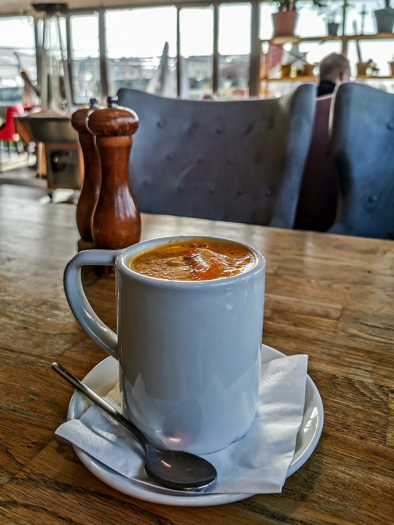 Ambiance vacances dans ce café-restaurant installé sur Pasta Sala, juste à côté du pont. Pour profiter au maximum de la vue, de grandes baies vitrées occupent tout un pan de la salle et laissent entrer la lumière à flots. La décoration, moderne, décline le rouge et le blanc, couleurs de la Lettonie. Un chic un peu daté, certes, mais qui n’entame en rien la popularité du lieu. N’espérez pas obtenir une table près des fenêtres sans réservation. Comme beaucoup de cafés-restaurants en Lettonie, il ouvre tôt et ferme tard, avec une carte variée (la vitrine des desserts est particulièrement tentante). J’en ai profité pour poursuivre mes tests de jus d’argousier chaud : testé et approuvé, avec un service impeccable.