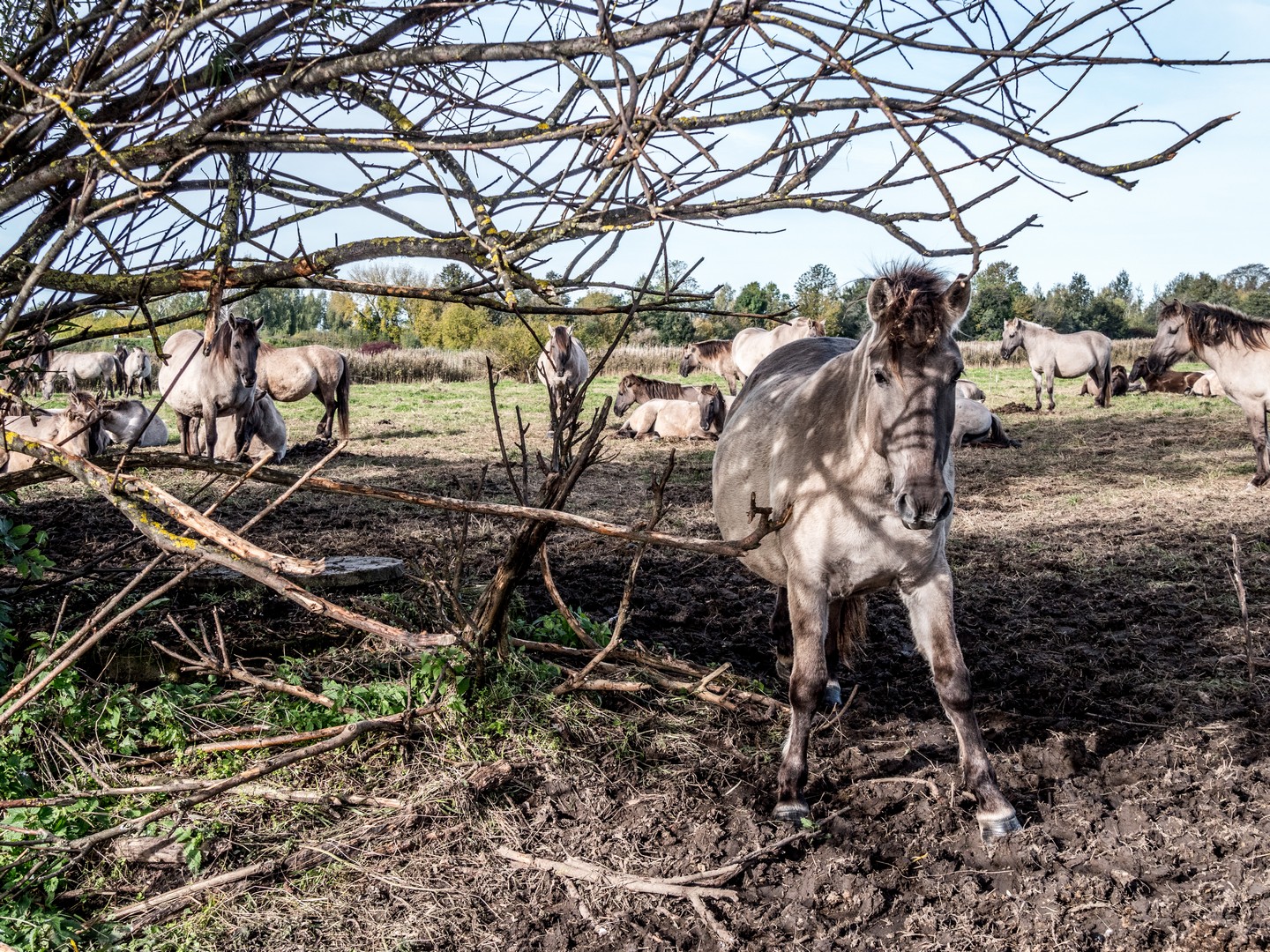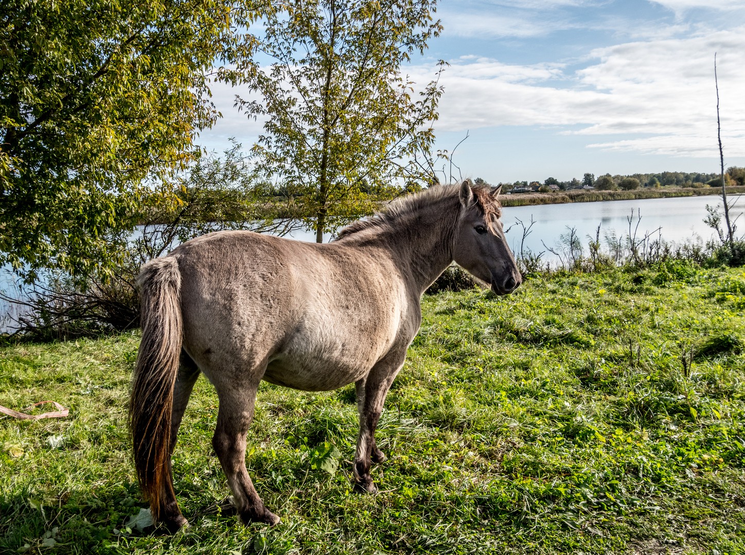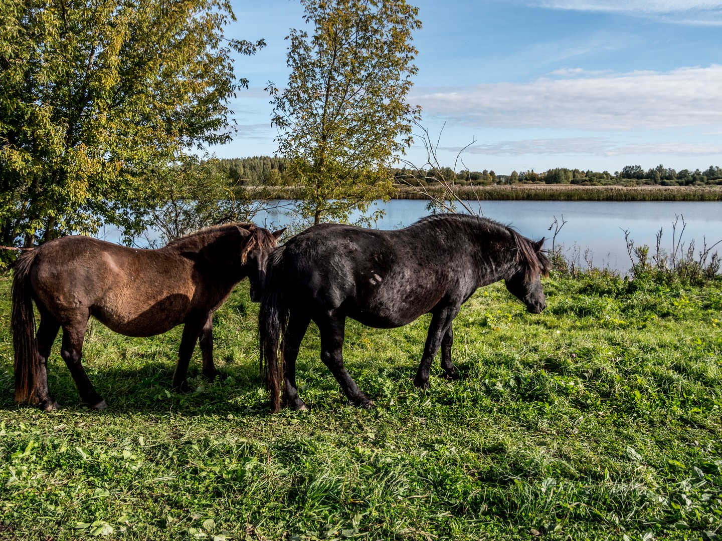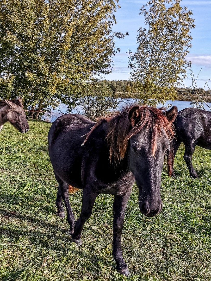 J’aurais pu redescendre et m’arrêter là, mais le but de ma promenade n’est pas encore atteint. Au bout de la réserve se trouve ce que je suis venue voir spécifiquement : les koniks de la Lielupe. Les koniks sont de petits chevaux semi-sauvages, une race ancienne et rustique que l’on trouve encore en Pologne mais qui était autrefois plus répandue. Courts sur pattes, trapus et dotés d’un poil épais, ils sont parfaitement adaptés aux hivers rigoureux de cette région d’Europe.
