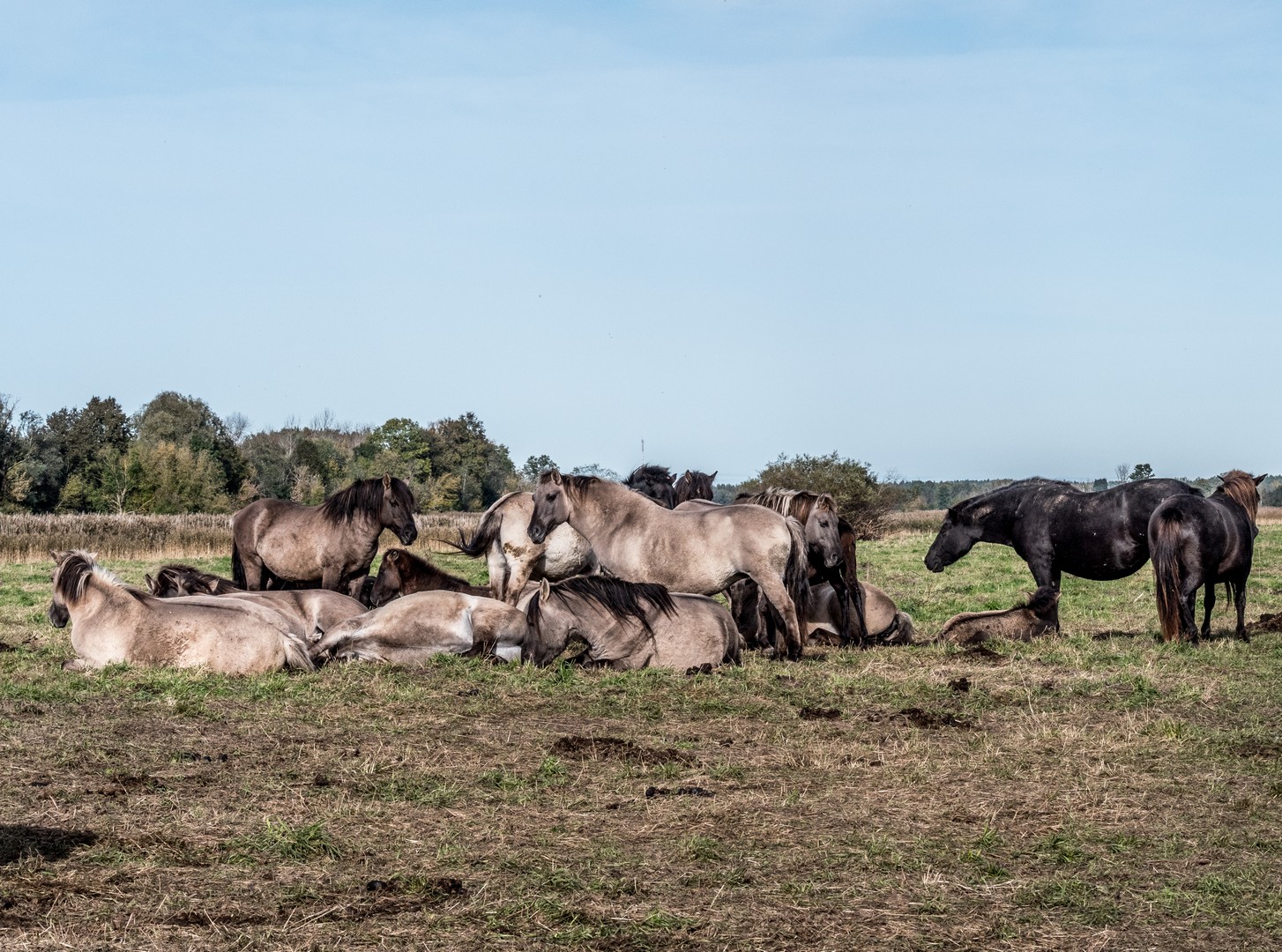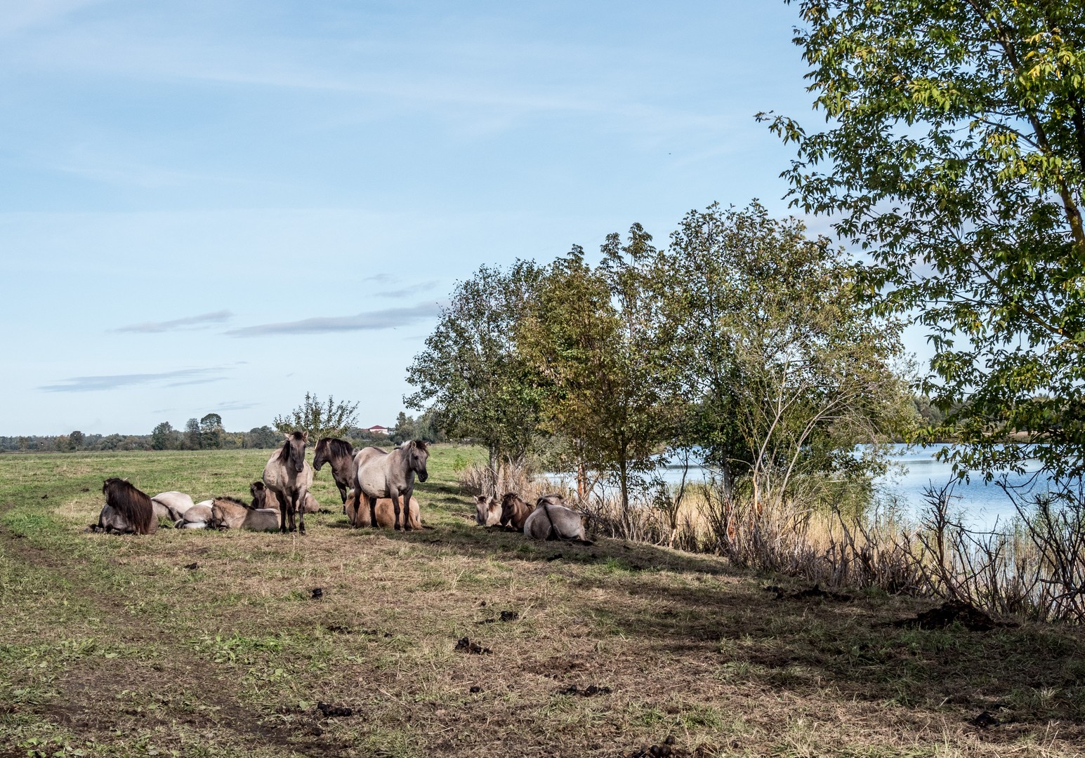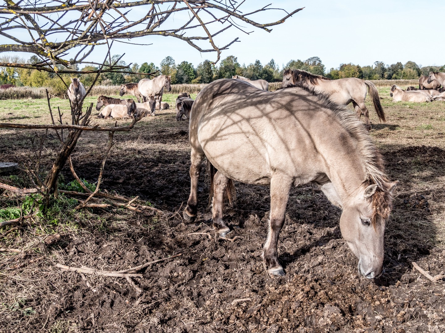 J’aurais pu redescendre et m’arrêter là, mais le but de ma promenade n’est pas encore atteint. Au bout de la réserve se trouve ce que je suis venue voir spécifiquement : les koniks de la Lielupe. Les koniks sont de petits chevaux semi-sauvages, une race ancienne et rustique que l’on trouve encore en Pologne mais qui était autrefois plus répandue. Courts sur pattes, trapus et dotés d’un poil épais, ils sont parfaitement adaptés aux hivers rigoureux de cette région d’Europe.
