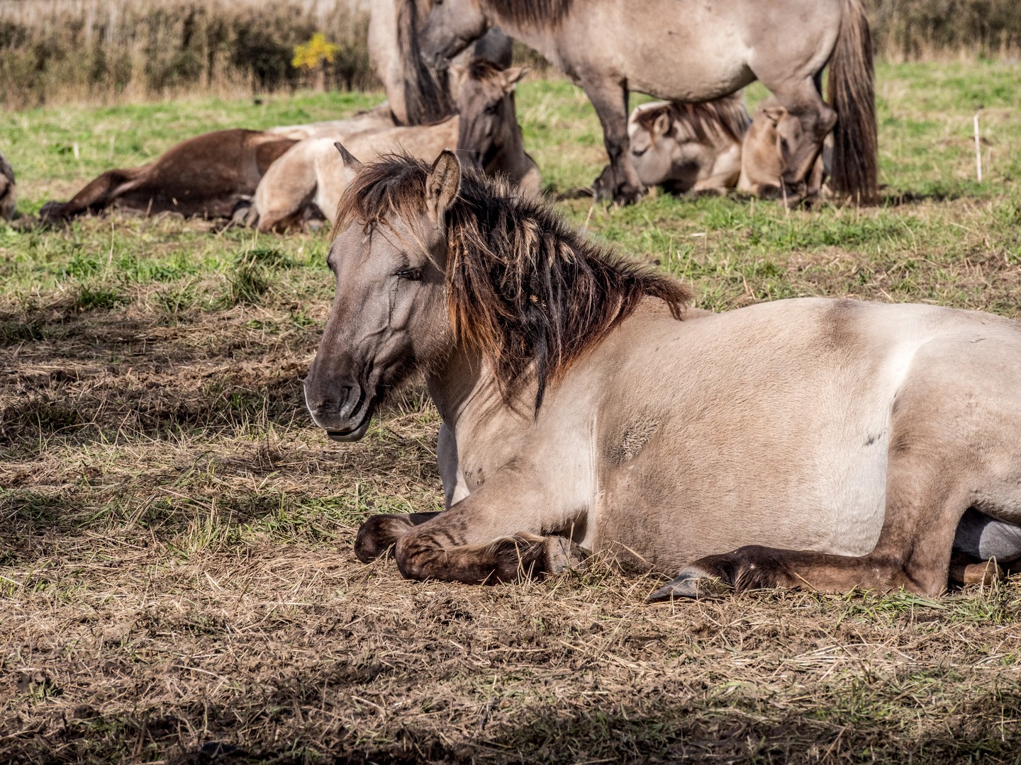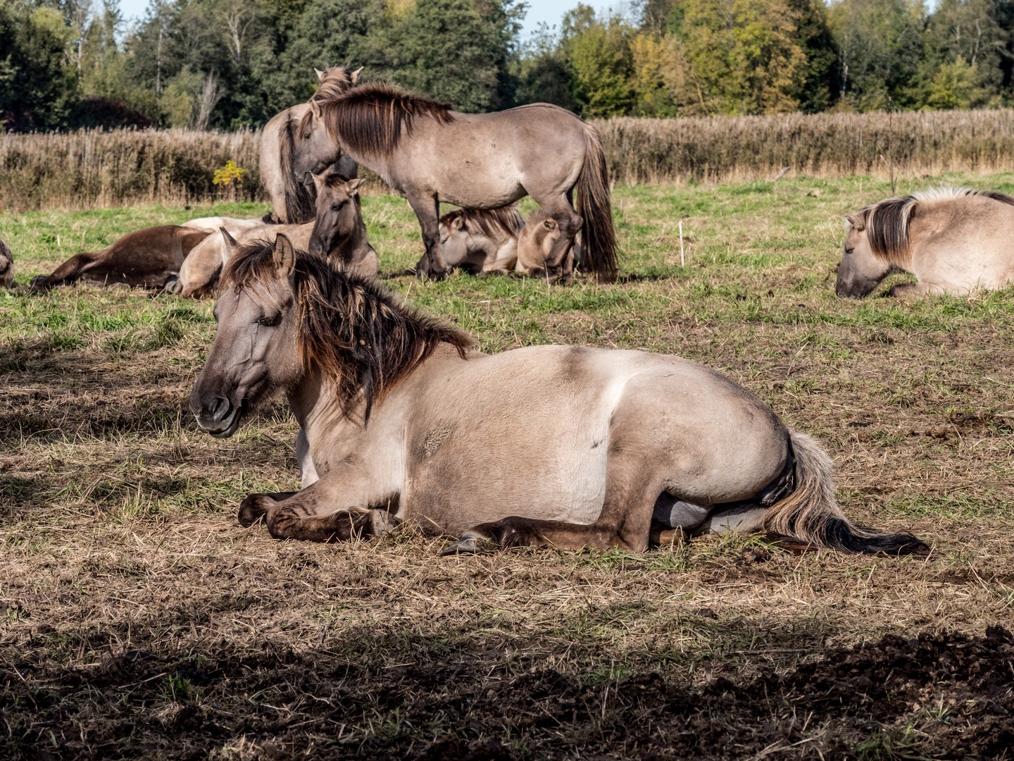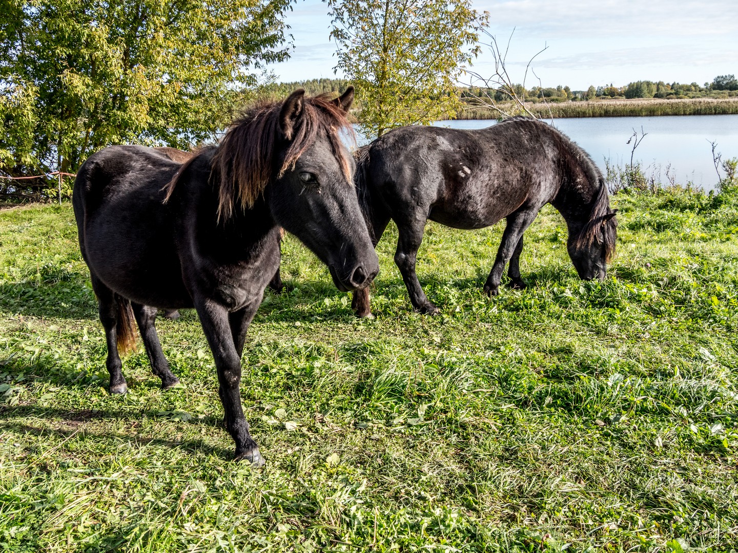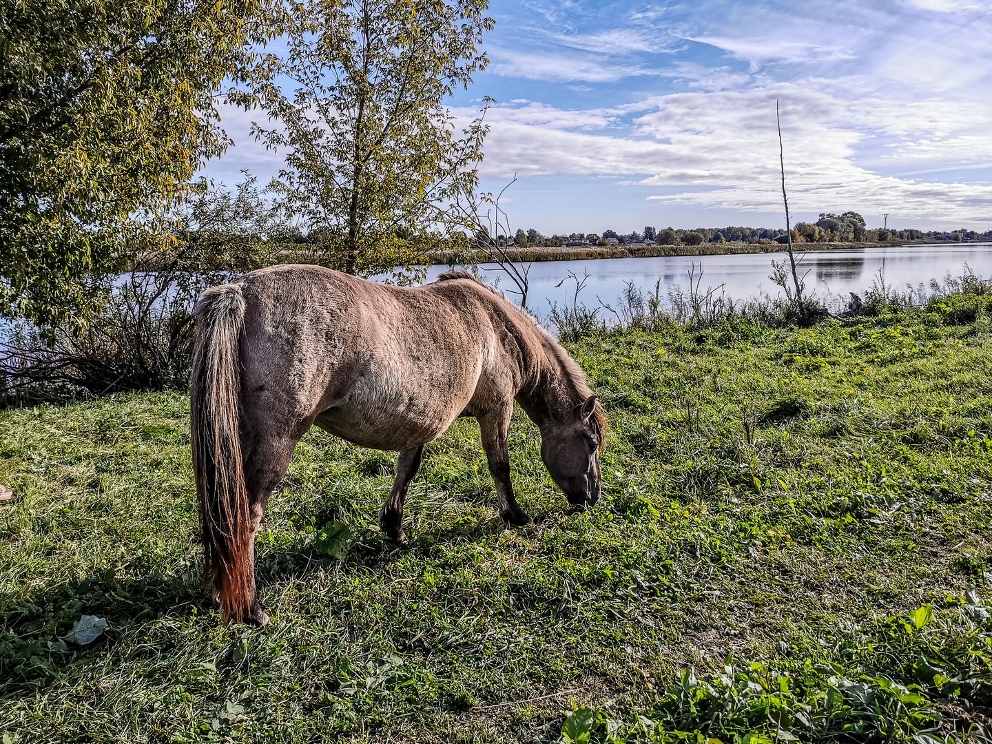 J’aurais pu redescendre et m’arrêter là, mais le but de ma promenade n’est pas encore atteint. Au bout de la réserve se trouve ce que je suis venue voir spécifiquement : les koniks de la Lielupe. Les koniks sont de petits chevaux semi-sauvages, une race ancienne et rustique que l’on trouve encore en Pologne mais qui était autrefois plus répandue. Courts sur pattes, trapus et dotés d’un poil épais, ils sont parfaitement adaptés aux hivers rigoureux de cette région d’Europe.