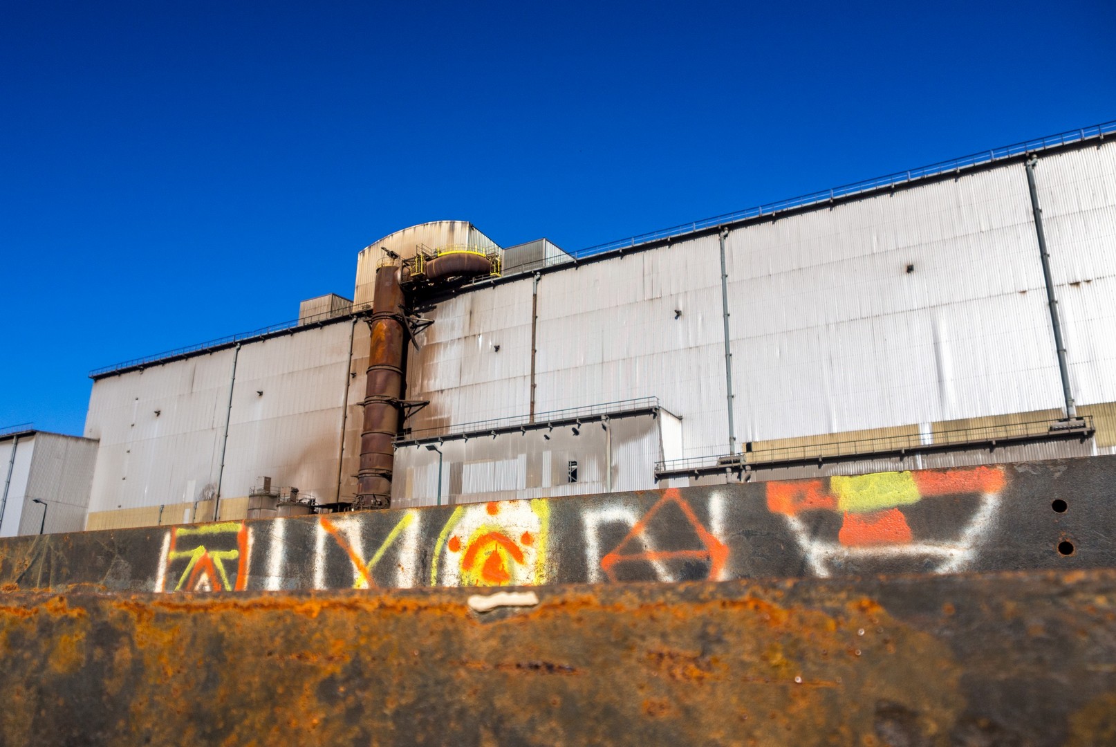 Mais ce jour-là, il faisait beau, le printemps s‘annonçait… une luminosité qui faisait éclater les rouges et les oranges de la rouille. Bien orange, c’est aussi la couleur de la porte du Rockerill, une ancienne forge transformée en salle de concert et centre culturel. Le Rockerill, j’en ai souvent entendu parler, j’en ai entendu vanter le côté brut, clash et la qualité de ses activités. Ce jour-là, il restera inaccessible, de l’autre côté du fleuve. Il faudra donc revenir pour juger sur pièce.