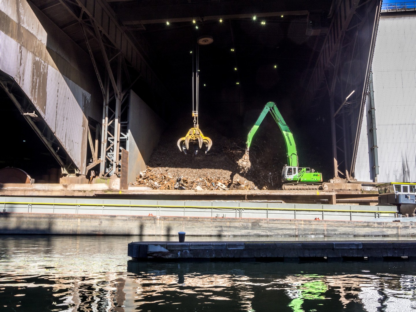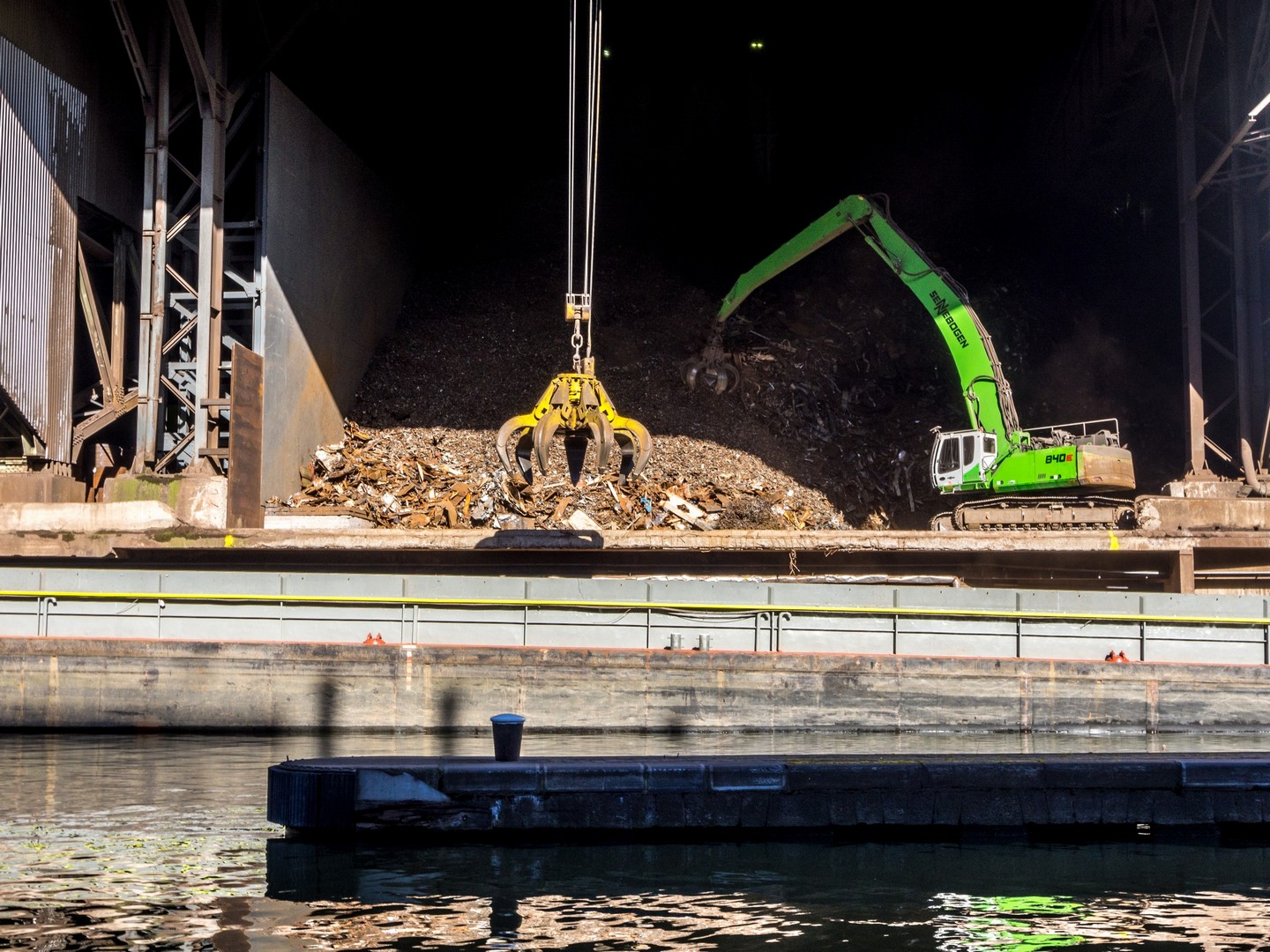 Une petite marche digestive n’étant pas de trop, nous voilà partis le long des chemins de halage de bords de Sambre. Nous n’avons pas fait 500 mètres que nous nous retrouvons dans un paysage hallucinant, fait d’usines, de hangars, de pelleteuses et de grues posées sur d’énormes piles de métal, leur mâchoires toujours remplies de matériau qu’elles déversent dans des péniches qui attendent d’être remplies pour repartir. Le tout, dans le bruit assourdissant du fer et de l’acier que l’on broie et qui frotte. Les vestiges de l’industrie lourde qui ont fait la prospérité de Charleroi avant de la plonger dans le marasme. C’est à la fois grandiose, flippant, moche mais prenant aux tripes.