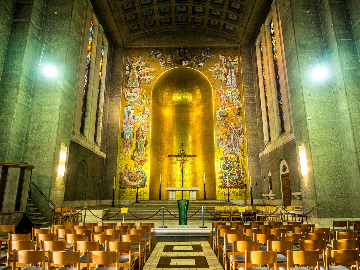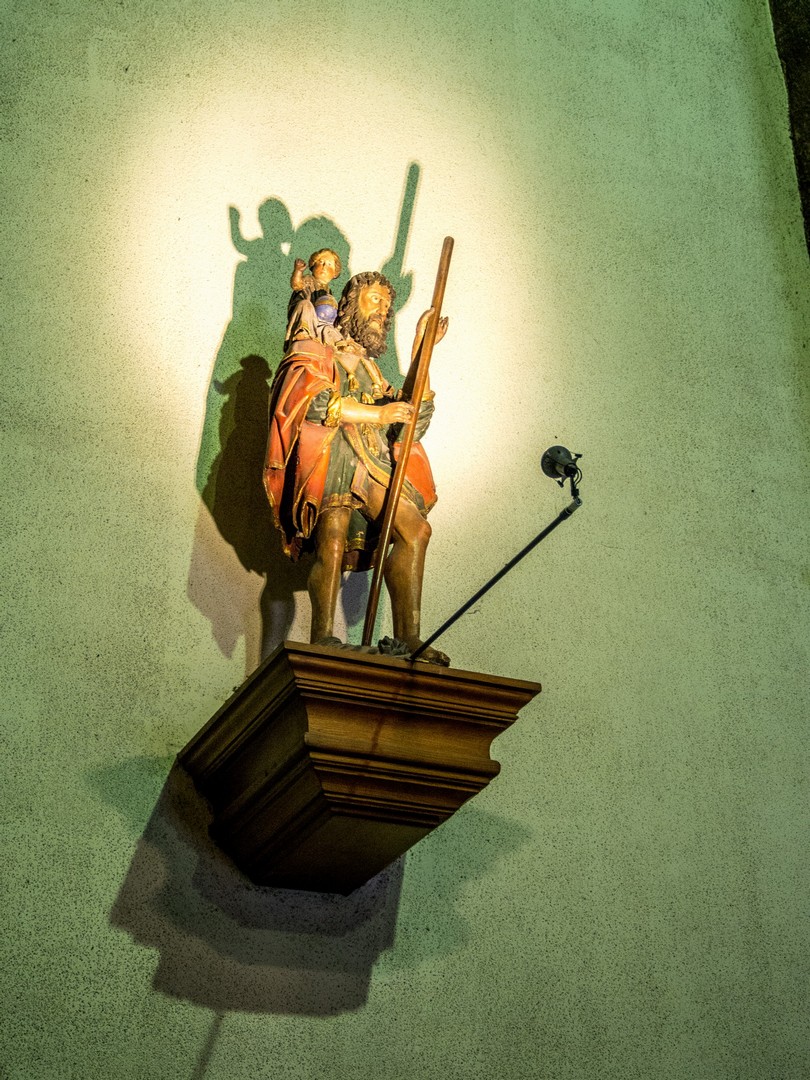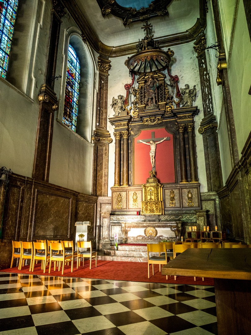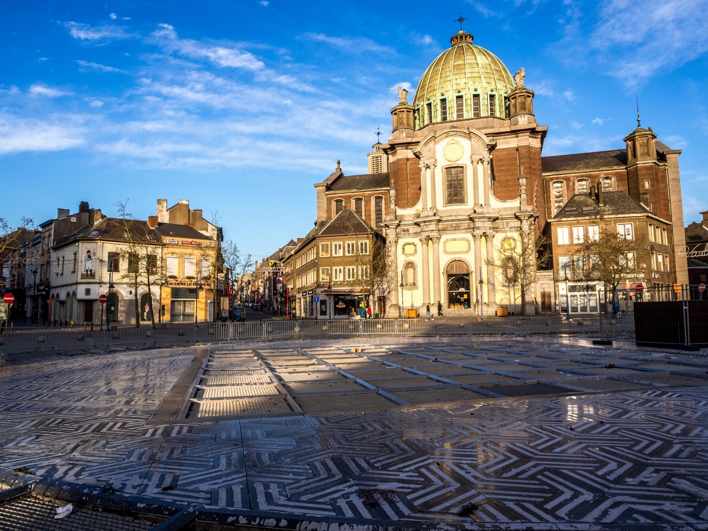 Et tout en haut, m’y voilà arrivée : la Place Charles II, du nom du roi d’Espagne qui régnait lorsque Charleroi fut fondée. C’est le siège du pouvoir à Charleroi, pouvoir communal avec l’hôtel de ville, pouvoir spirituel avec l’insolite église Saint-Christophe. Je n’allais quand même pas louper de visiter une église dédiée au saint-patron des voyageurs ! Le voilà d’ailleurs, une vieille statue qui le représente, portant Jésus sous les traits d’un enfant pour traverser un fleuve. Quand je disais que cette église est étrange, je ne rigolais pas : si sa partie la plus ancienne est baroque, elle a été fortement agrandie dans les années 30 et avec ses mosaïques dorées, elle a plus l’air d’une église byzantine qu’autre chose. Avec la lumière du soleil couchant entrant à flot via la porte grande ouverte de l’église, l’effet est de toute beauté.