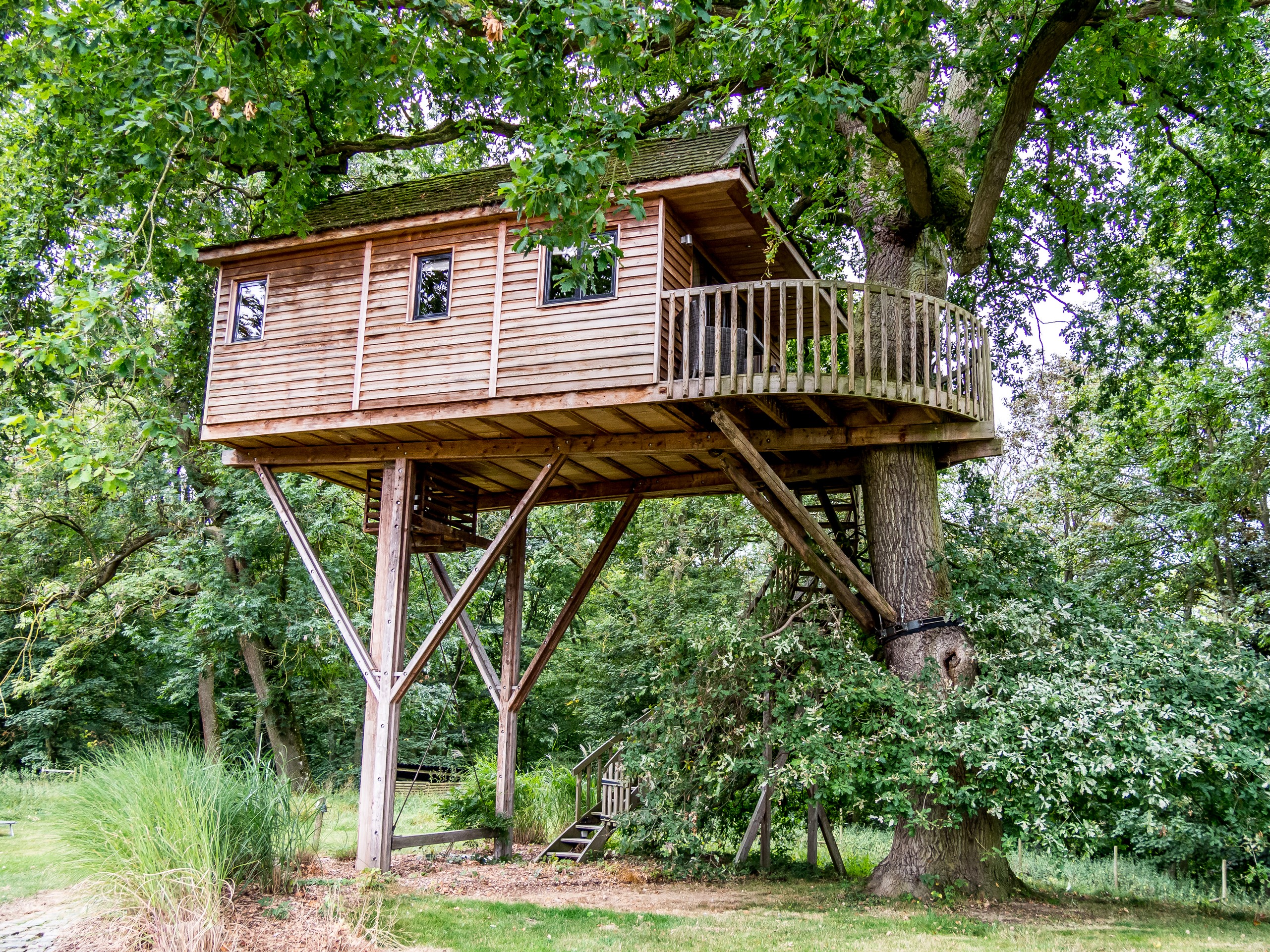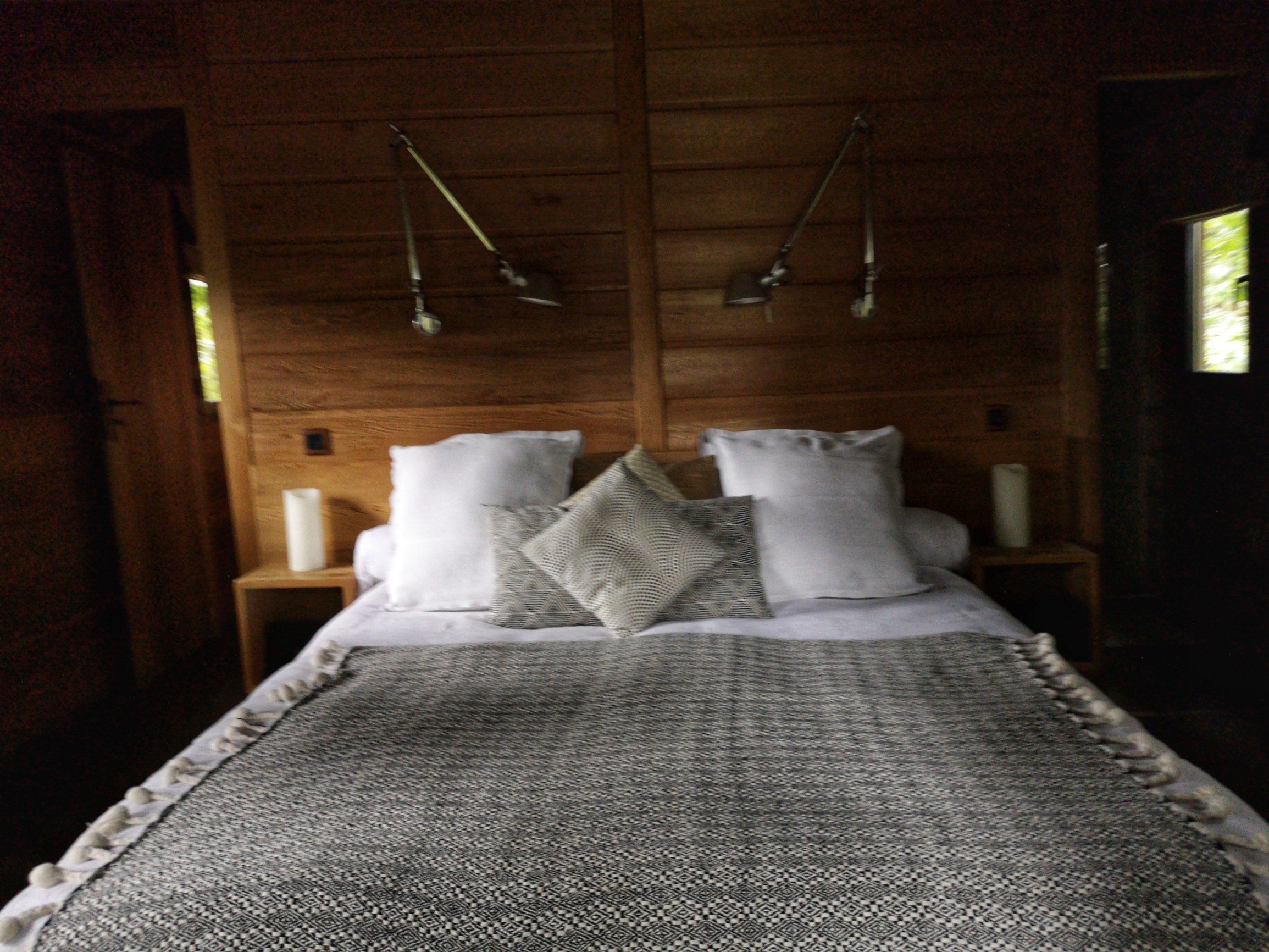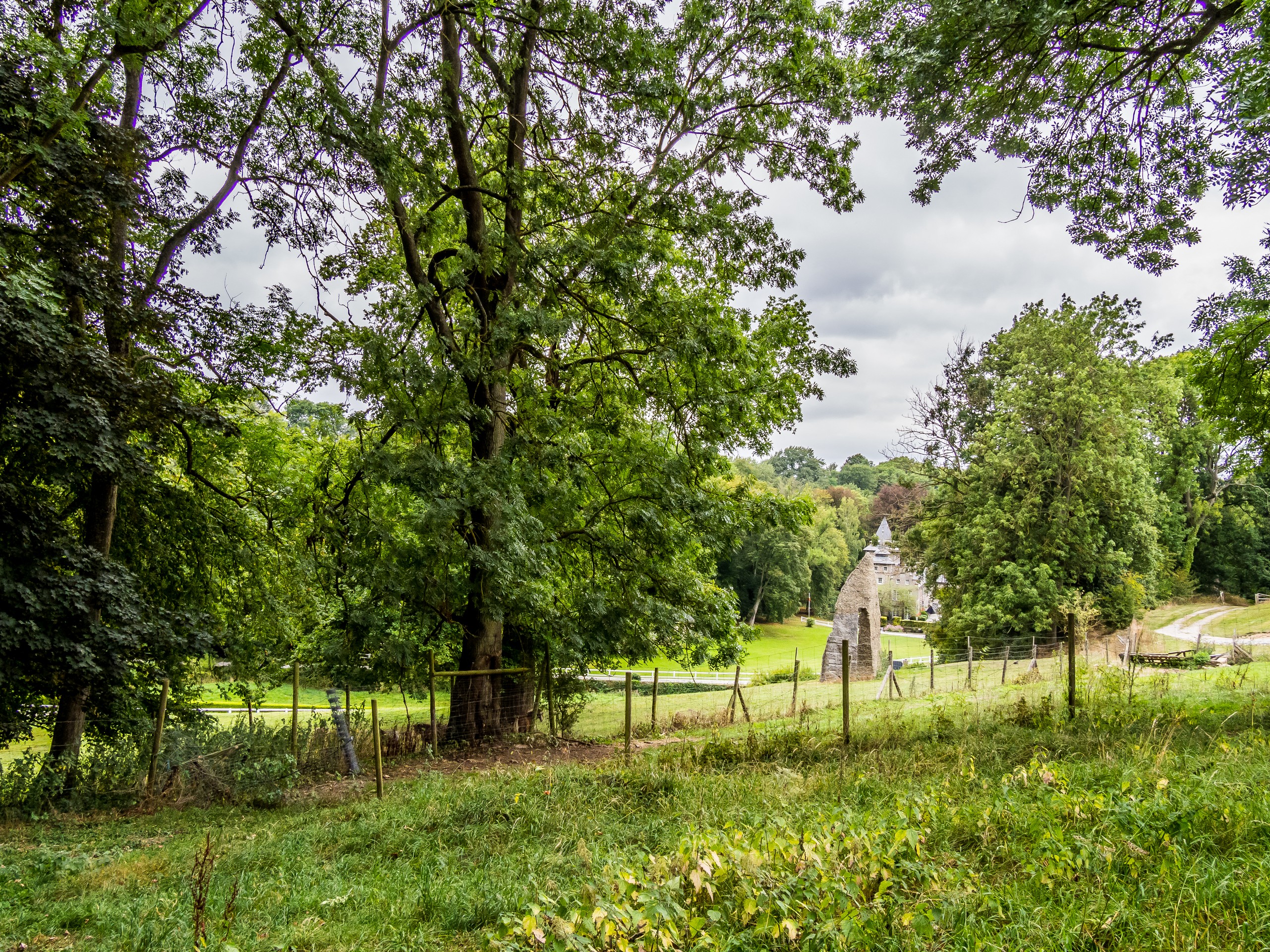 C’est donc à regret que nous quittons le château pour notre dernière étape de la journée, pas très loin de là à Arquennes. un charmant village que nous aurons traversé plusieurs fois à la recherche de ce fameux endroit : la Cabane de Marie. Imaginez-vous dans le parc d’un château (encore un, ça fera le 4ème après celui de Thuin et de Feluy aperçus depuis la route), le Château de la Rocq, et dans ce domaine, une grande cabane perchée sur les branches d’un chêne. Vous pensez que ce sera rustique à l’intérieur avec un pauvre lit et une toilette sèche ? Eh bien non ! C’est peut-être bien rustique mais du rustique de luxe ! Grand lit, baignoire et douche, un patio pour admirer le parc. Bref, une vraie chambre d’hôtel de bonne tenue… mais perchée. Je n’ai qu’une envie, sauter sur le grand lit, et priez pour qu’on oublie de venir vérifier la cabane avant la nuit pour que je puisse y rester. Comptez environ 300 Euros pour ce moment en pleine nature.