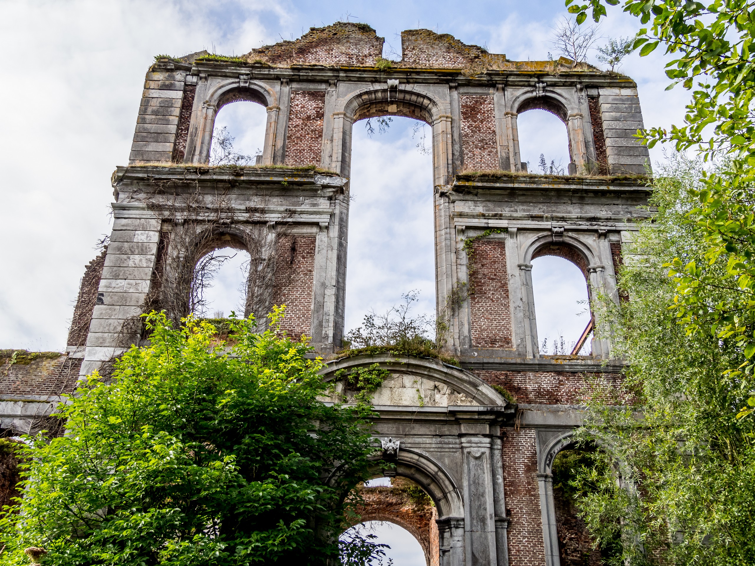Après cette petite promenade, nous remontons en voiture, direction Charleroi. Sur le chemin, nous allons nous arrêter brièvement à l’Abbaye d’Aulne. Du moins, les ruines de l’abbaye. Construite là où un prieuré bénédictin existait depuis 657, cette abbaye cistercienne aura un rayonnement important durant les siècles de son existence, suivant les aléas de la Thudinie, Le XVIIIe, le siècle d’or de l’abbaye se termine brutalement avec l’arrivée des révolutionnaires français qui la pillent et la brûlent presque tout entière. Ce qui restera sera démantelé et revendu. Il reste donc des ruines particulièrement romantiques et un beau domaine qui est à présent un site protégé . Je l’avais visité il y a quelques années et j’ai encore le souvenir du contraste entre le parc et les jardins bien tenus entourés de majestueux pans de façades et de murs sans toit.