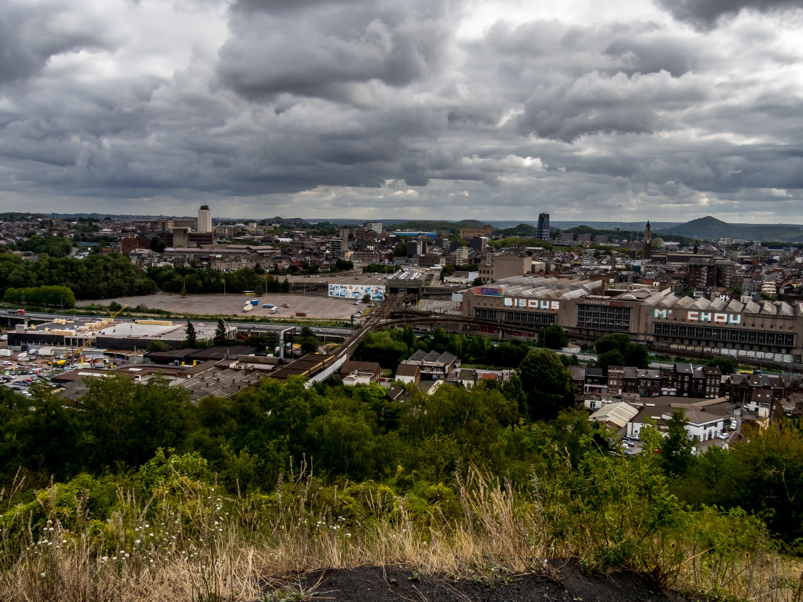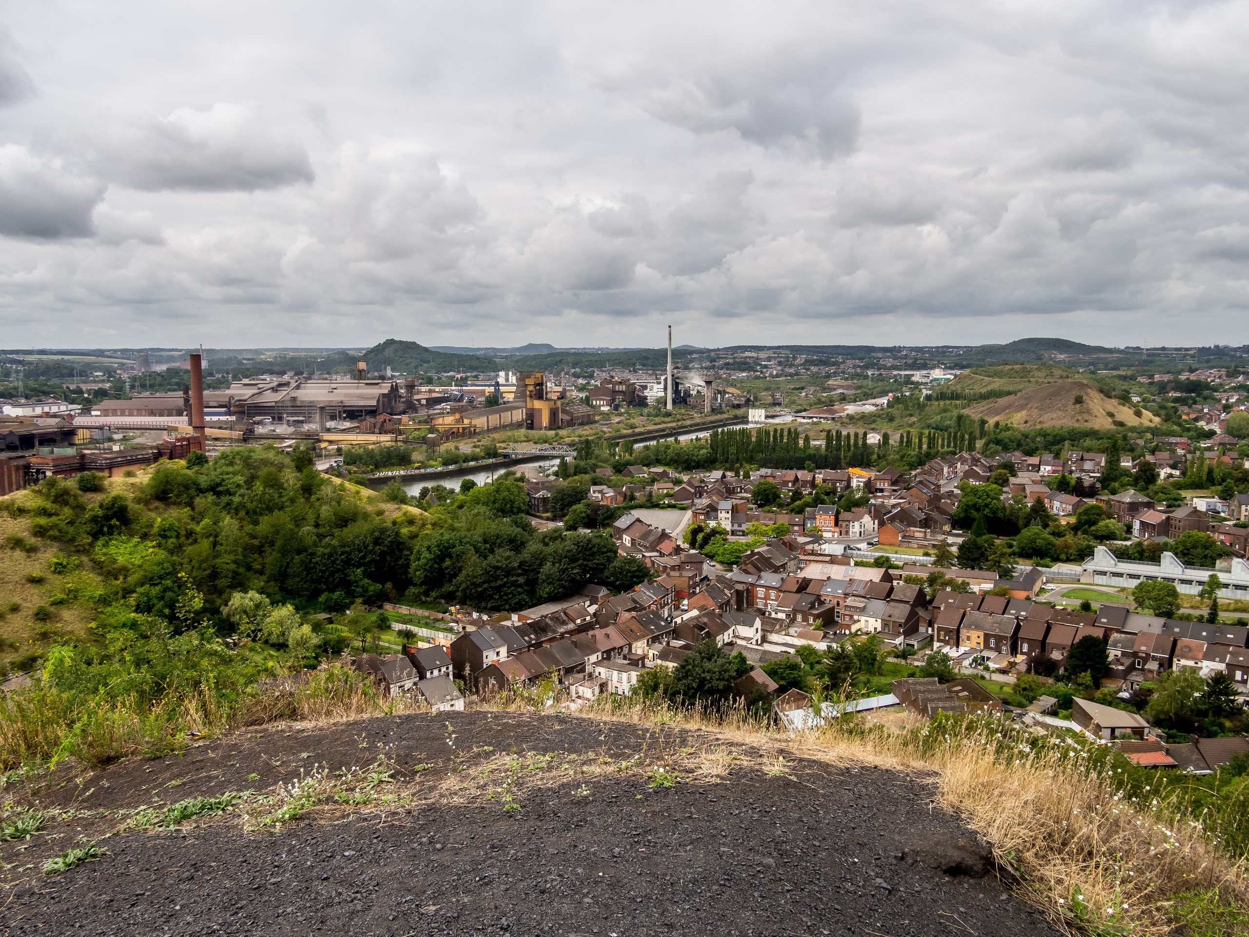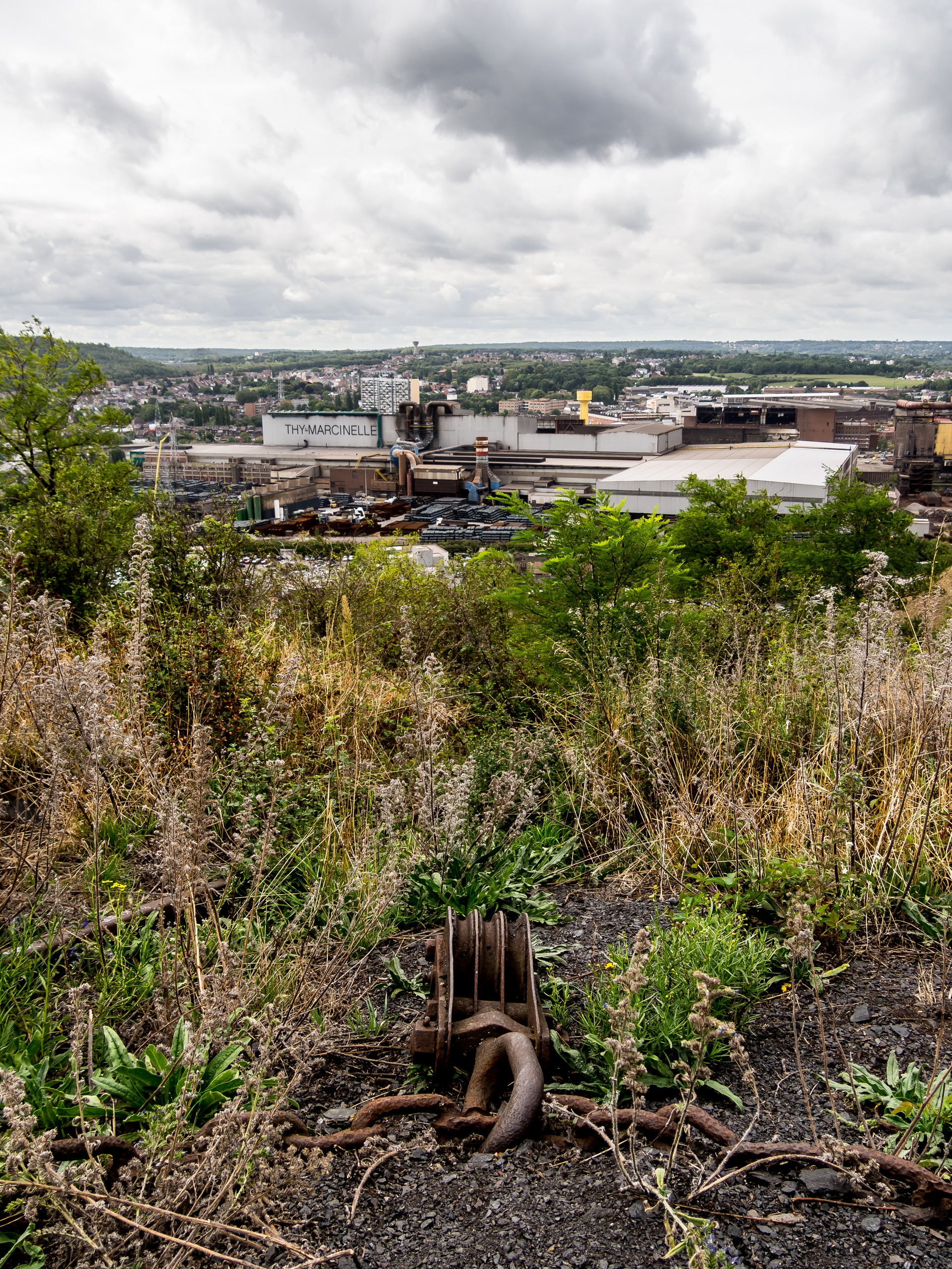 Une fois arrivées au sommet par contre, c’est un paysage époustouflant : tout Charleroi se révèle à nous, son tissu urbanistique mais surtout, ses usines, immenses, partout, elles mangent le paysage… L’horizon est aussi parsemé de plusieurs terrils qui forment comme une chaînes de petits sommets isolés tout le long du paysage et tout à côté, dans votre dos lorsque vous regardez Charleroi, comme lové contre le terril, il y a Dampremy et ses petites maisons ouvrières toutes serrées les unes contre les autres. C’est un véritable témoignage de la résilience de la nature aussi ! Sur les flans près du sommet, noyée dans l’herbe, reste un dernier témoignage des charbonnages : une poulie qu’on a découvert récemment qui est laissée là, comme un dernier souffle de l’épopée industrielle du charbonnage. Sur le sommet du terril, crois-moi, Lectrice, Lecteur, on se sent comme les rois et reines du monde !
