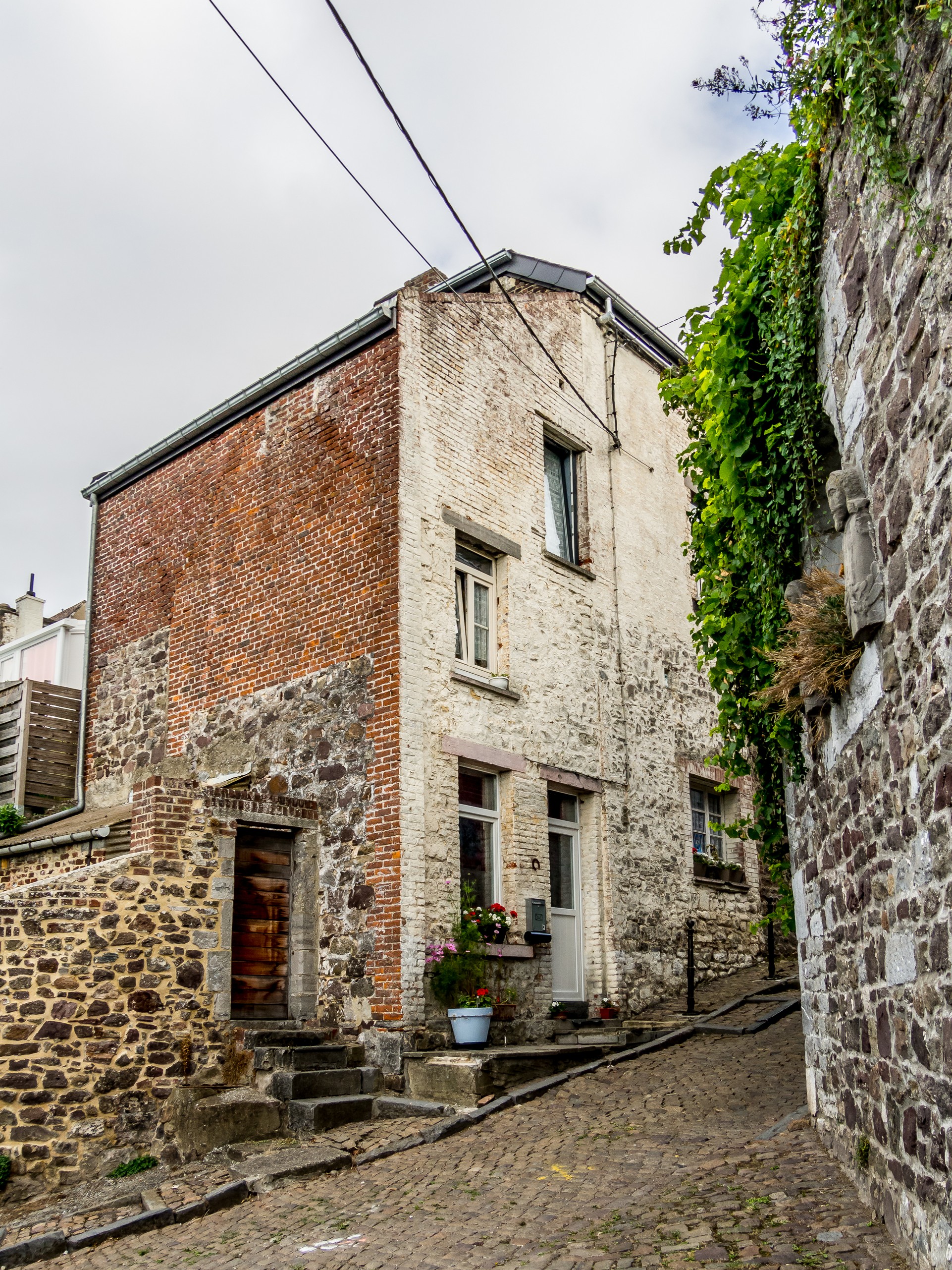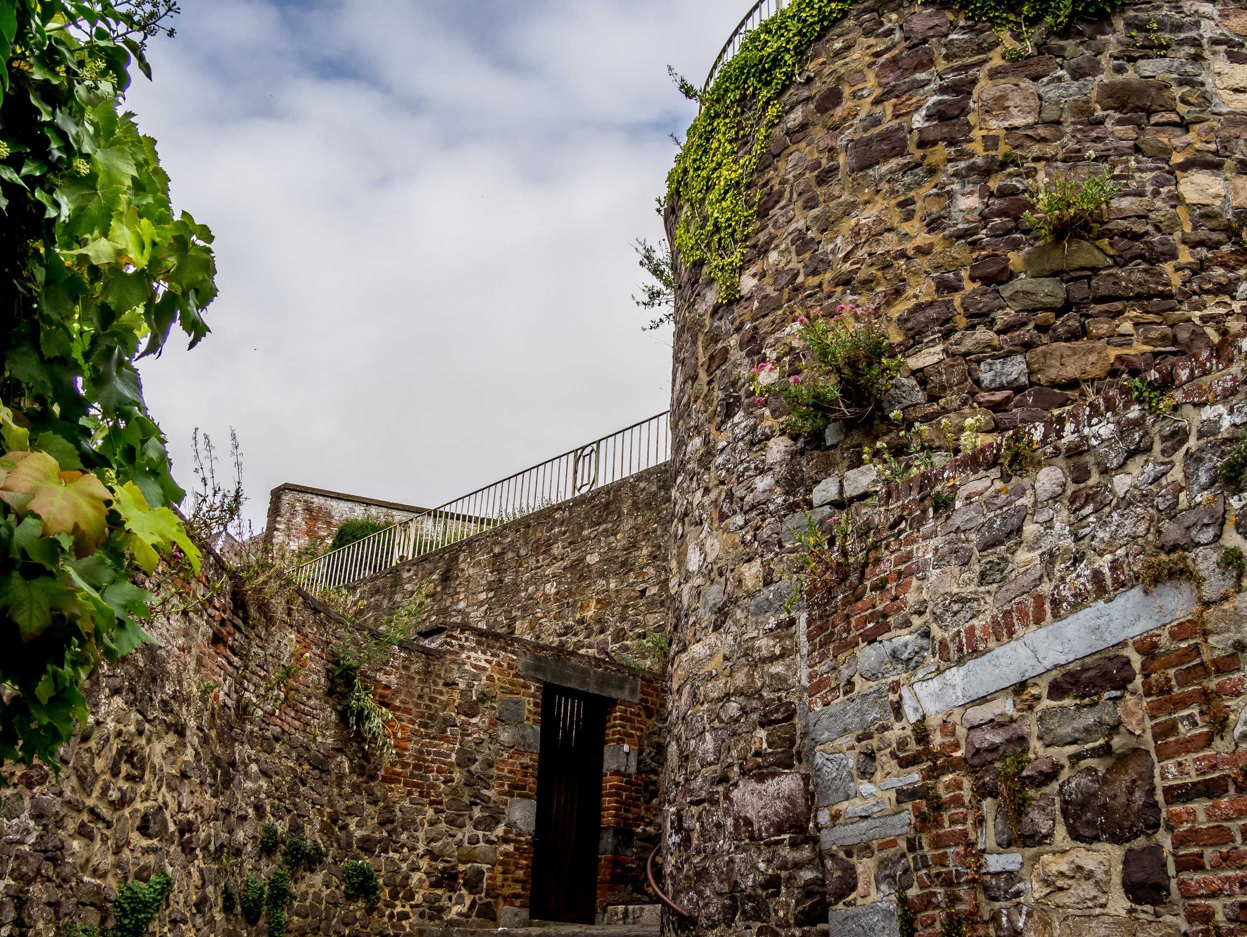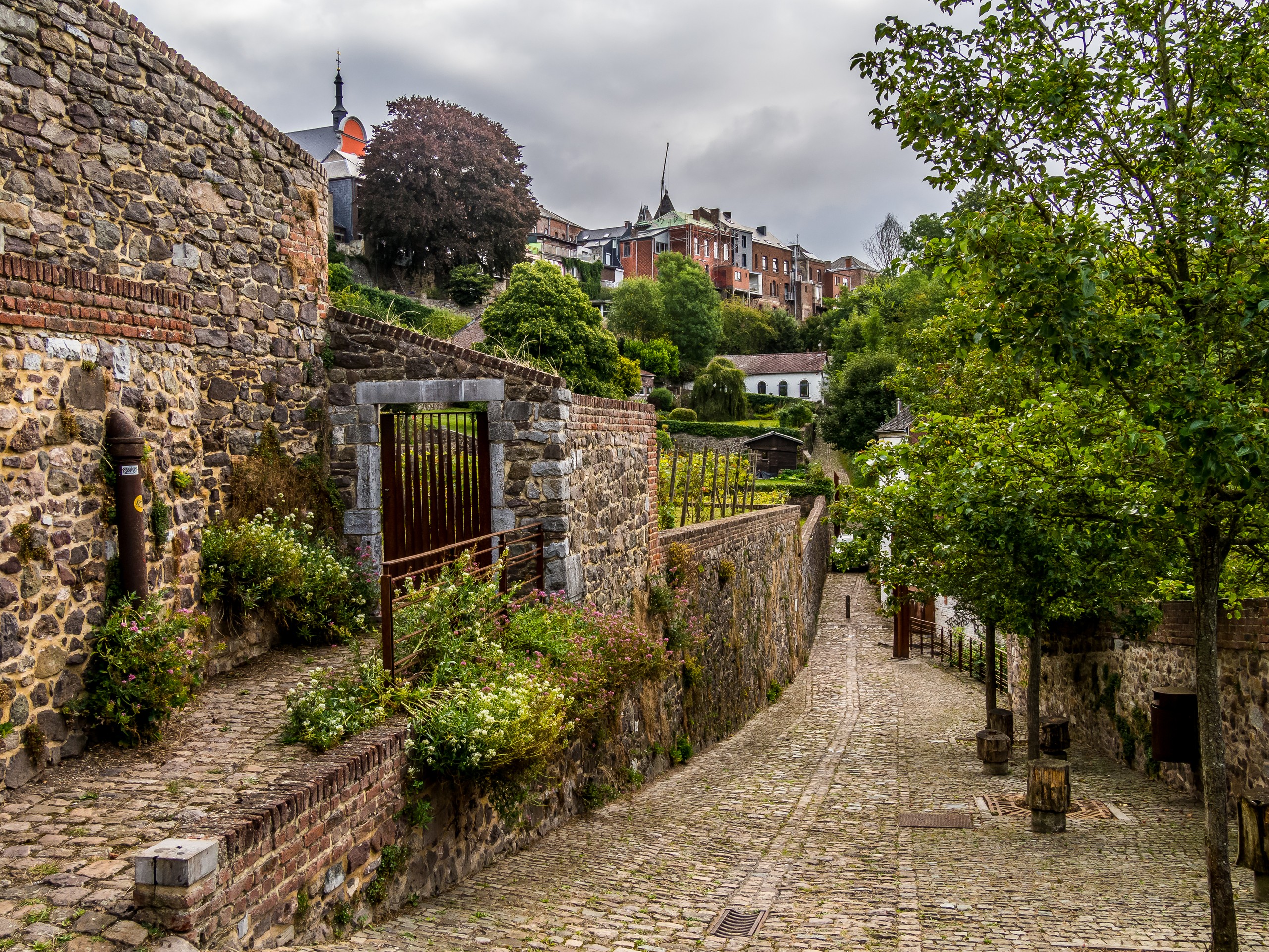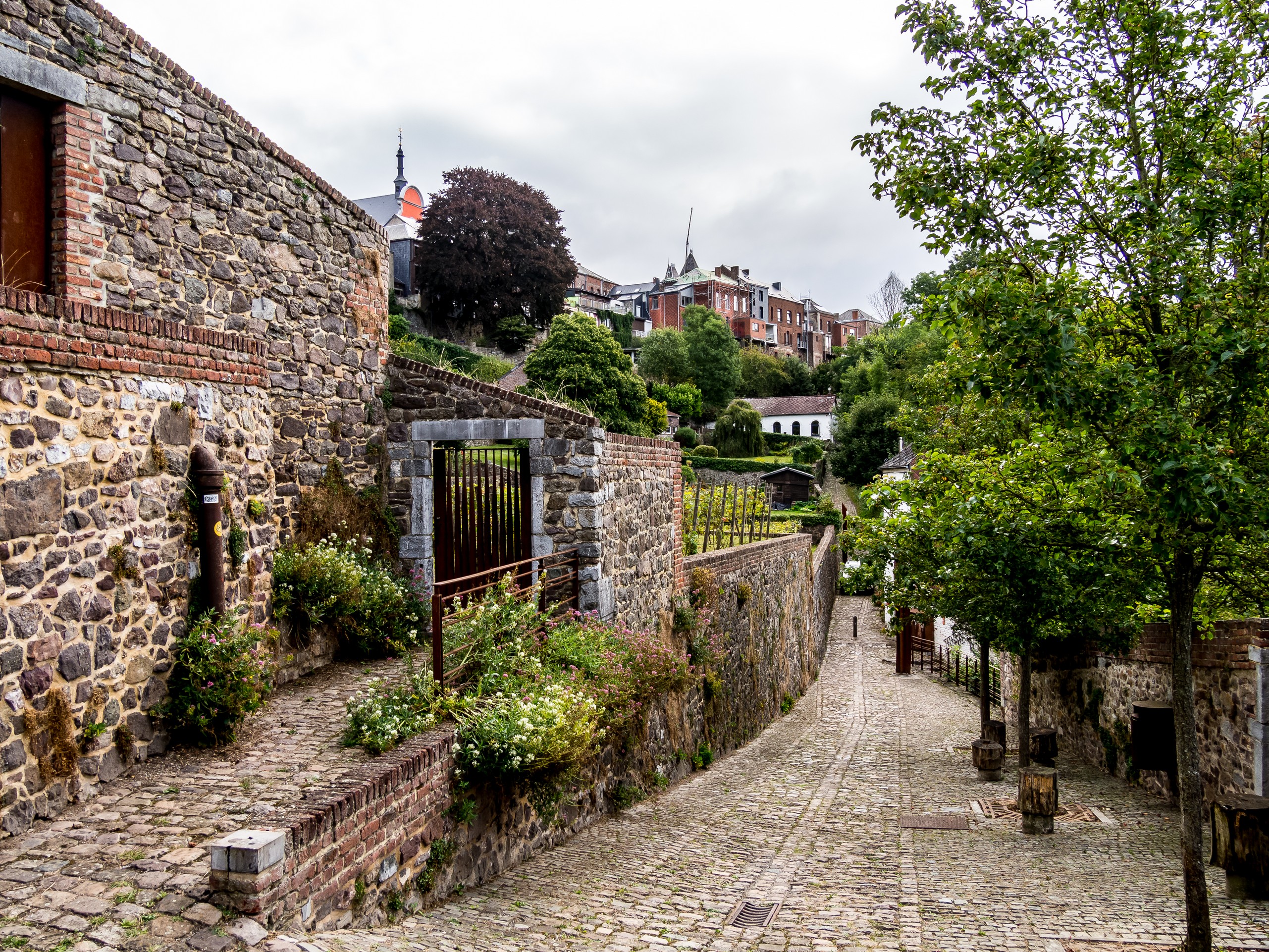 Si la ville est connue, c’est aussi pour ses jardins suspendus. Les jardins suspendus, ce sont une suite de jardins de potagers en terrasse qui grimpent tout le long du versant sud de la vallée de la Biesmelle. Au fur et à mesure des changements des murs de fortification, les habitants de Thuin se sont emparés de ces pans de terre devenus libres pour pouvoir y cultiver, chaque espace étant précieux vu la topographie de la ville. L’une des particularités des jardins est que les pierres utilisées comme mur, du grès, emmagasinent la chaleur. Cela a donc pour effet de donner une flore presque méditerranéenne aux jardins. On y cultive même la vigne ! Une promenade balisée vous fait parcourir tous les jardins. Soit depuis la ville haute, soit depuis la rivière. C’est cette deuxième option que nous avons choisi pour nous promener, guidées par les différents panneaux le long du parcours. On grimpe donc le long des anciennes fortifications. La plupart du temps, les plantes grimpantes ont pris d’assaut les murs. Les portes à claire-voie laissent entrevoir de jolis jardins, quelques fois fleuris, quelques fois potagers, coupés au cordeau ou plus sauvage. C’est charmant, d’autant plus que la vieille ville avec ses maisons de pierres et ses pavés contribue à renforcer l’ambiance d’un endroit un peu hors du temps. Un vrai festival pour ceux qui aiment la photo !