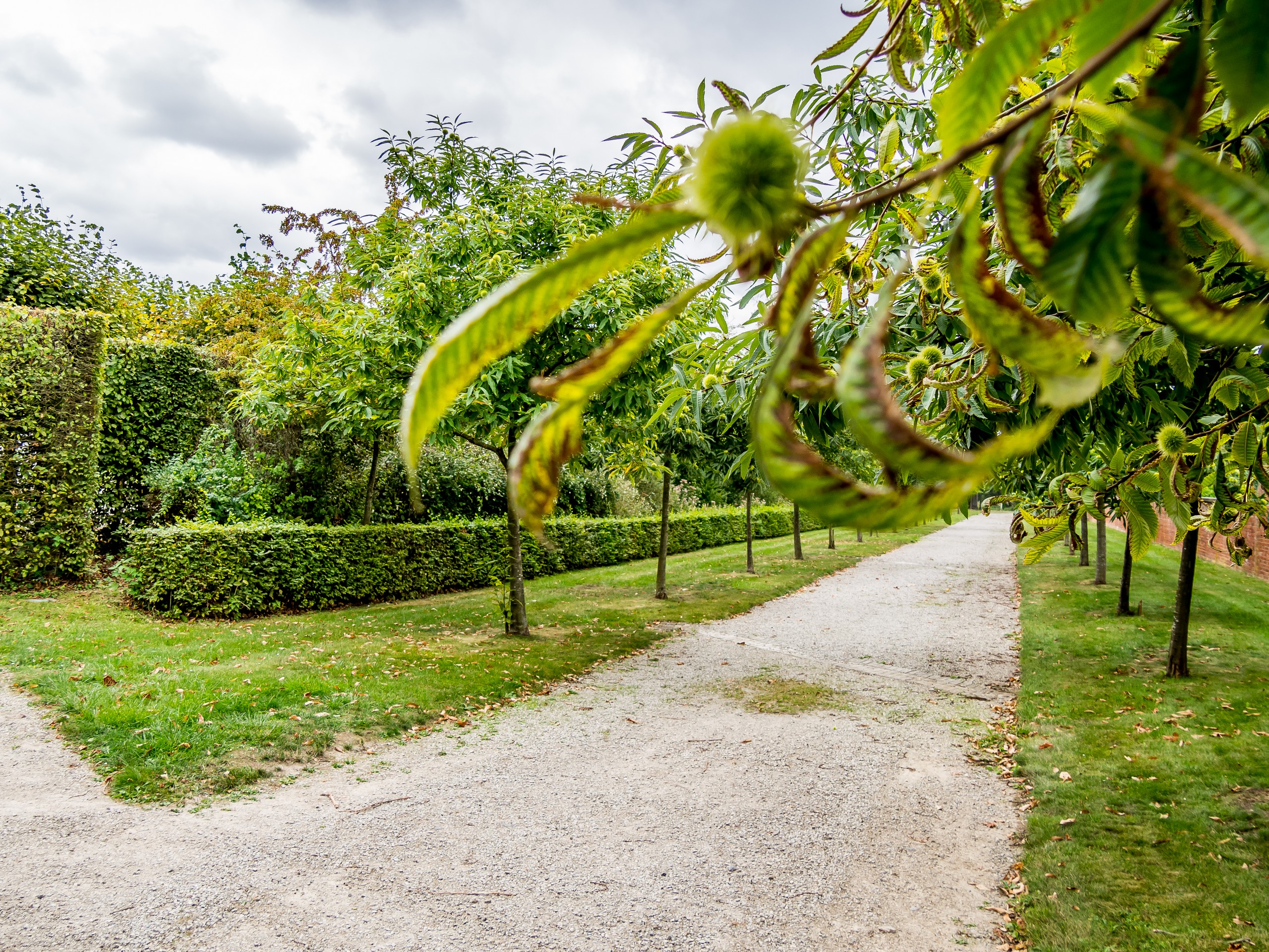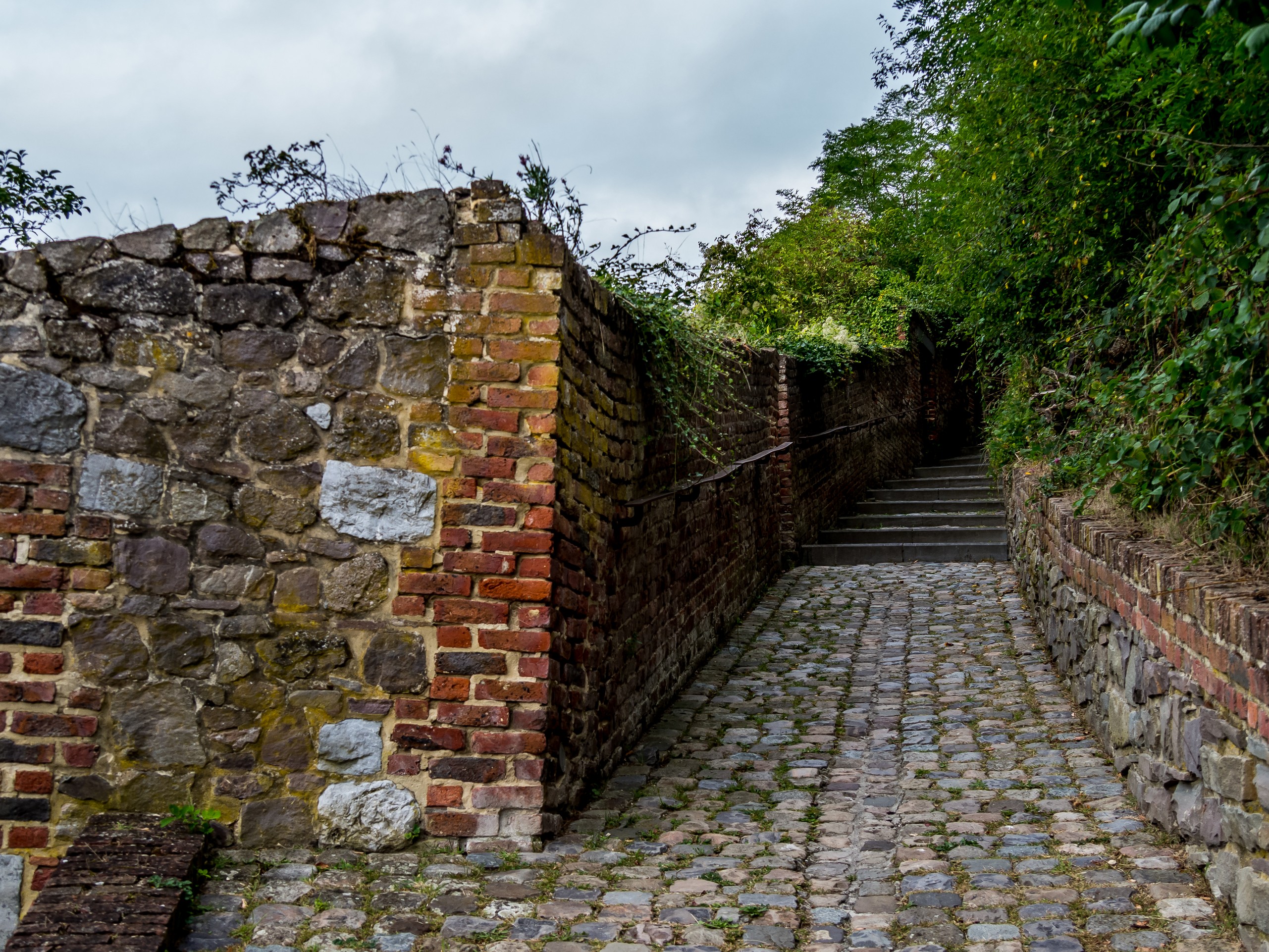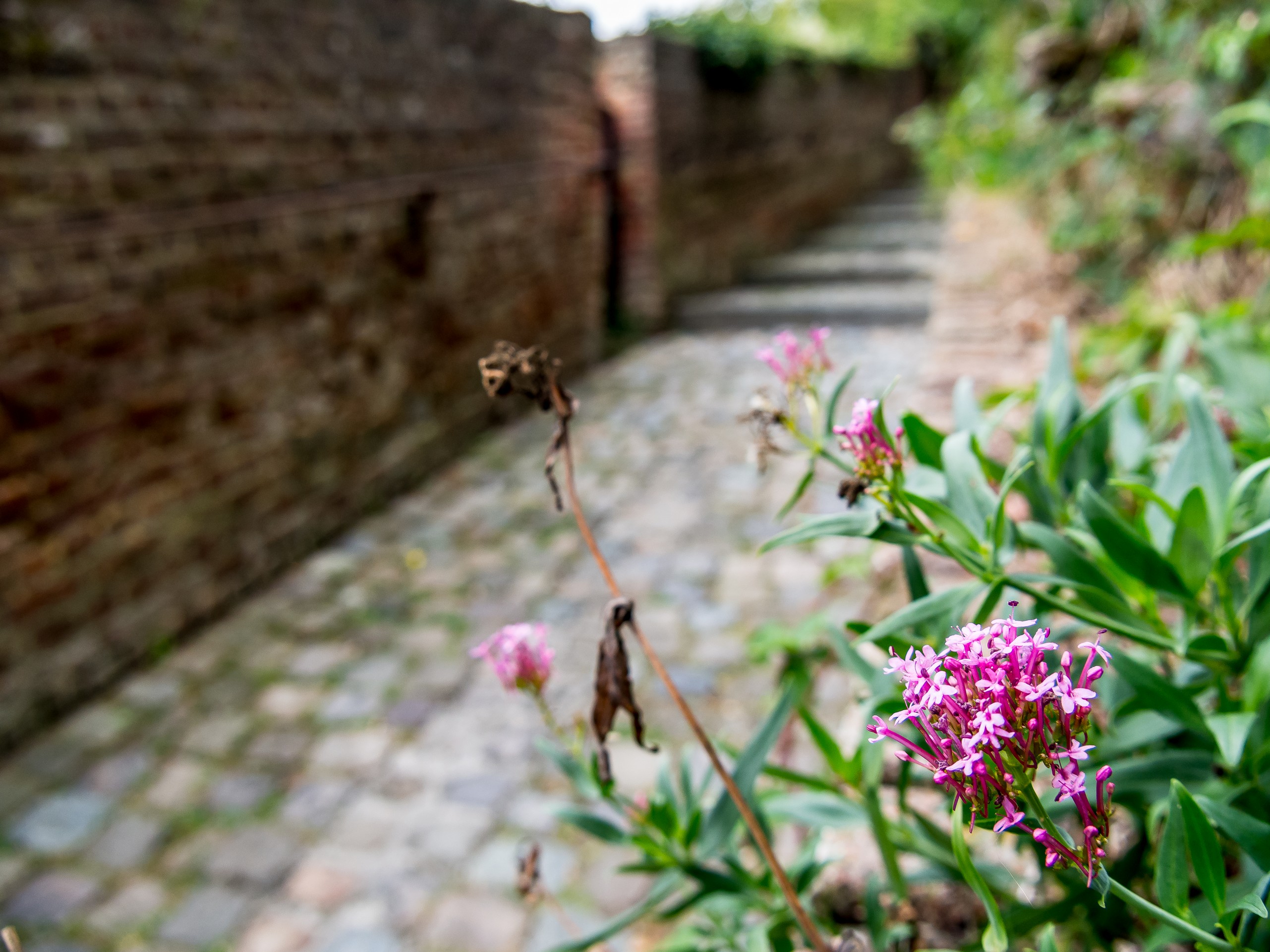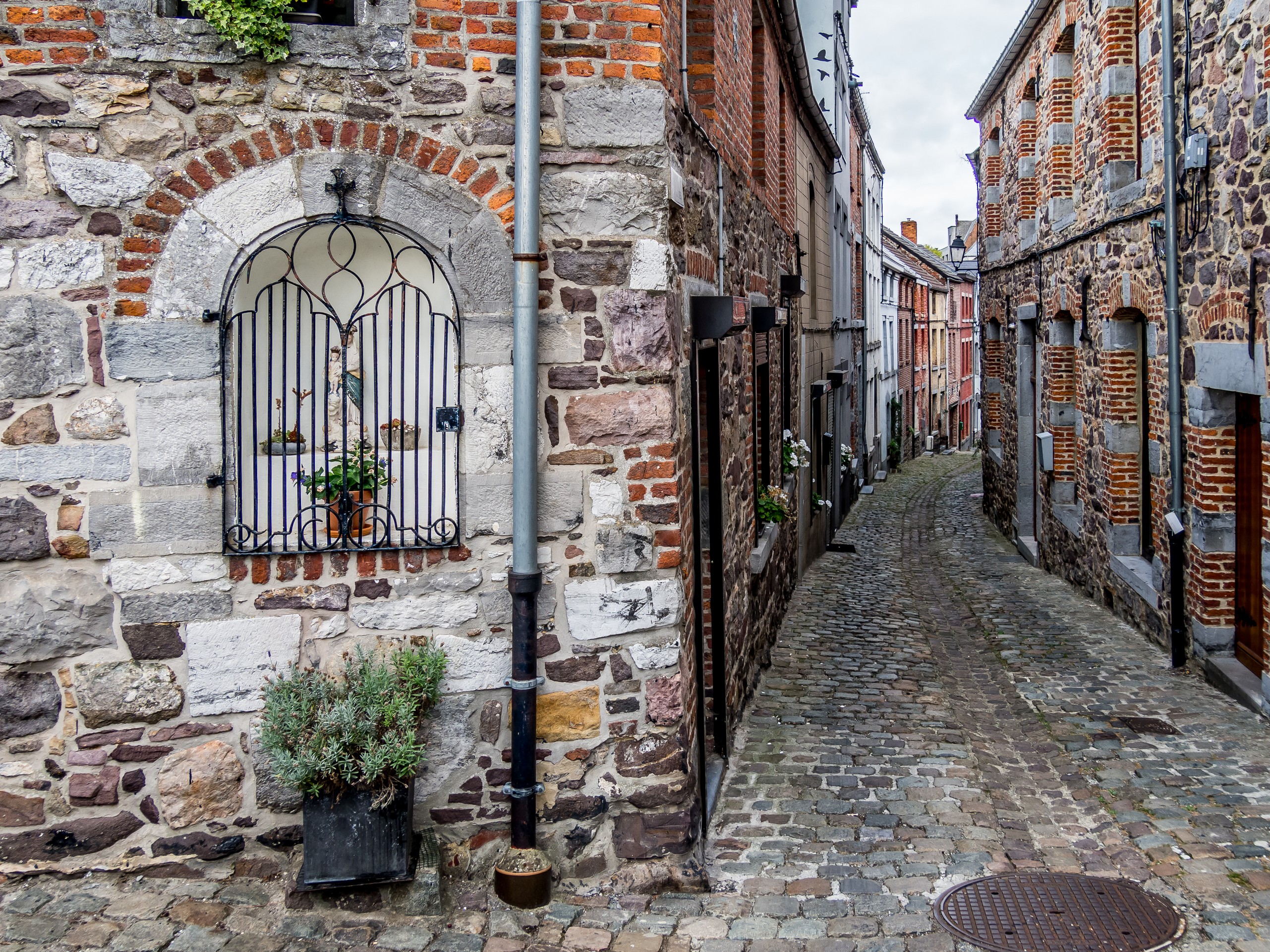 Si la ville est connue, c’est aussi pour ses jardins suspendus. Les jardins suspendus, ce sont une suite de jardins de potagers en terrasse qui grimpent tout le long du versant sud de la vallée de la Biesmelle. Au fur et à mesure des changements des murs de fortification, les habitants de Thuin se sont emparés de ces pans de terre devenus libres pour pouvoir y cultiver, chaque espace étant précieux vu la topographie de la ville. L’une des particularités des jardins est que les pierres utilisées comme mur, du grès, emmagasinent la chaleur. Cela a donc pour effet de donner une flore presque méditerranéenne aux jardins. On y cultive même la vigne ! Une promenade balisée vous fait parcourir tous les jardins. Soit depuis la ville haute, soit depuis la rivière. C’est cette deuxième option que nous avons choisi pour nous promener, guidées par les différents panneaux le long du parcours. On grimpe donc le long des anciennes fortifications. La plupart du temps, les plantes grimpantes ont pris d’assaut les murs. Les portes à claire-voie laissent entrevoir de jolis jardins, quelques fois fleuris, quelques fois potagers, coupés au cordeau ou plus sauvage. C’est charmant, d’autant plus que la vieille ville avec ses maisons de pierres et ses pavés contribue à renforcer l’ambiance d’un endroit un peu hors du temps. Un vrai festival pour ceux qui aiment la photo !