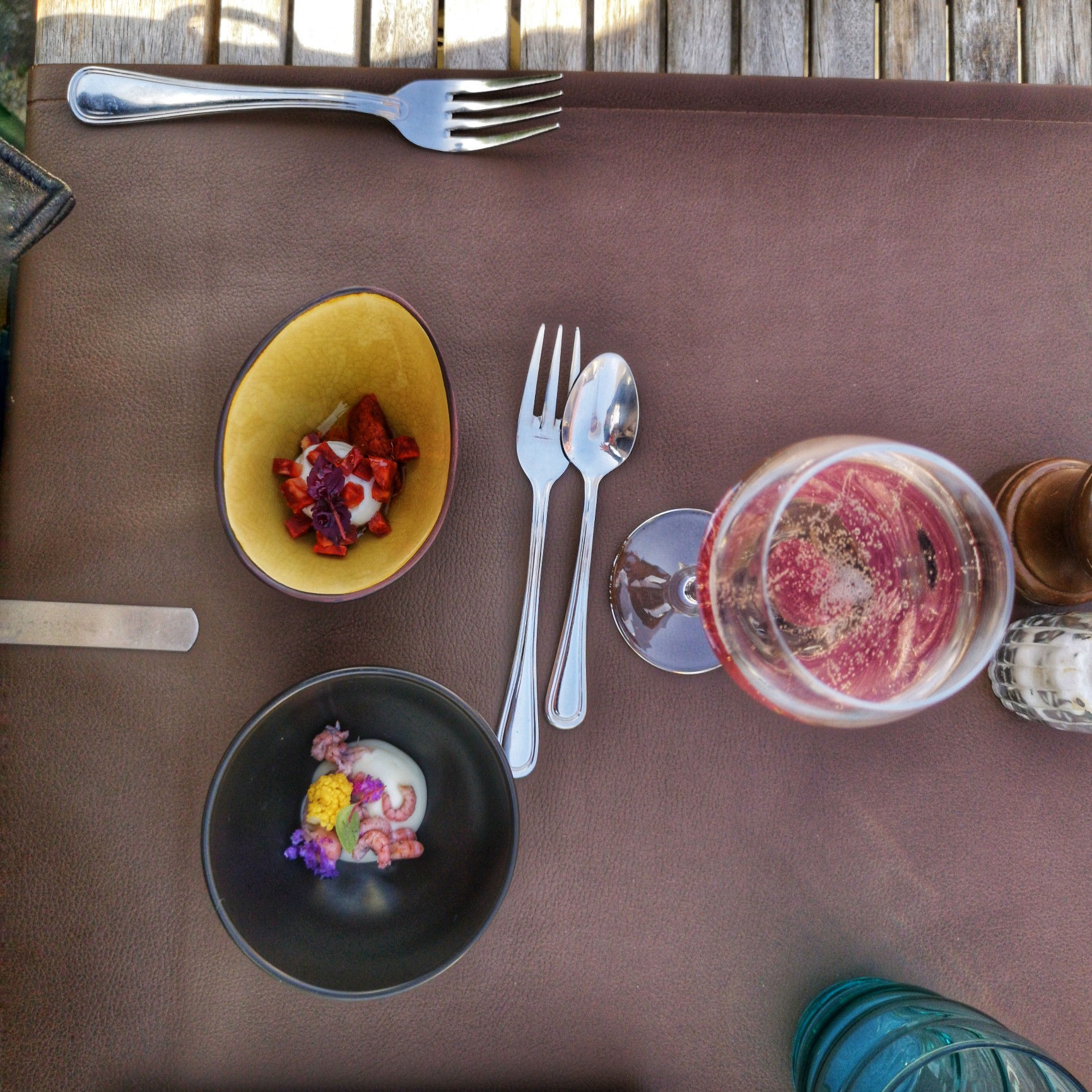 Bonne pioche, le lieu vient de se voir attribuer un Bib gourmand pour son menu. Vite, je passe un coup de fil pour réserver et il n’y a déjà plus de place à l’intérieur du restaurant, il faudra que ce soit sur la terrasse. Ça atteste de la popularité du restaurant alors que nous sommes vendredi midi. D’autant plus que c’est en rase campagne à Hollain, dans la commune de Brunehaut près de Tournai, que se trouve le restaurant à l’allure de fermette. On nous installe promptement dehors, mais je ne vais manquer d’aller jeter un œil à l’intérieur : avec la brique, le bois et un côté déco brocante rustique (en petite touche), c’est vraiment un lieu chaleureux. Et tu ne risques pas de te sentir noyé.e pendant votre repas, Lectrice, Lecteur puisque la salle est limitée à 30 couverts.