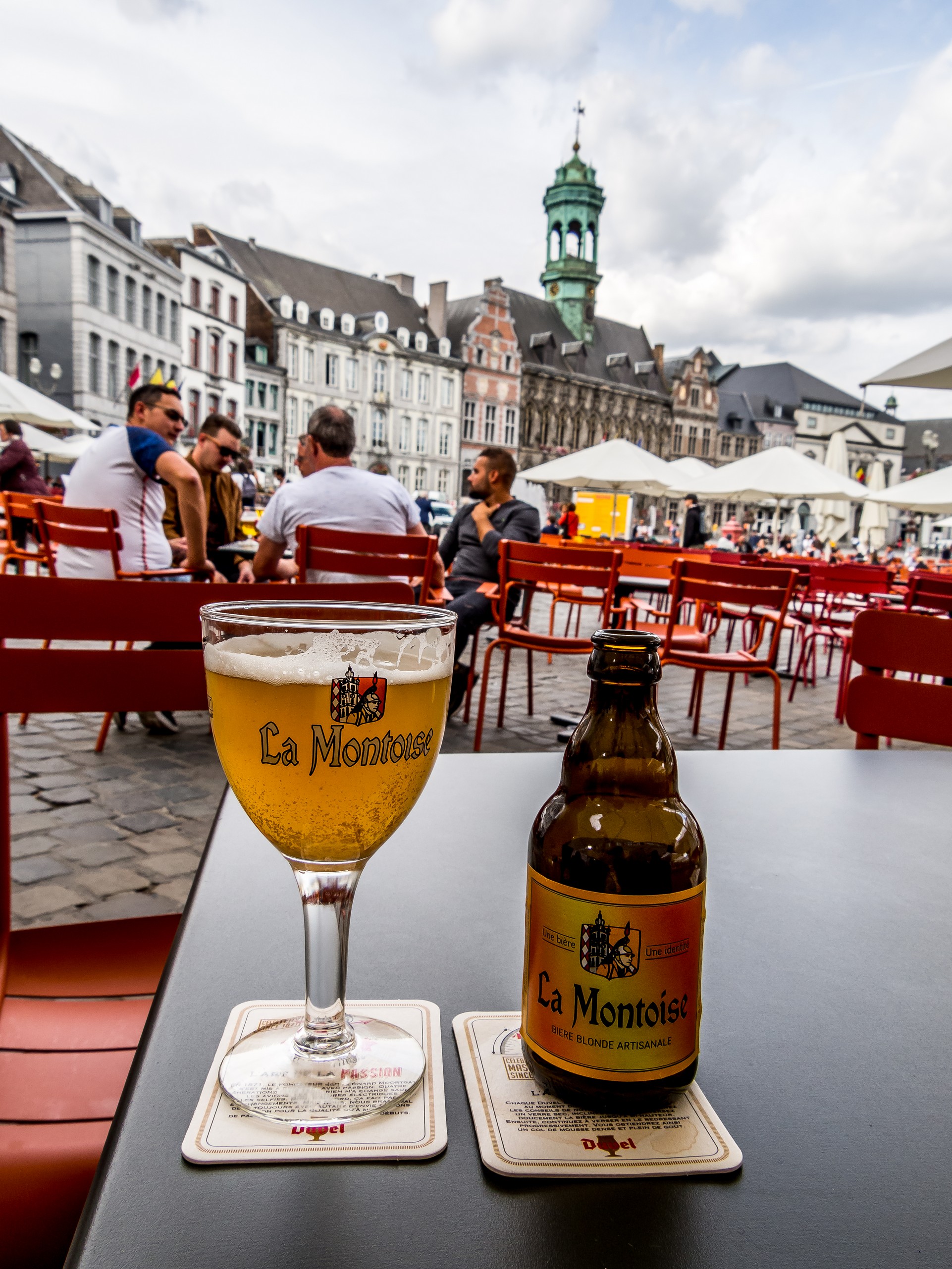 Près de son entrée, on trouve l’étrange figure d’un petit singe assis : le singe de la Grand’Garde. Mais que fait cette étrange statuette ? On estime qu’elle est très vieille en tout cas. Était-ce un exemple du travail d’un apprenti forgeron ? Était-ce l’ancienne enseigne de la taverne qui existait dans les caves de l’Hôtel de Ville ? Était-ce un pilori pour enfants ? On ne sait toujours pas. Par contre, depuis qu’on a placé là le Singe dans les années 30, il est vite devenu la mascotte de la ville et le caresser est une obligation pour quiconque visite Mons. Il apporte bonheur et chance, du moins pour un an. Combien de « Combat dit Lumeçon » a-t-il vu ? Car la Grand-Place de Mons, c’est LE lieu de l’apothéose du Doudou, le combat de Saint-Georges contre le Dragon, une des fêtes folkloriques les plus importantes de Belgique, et inscrite au patrimoine de l’UNESCO. Ce qui frappe aussi quand on est sur la Grand-Place, c’est l’activité, le va-et-vient, le nombre de cafés et de terrasses qu’on y retrouve et c’est sur l’une d’entre elle que François-Xavier et moi allons trinquer à la conclusion de cette belle aventure en Province de Hainaut.
