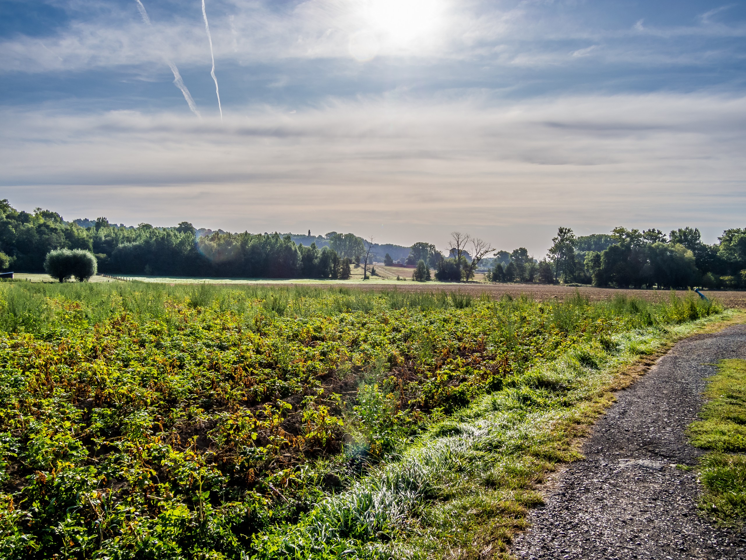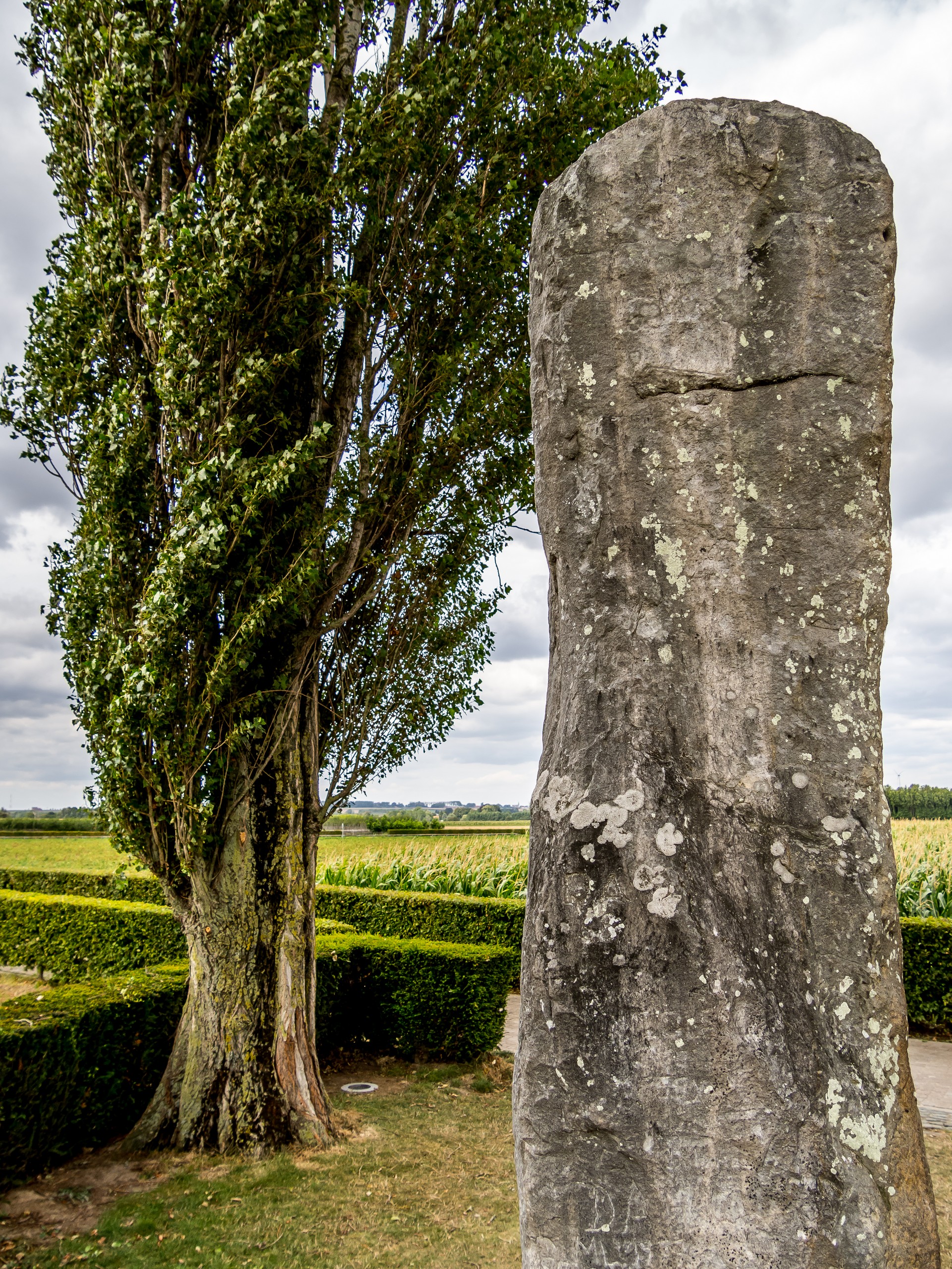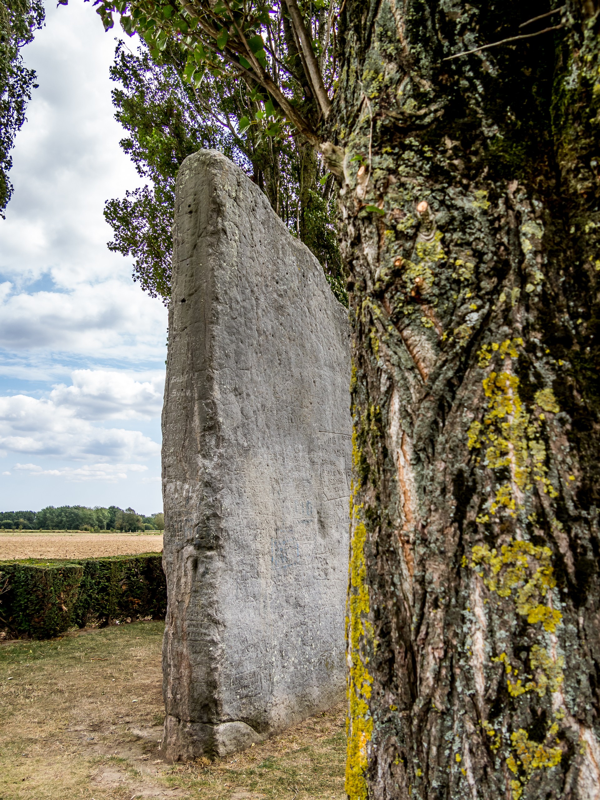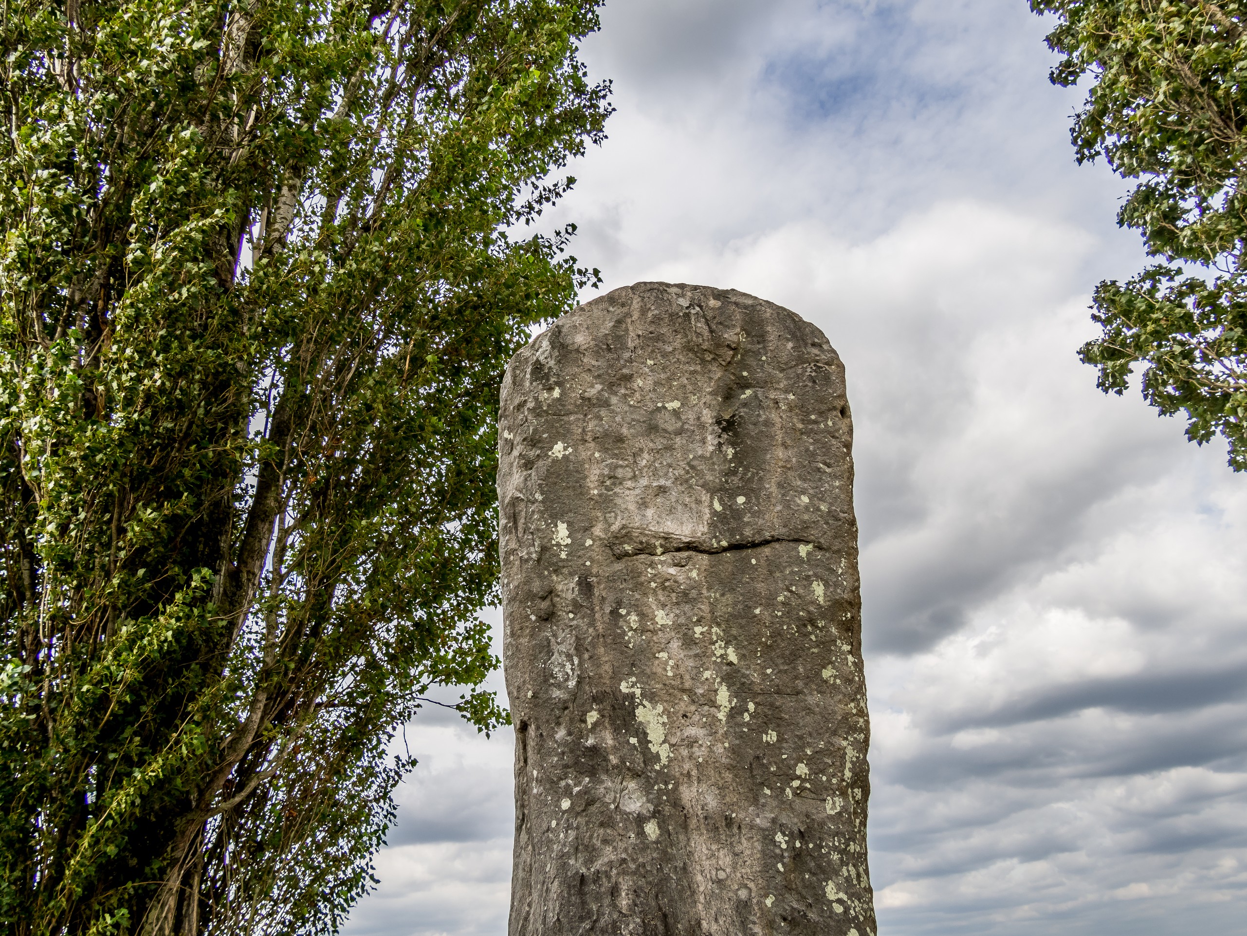 Dans ce paysage grand ouvert de plate campagne, il se passe quand même des choses étranges. Au milieu de champs et des vergers entourés de haies, une pierre dressée se tient toute seule : 4,35m de haut, 3m de large, 60cm d’épaisseur, cette espèce de menhir est là depuis le Néolithique.