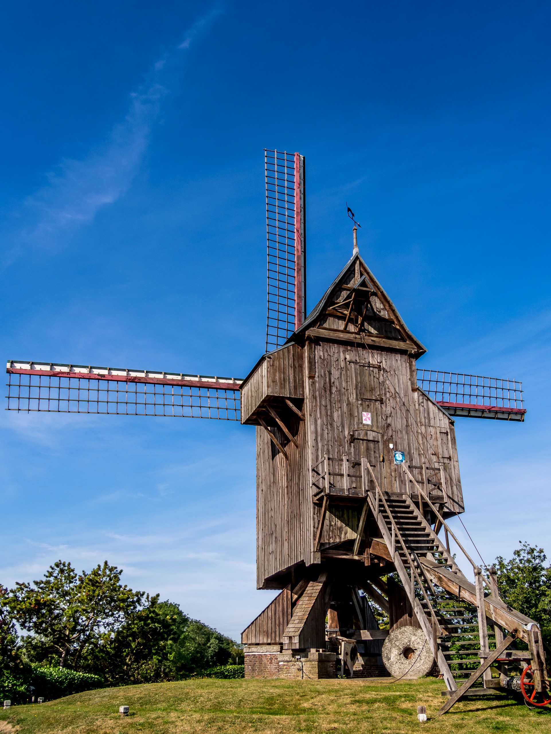 Un « cat » en dialecte, c’est un « chat ». Un mot que l’on utilise encore puisque quand j’étais petite, j’avais un matou tout roux et tout le monde en parlait comme d’un « roux cat ». Le « cat sauvage » est donc la figure d’un chat noir, au dos hérissé par la colère et qui orne le sommet de ce moulin parfaitement conservé. C’est que le Hainaut occidental, terre d’agriculture, comptait de très nombreux moulins à vent et il en reste deux qui sont encore entier : celui du Cat Sauvage et le Moulin de la Marquise à Moulbaix, près de Leuze. Ce Moulin du Cat Sauvage est vieux de plus de 250 ans. Construit entièrement en bois, il est « à corps tournant », c’est à dire qu’il peut pivoter sur son axe. Il est encore en état de fonctionner (un meunier en faisant la démonstration de temps en temps) mais il n’est plus exploité que pour le tourisme. Là-dessus, la fédération du tourisme de la Province du Hainaut a été visionnaire puisque c’est elle qui l’achetât en 1958 pour le préserver de la destruction. Il s’en était d’ailleurs fallu de peu qu’il ne soit démoli ! Il trône donc fièrement sur sa butte, le long de la route qui relie Lessines à Renaix et est l’emblème du Pays des Collines. Pour le visiter, vous pouvez vous adresser à la Maison du Pays des Collines.