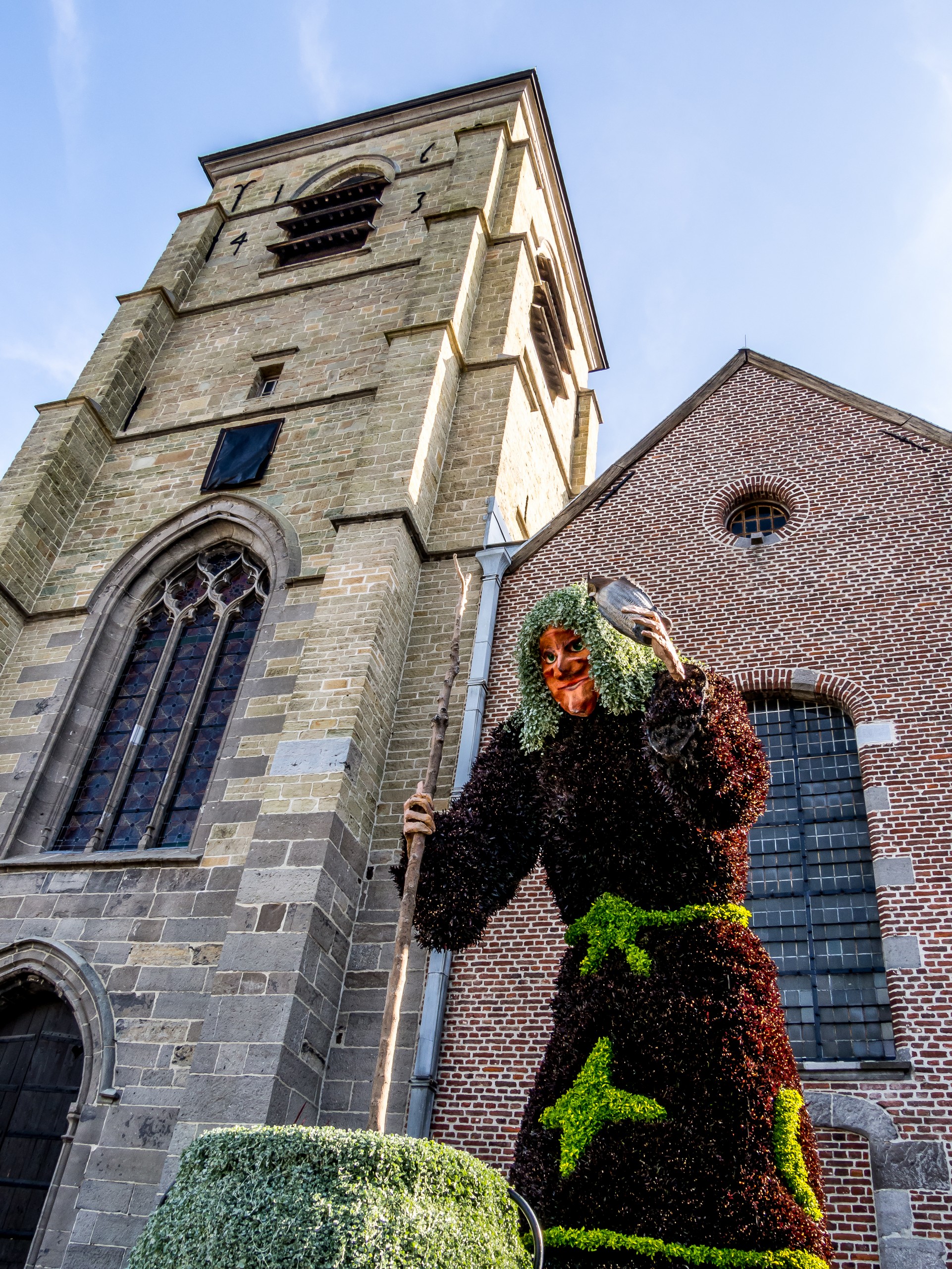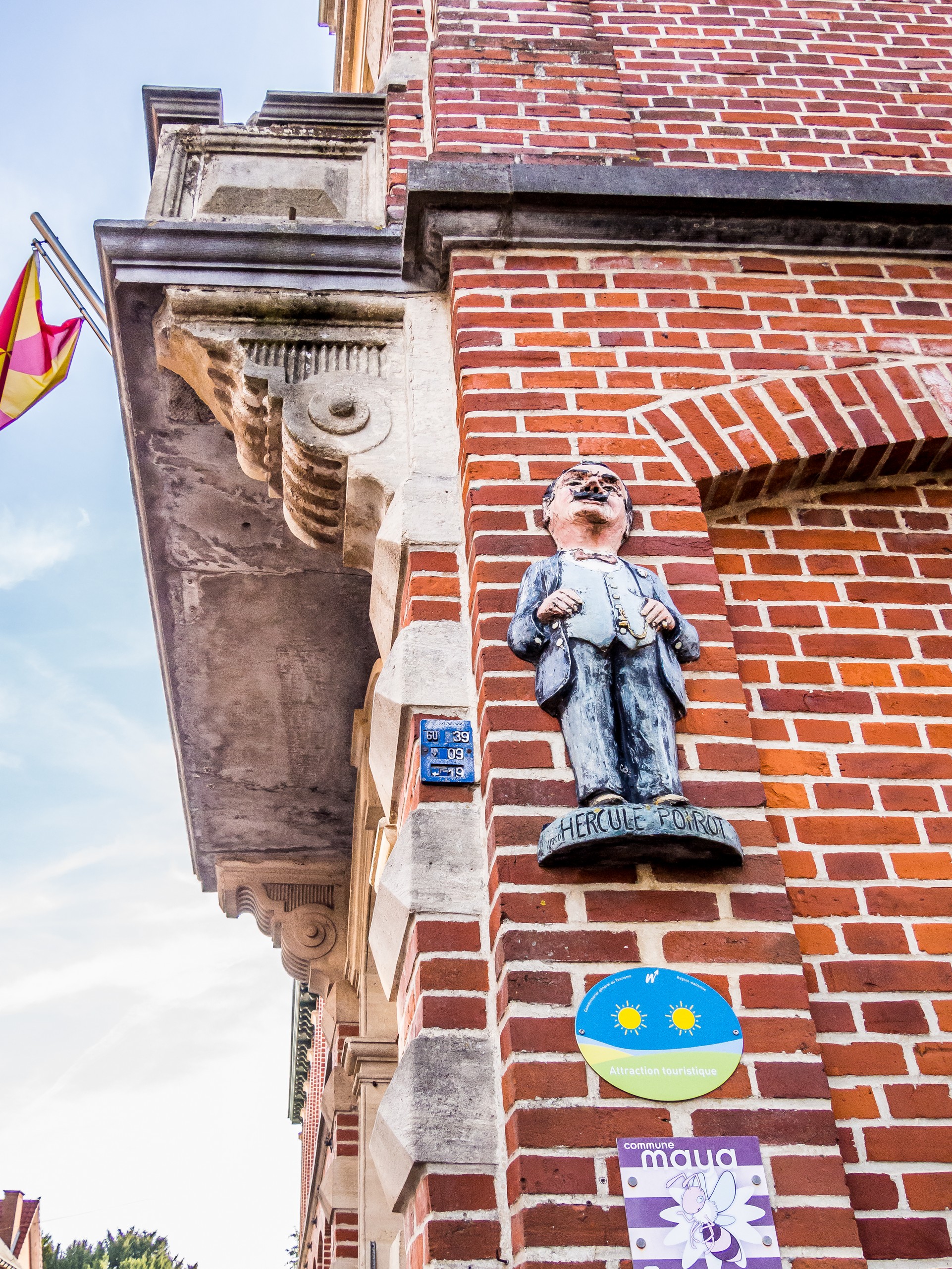 Après avoir dévoré une viennoiserie, nous allons nous promener dans le domaine des sorcières, à Ellezelles. Le paysage ici est vert et vallonné (normal, nous sommes dans le Pays des Collines), parsemé de villages et de hameaux. C’est champêtre et joli mais Ellezelles cache un côté sombre, celui d’abriter la sorcière Quintine et quantité de personnages étranges, à commencer par Hercule Poirot. La légende veut qu’Agatha Christie se soit inspirée d’un réfugié belge de la Première Guerre Mondiale lors de la création de son célèbre détective. Cependant, dans les registres d’état-civil, on trouve à la date du 1er avril 1850 (oui, on sait mais l’anecdote est véritable) la naissance d’un petit garçon prénommé Hercule. Le nom de sa mère ? Van Prei, ce qui signifie en néerlandais « du poireau ». Coïncidence ? Je ne pense pas ! En tout cas, Ellezelles ne le pense pas non plus puisqu’une petite statue orne les murs de la maison du Pays des Collines : mise élégante, bedon en avant et moustache crollée, c’est bien notre détective !