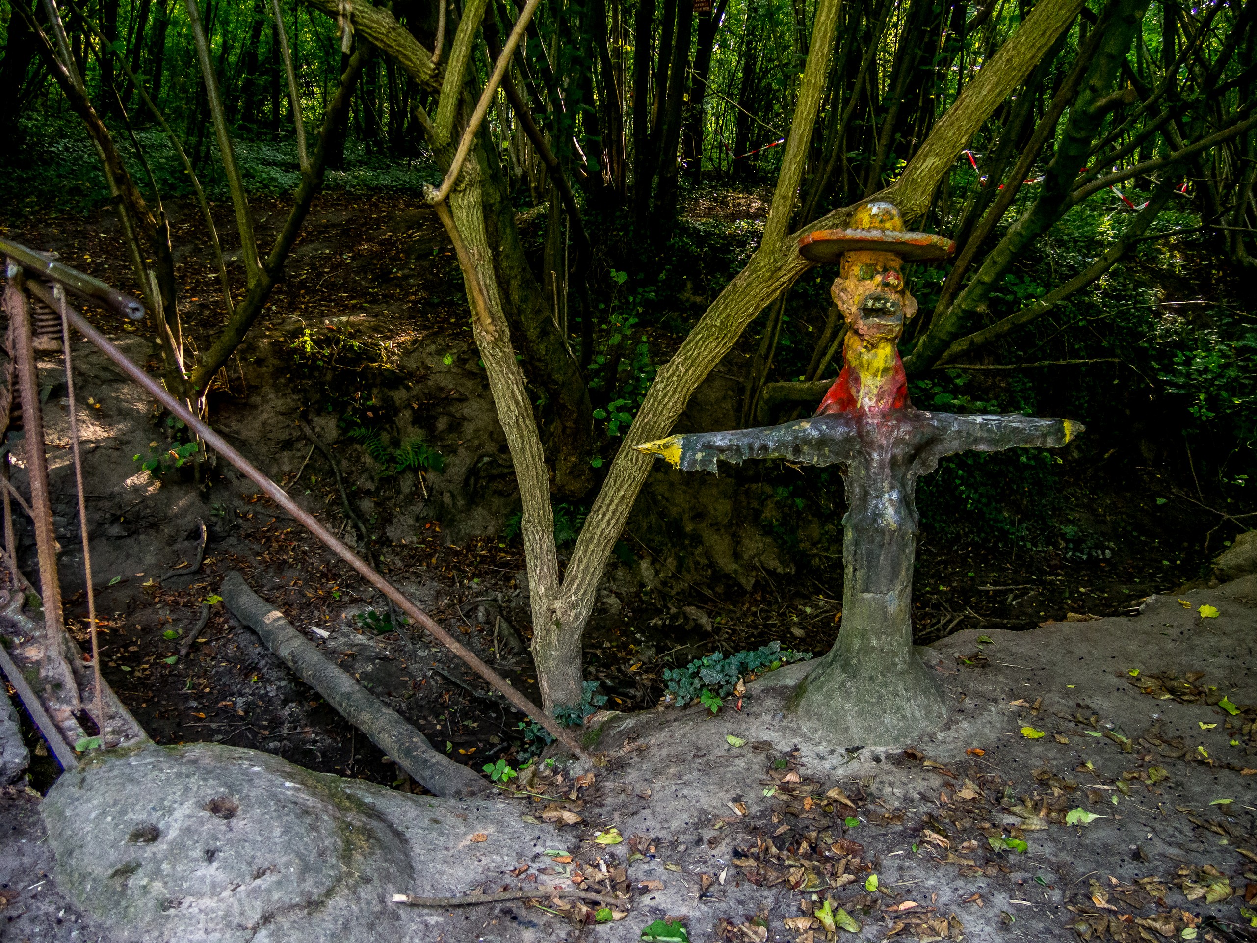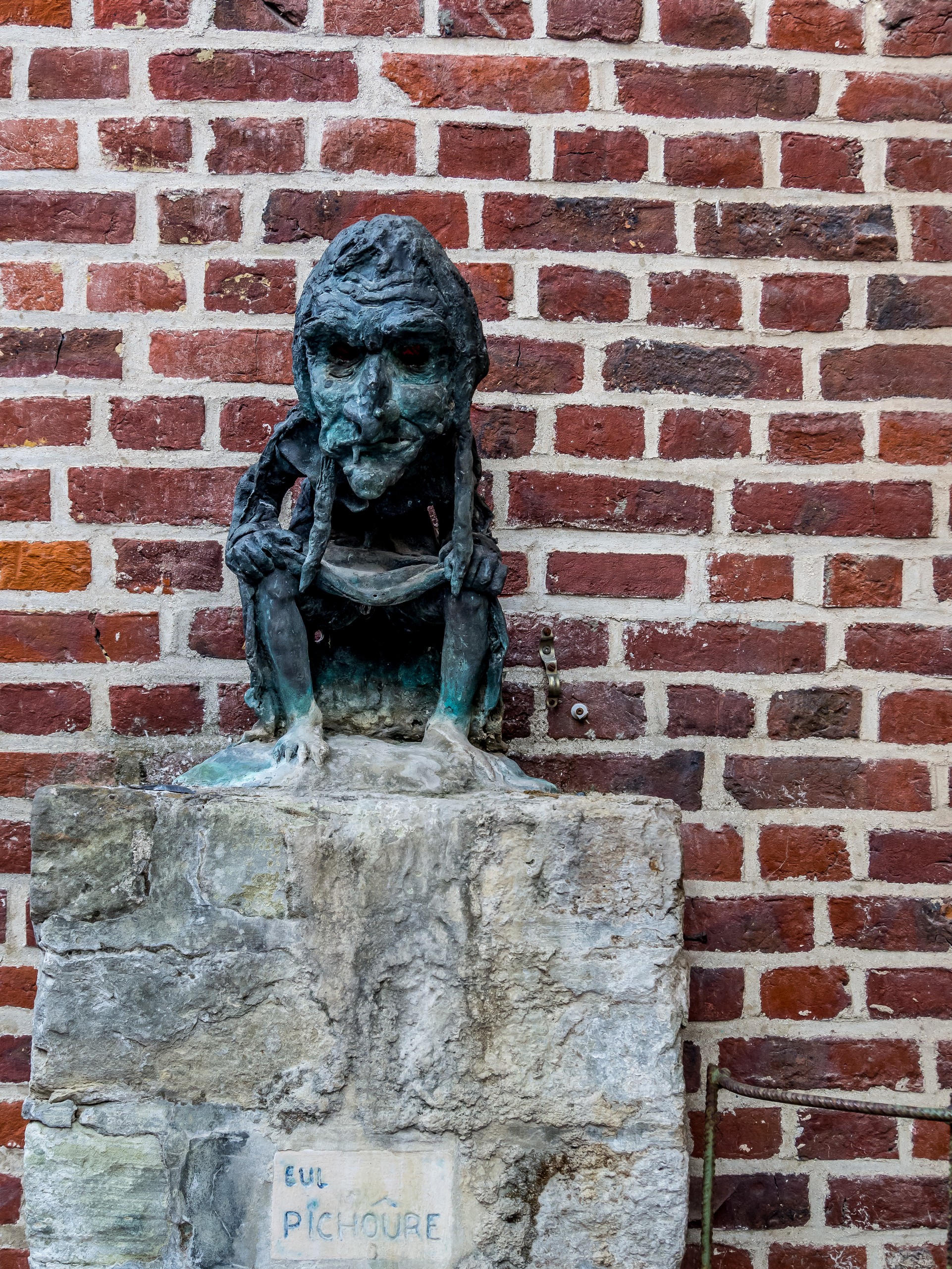 L’autre personnage important d’Ellezelles, c’est Quintine la sorcière. Sous le règne des Archiducs Albert et Isabelle, ce qui était les Pays-Bas espagnols est pris dans une vague de chasses aux sorcières. Ellezelles verra une dizaine d’exécutions de femmes suspectées d’activités diaboliques (évidemment, que des femmes). La plupart sont d’ailleurs plutôt âgées… jusqu’au 26 octobre 1610 où 5 femmes vont être mises à mort, sous l’autorité du bailli de Lessinnes-Flobecq. Parmi elles, une certaine Quintine, âgée de 38 ans. Nous ne connaissons d’elle que son nom mais dès les années 70, elle est devenue la mascotte du village… sans doute grâce à un artiste « folk-art » Jacques Vandewattyne. C’est lui qui décidât de créer le « Sentier de l’étrange », une promenade à travers la campagne Ellezelloise, entre champs, prairies et petits bois, parsemé de sculpture en tout genre : plâtre, assemblage d’objets métalliques, pierres sculptées… avant de revenir au pont de départ. Avant de prendre la route, n’oubliez pas de saluer Quintine et de voir « Eul Pichoure », une sorcière qui se soulage à la vue de tous avec un sourire de satisfaction évident. (comment çà, les Belges font une fixette sur les gens qui pissent ?).