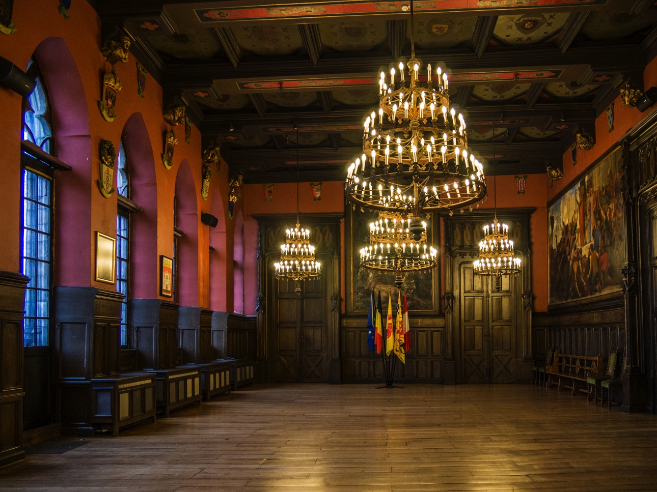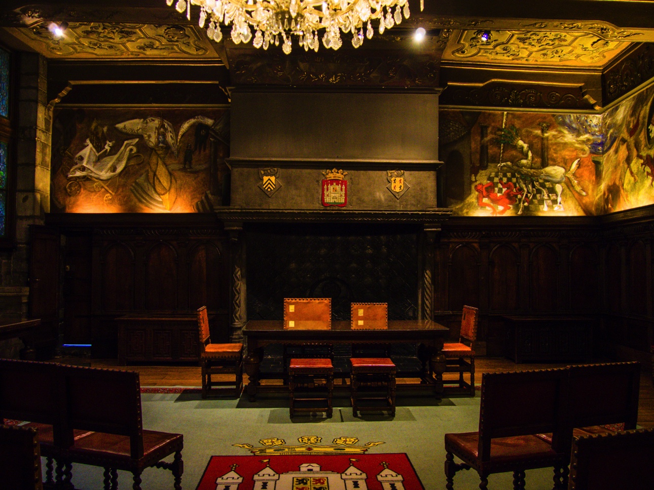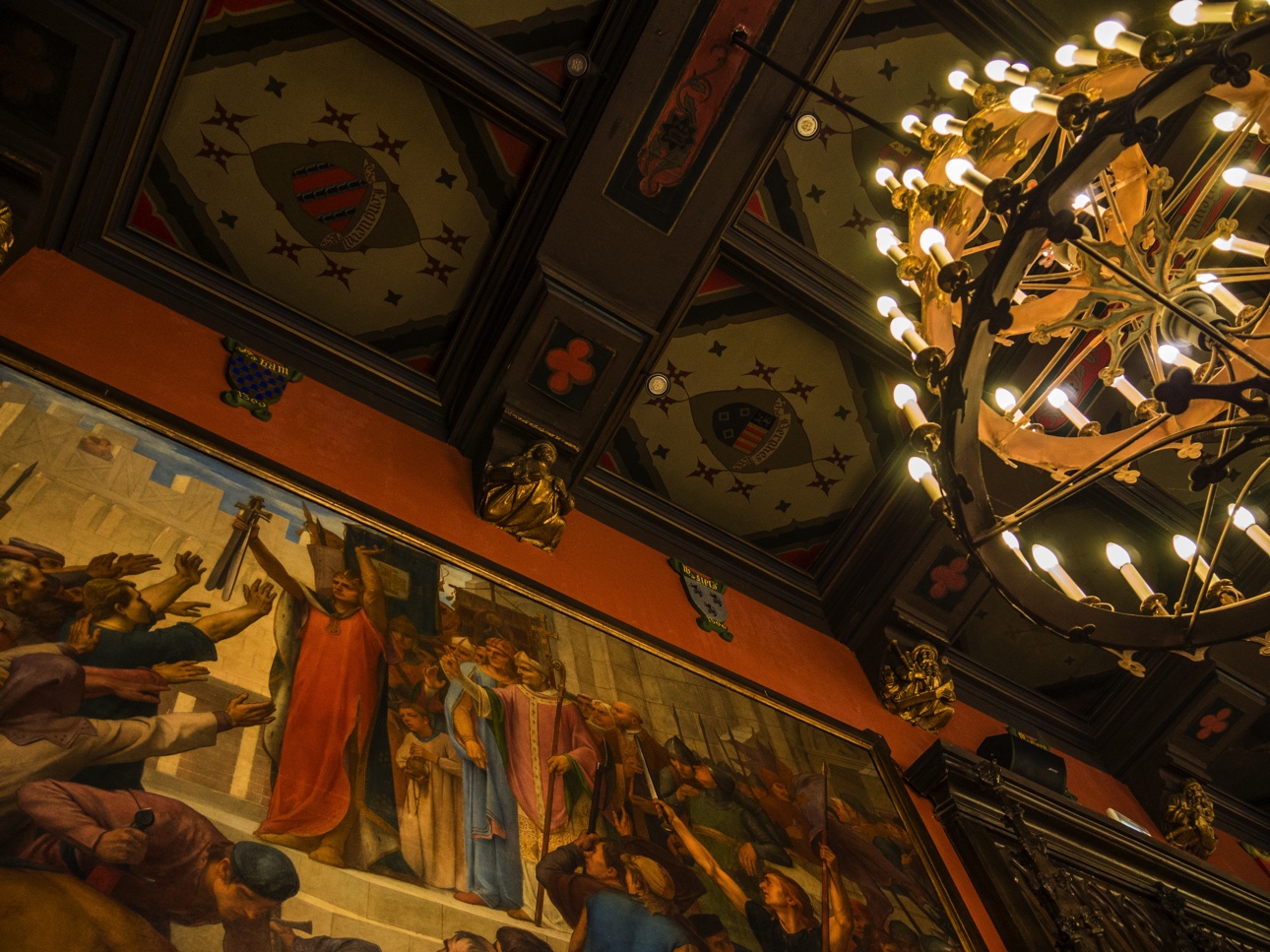 Si vous n’avez pas réservé une visite guidée de l’hôtel de ville avec Visit Mons, vous pourrez au moins voir la Salle de Sacquiaux, et ses sièges de pierre, dans l’embrasure des fenêtres, où les gardes pouvaient garder un oeil sur les allées et venues. Le salon des mariages est aussi un des plus connus. On y sent le côté ancien, le plancher craque, une grande frise reprenant plusieurs évènements historiques de Mons veille sur les futurs mariés. Nous continuons la visite, montant les escaliers, découvrant les magnificences des salles mais la plus belle reste sans aucun doute le salon gothique. Bien qu’il ait été refait au XIXème siècle, il garde toutes les caractéristiques d’une salle médiévale avec ses poutres, ses fenêtres… mais les peintures trahissent la re-décoration. Elle reste néanmoins impressionnante par la taille, par ses fenêtres qui donnent sur la Grand-Place mais aussi par le fait qu’elle donne accès à un balcon. Comme la Grand-Place est remplie par les chalets et animations pour le marché de Noël, la vue n’est pas aussi dégagée qu’il faudrait mais, ça donne une idée du spectacle qui attend celleux qui montent jusqu’ici.