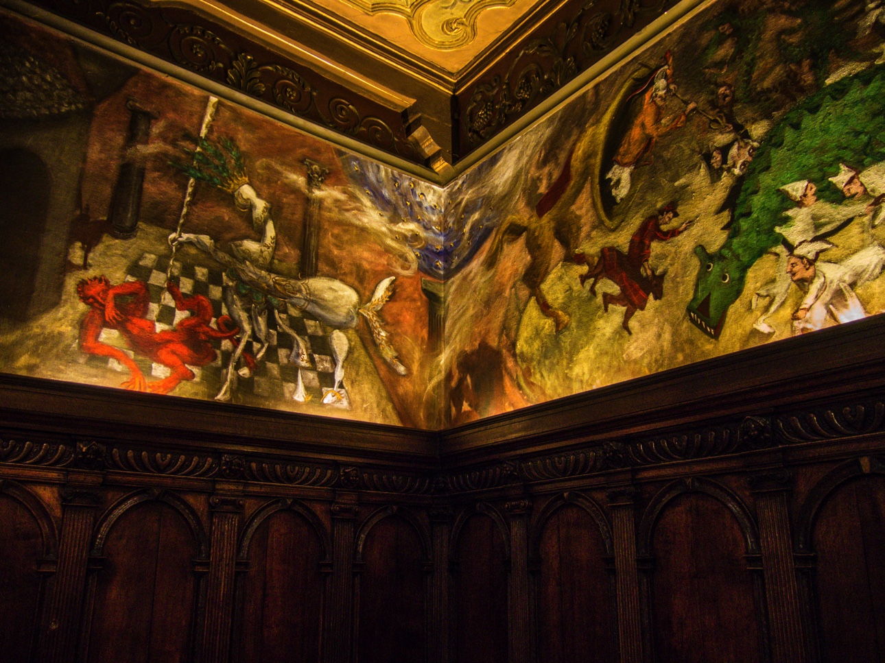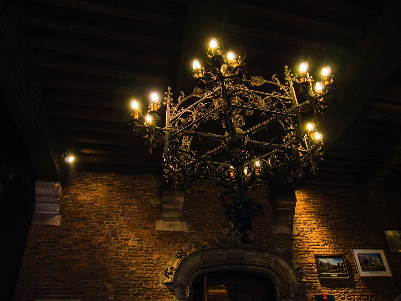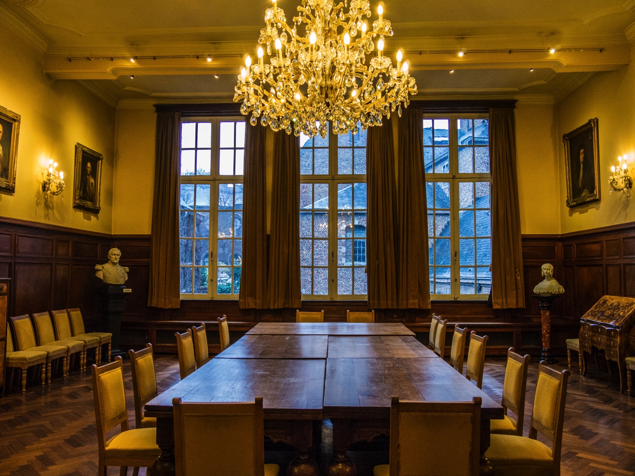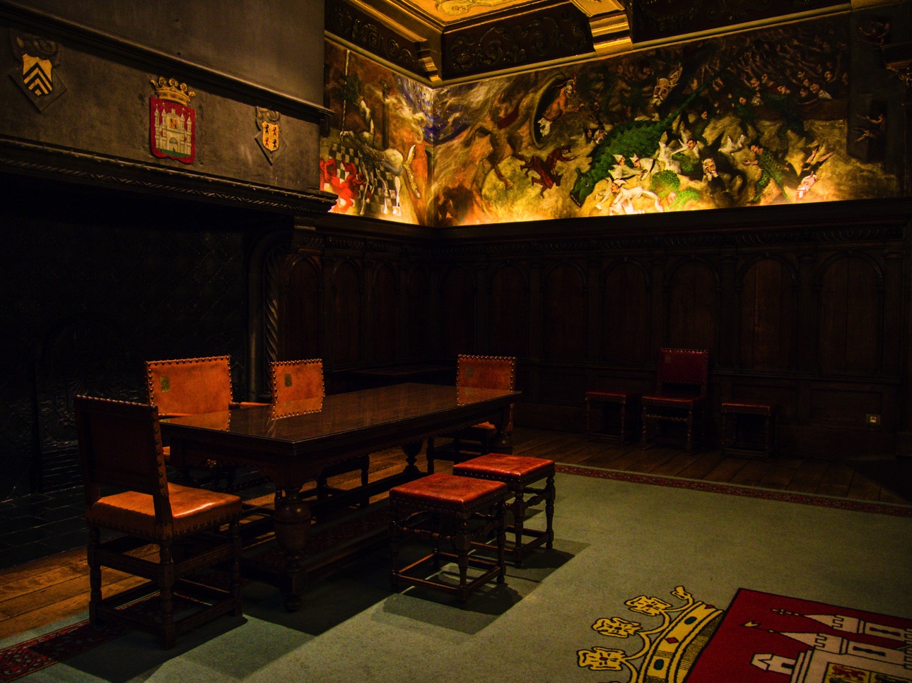 Si vous n’avez pas réservé une visite guidée de l’hôtel de ville avec Visit Mons, vous pourrez au moins voir la Salle de Sacquiaux, et ses sièges de pierre, dans l’embrasure des fenêtres, où les gardes pouvaient garder un oeil sur les allées et venues. Le salon des mariages est aussi un des plus connus. On y sent le côté ancien, le plancher craque, une grande frise reprenant plusieurs évènements historiques de Mons veille sur les futurs mariés. Nous continuons la visite, montant les escaliers, découvrant les magnificences des salles mais la plus belle reste sans aucun doute le salon gothique. Bien qu’il ait été refait au XIXème siècle, il garde toutes les caractéristiques d’une salle médiévale avec ses poutres, ses fenêtres… mais les peintures trahissent la re-décoration. Elle reste néanmoins impressionnante par la taille, par ses fenêtres qui donnent sur la Grand-Place mais aussi par le fait qu’elle donne accès à un balcon. Comme la Grand-Place est remplie par les chalets et animations pour le marché de Noël, la vue n’est pas aussi dégagée qu’il faudrait mais, ça donne une idée du spectacle qui attend celleux qui montent jusqu’ici.