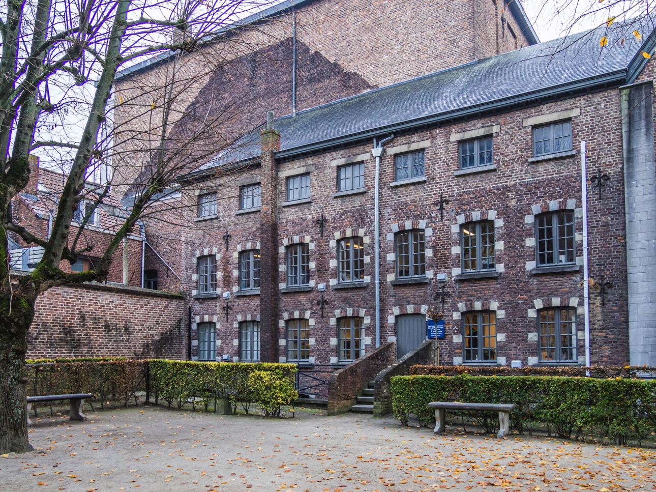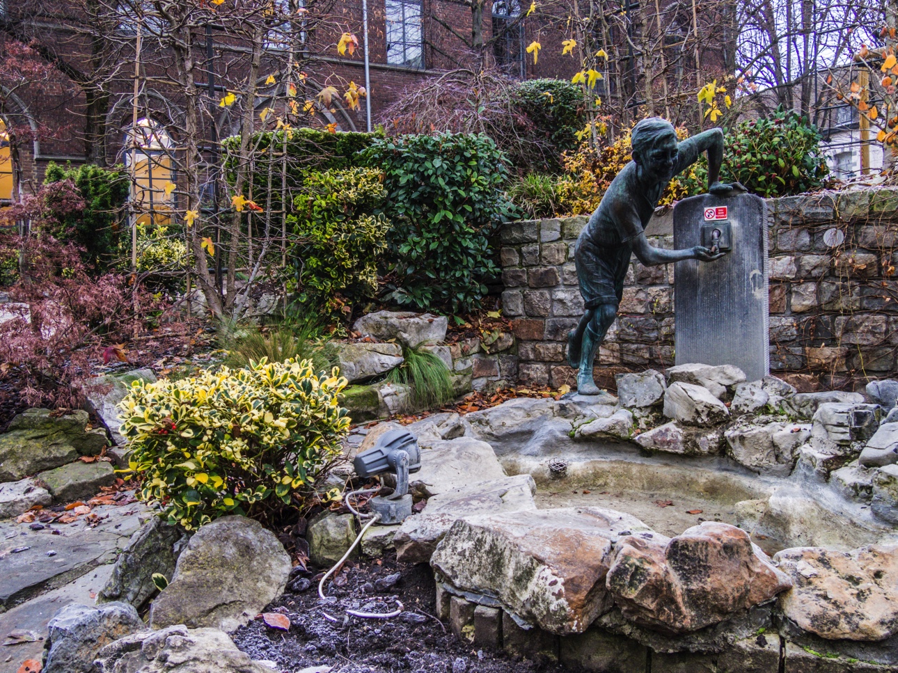 Nous sortons de l’hôtel de ville par le « Jardin du mayeur ». C’était un peu l’ancien potager de l’hôtel de ville qui a été transformé en parc dans les années 30. On prend le temps de saluer « Le Ropieur », la statue d’un gamin espiègle qui éclabousse à la belle saison les passants. Là, il est à court d’eau, il faudra attendre quelques mois pour qu’il reprenne ses farces. Un hêtre pourpre solitaire est le roi du parc et s’étend de toutes ses branches. A partir d’ici, les rues se sont petites, au fur et à mesure que nous montons car « Mons » est située, comme son nom l’indique, sur une colline.