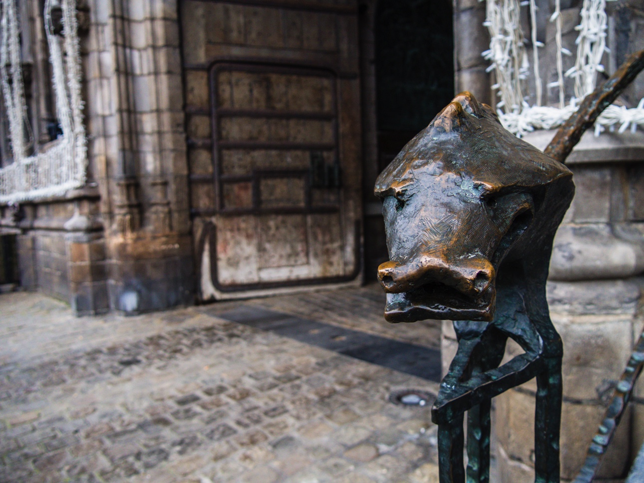 Pour le moment, Bernadette m’emmène à l’intérieur de l’hôtel de ville. Ce bel édifice gothique a été pensé par Mathieu de Layens, le même architecte que l’hôtel de ville de Leuven, est resté inachevé. Il devait y avoir un troisième étage mais après une explosion durant la construction (l’arsenal était à côté), l’argent vint à manquer et l’hôtel de ville dût être fini en l’état. Plus tard, on lui a ajouté une tourelle baroque, qui lui donne son aspect insolite. On peut admirer l’énorme serrure de la grande porte, qui est inspirée des armes de la ville et bien sûr, faire une caresse au singe de la garde. Cette petite mascotte montoise a une longue histoire dont on ne connait pas le début ! Était-ce l’emblème d’un estaminet qui était logé dans les caves de l’hôtel de ville ? Était-ce l’œuvre d’un apprenti de corporation ? Ou un pilori pour enfant ? On ne le saura jamais ! En attendant, son crâne poli atteste du nombre de personnes qui l’on caressé (de la main gauche, attention) pour leur porter chance.