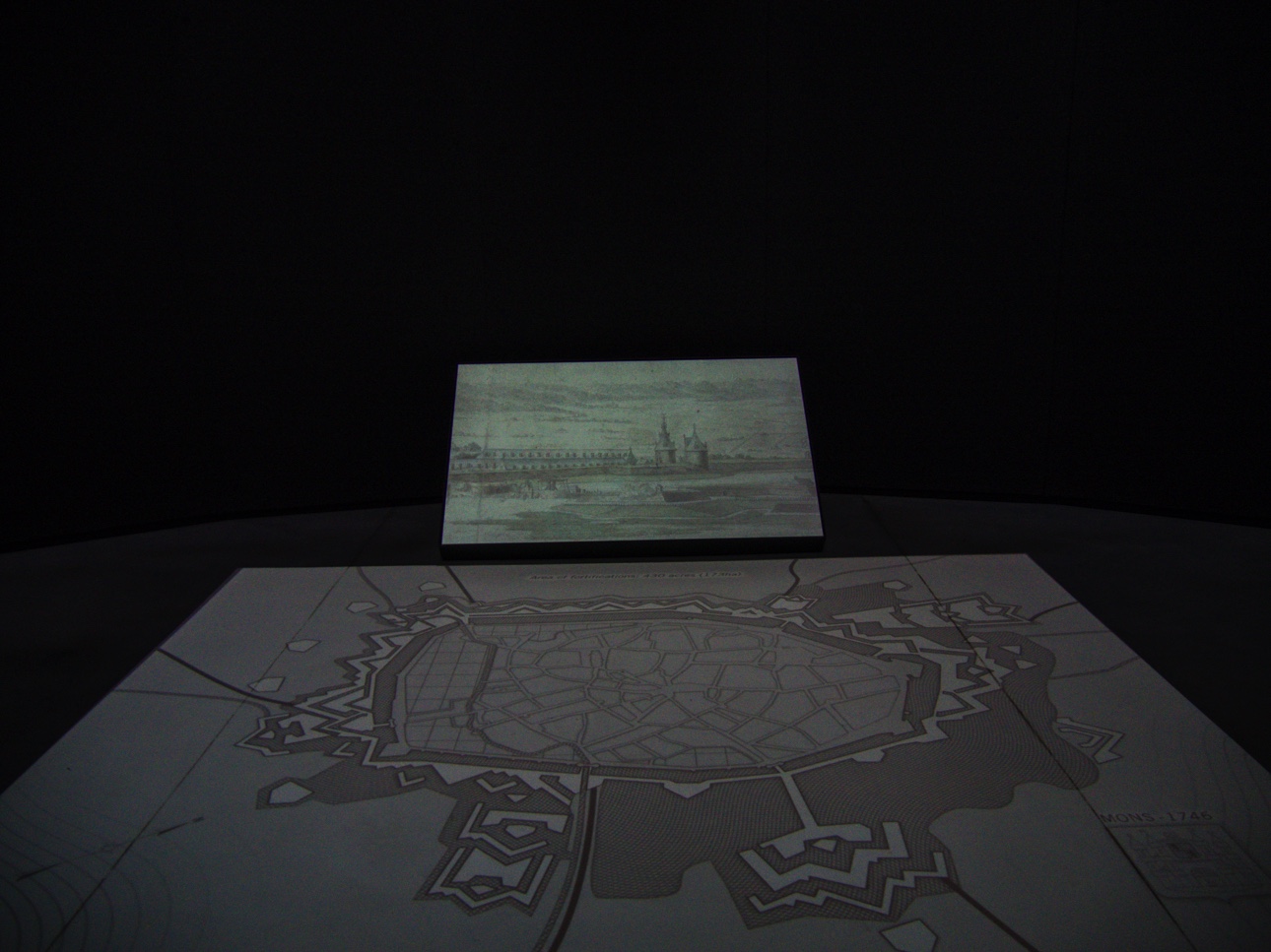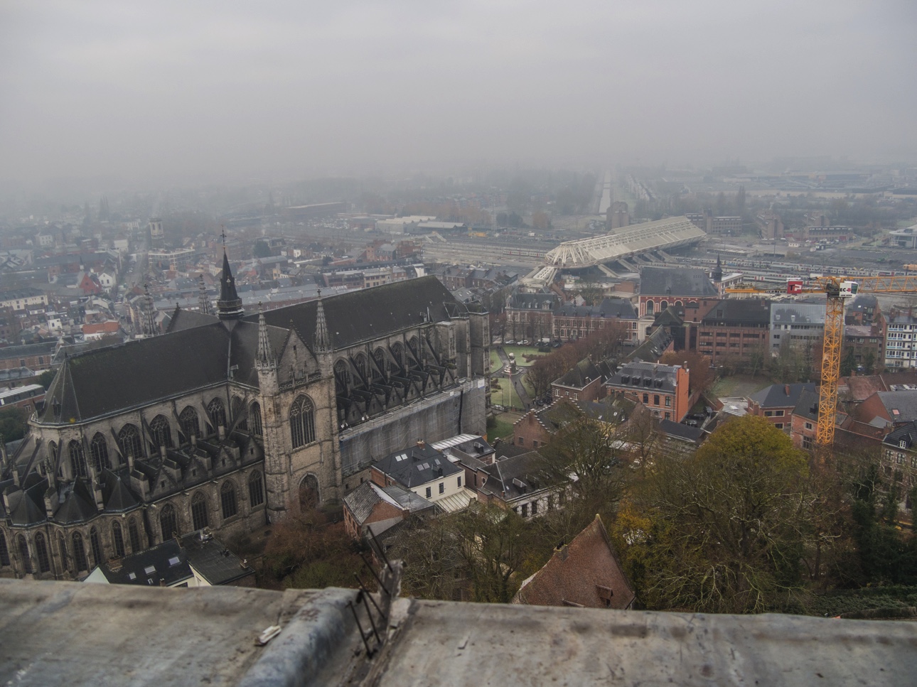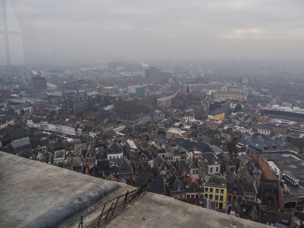 A la sortie de l’ascenseur, la vue est imprenable, à 360 degrés sur tout Mons et sa région : sur les toits tout en bas, plus loin on reconnait la lanterne de l’hôtel de ville, le clocher de l’église Sainte-Elisabeth, plus loin encore, on distingue dans une brume froide la silhouette des terrils. Pour vous aider à vous y retrouver, des écrans tactiles sont là pour vous aider.
