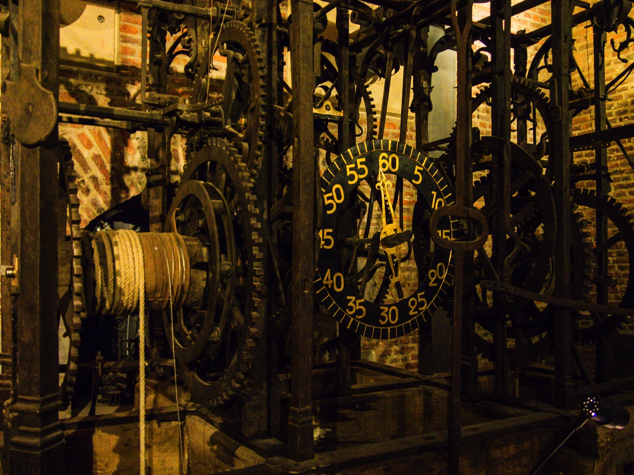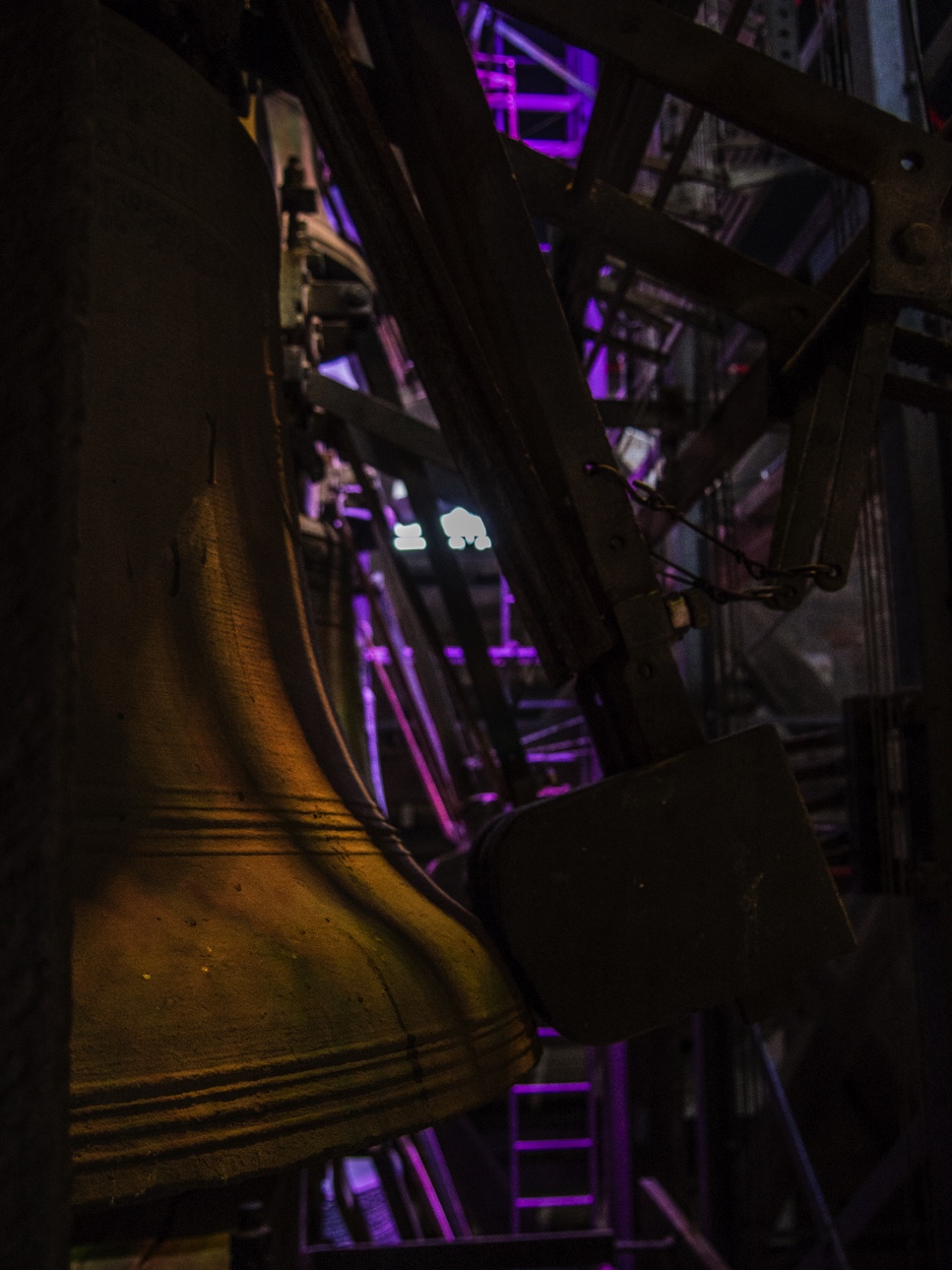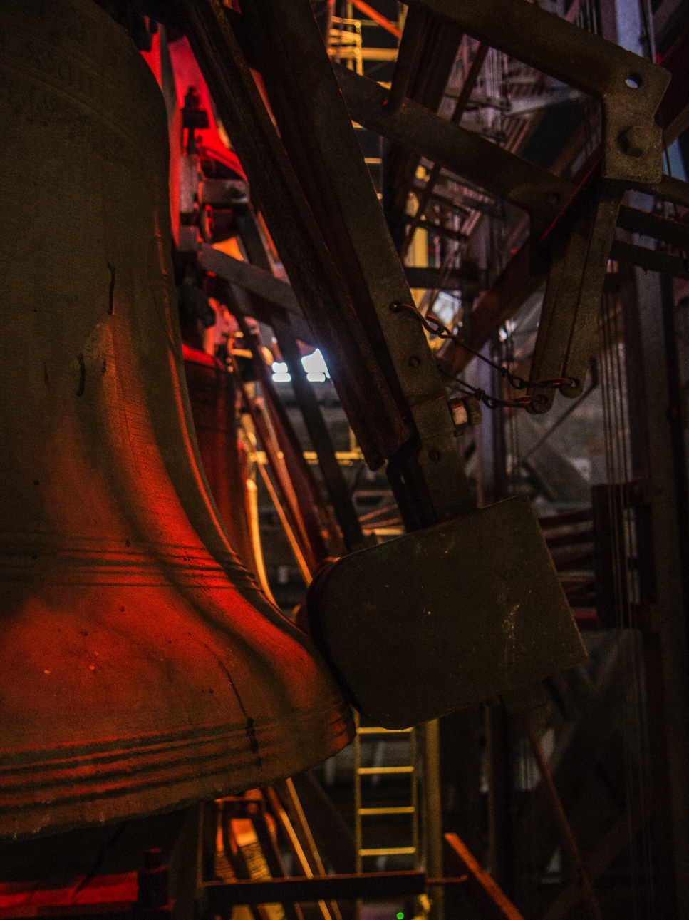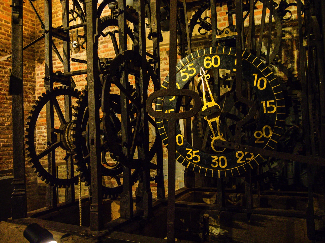 Qui dit beffroi dit « carillon ». Et Mons a même une équipe de carillonneurs. On peut d’ailleurs assister à des concerts mais quand ils ne sont pas là, un mécanisme fait tourner un gros cylindre dentelé comme un boite à musique et qui va actionner les marteaux qui viendront frapper les cloches, et il n’y en a pas moins de 49, de toutes les tailles. Cette partie est accessible via des escaliers.